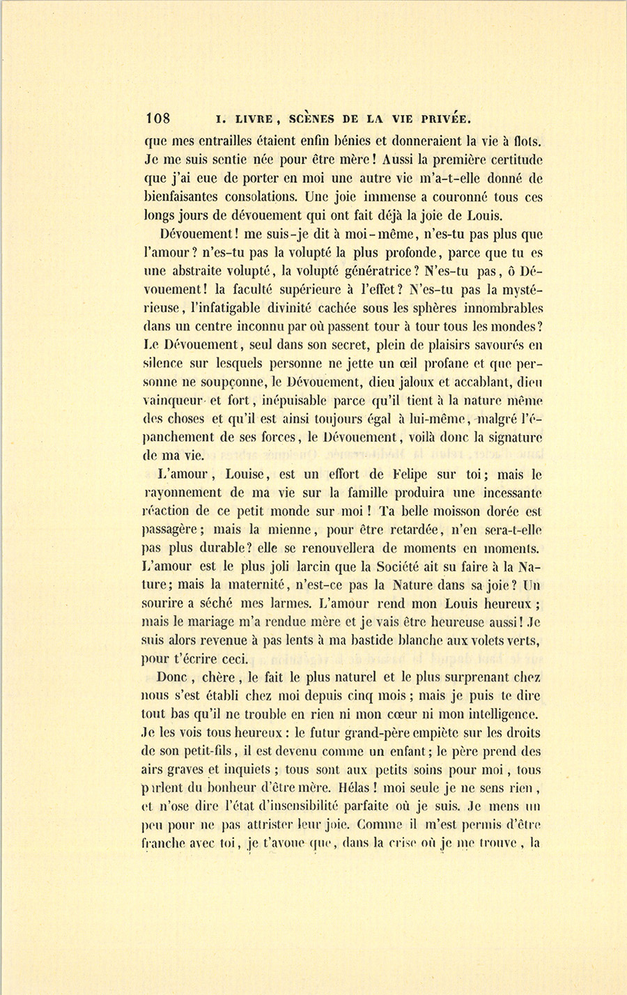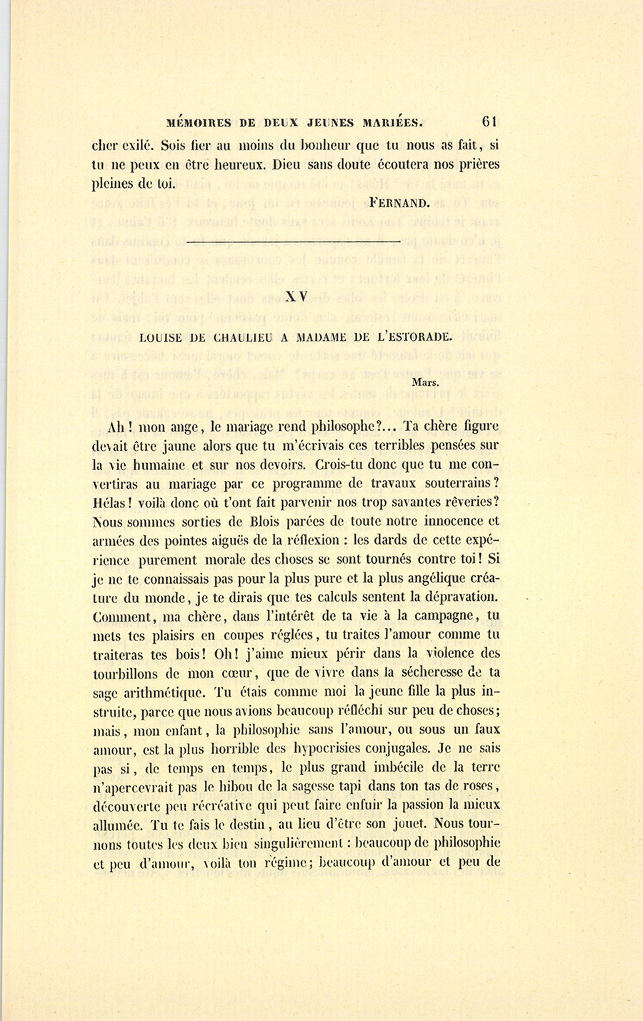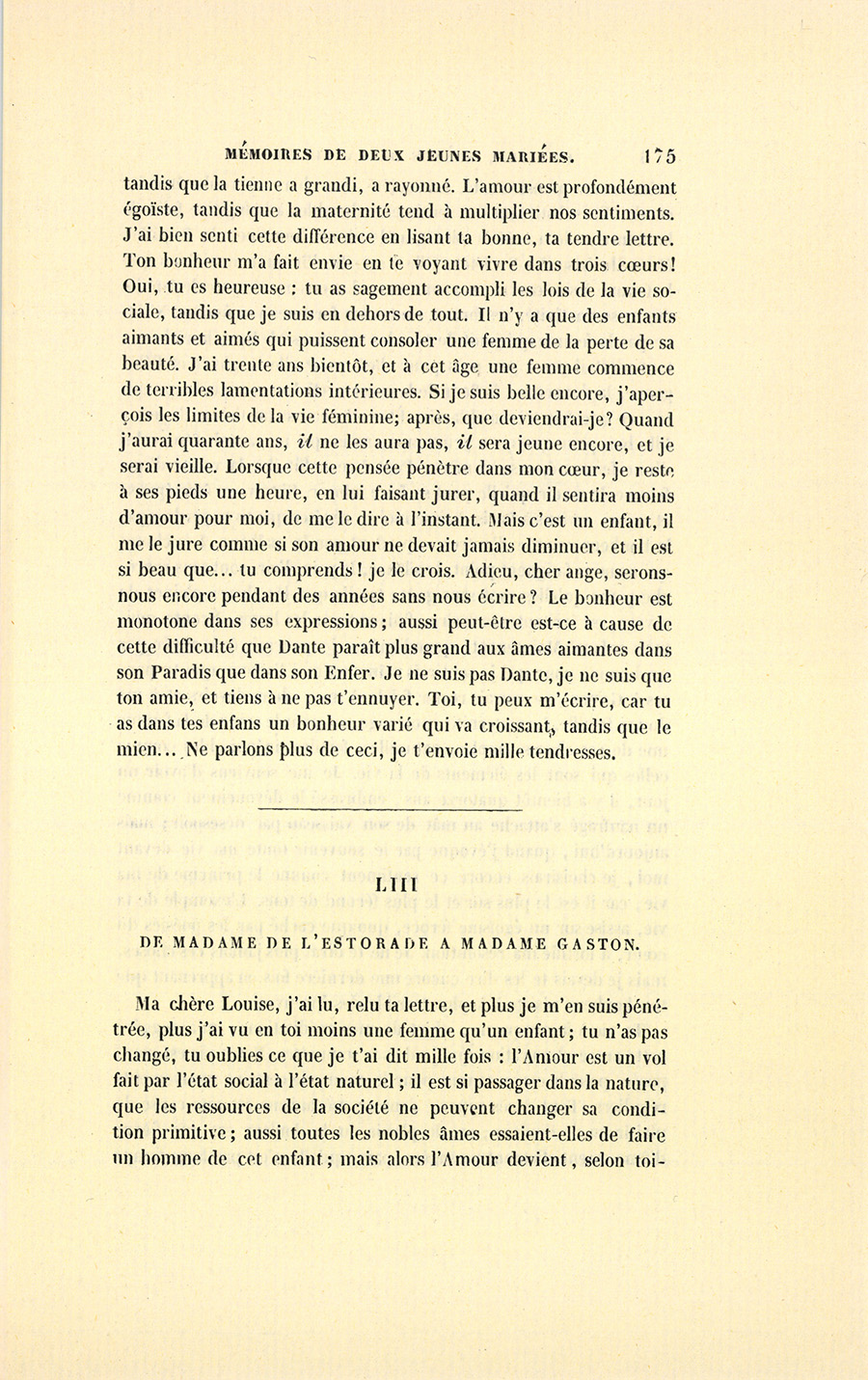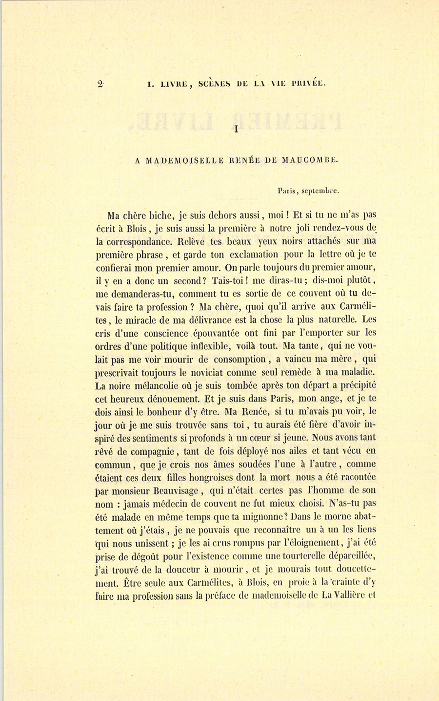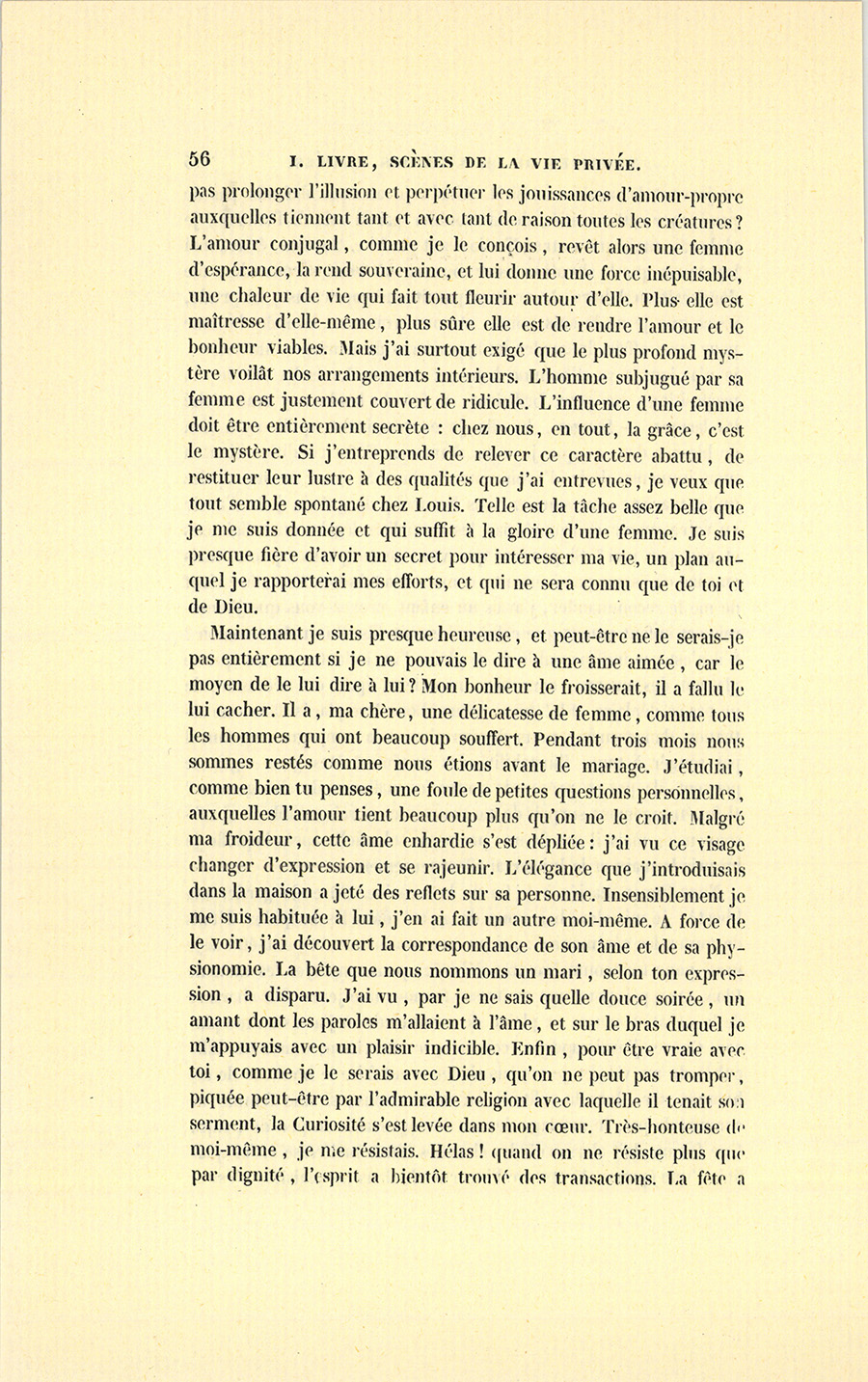 Ma chère Louise, avant de t’écrire, j’ai dû attendre ; mais maintenant je sais bien des choses, ou, pour mieux dire, je les ai apprises, et je dois te les dire pour ton bonheur à venir. Il y a tant de différence entre une jeune fille et une femme mariée, que la jeune fille ne peut pas plus la concevoir que la femme mariée ne {p. 53} peut redevenir jeune fille. J’ai mieux aimé être mariée à Louis de l’Estorade que de retourner au couvent. Voilà qui est clair. Après avoir deviné que si je n’épousais pas Louis je retournerais au couvent, j’ai dû, en termes de jeune fille, me résigner. Résignée, je me suis mise à examiner ma situation afin d’en tirer le meilleur parti possible.