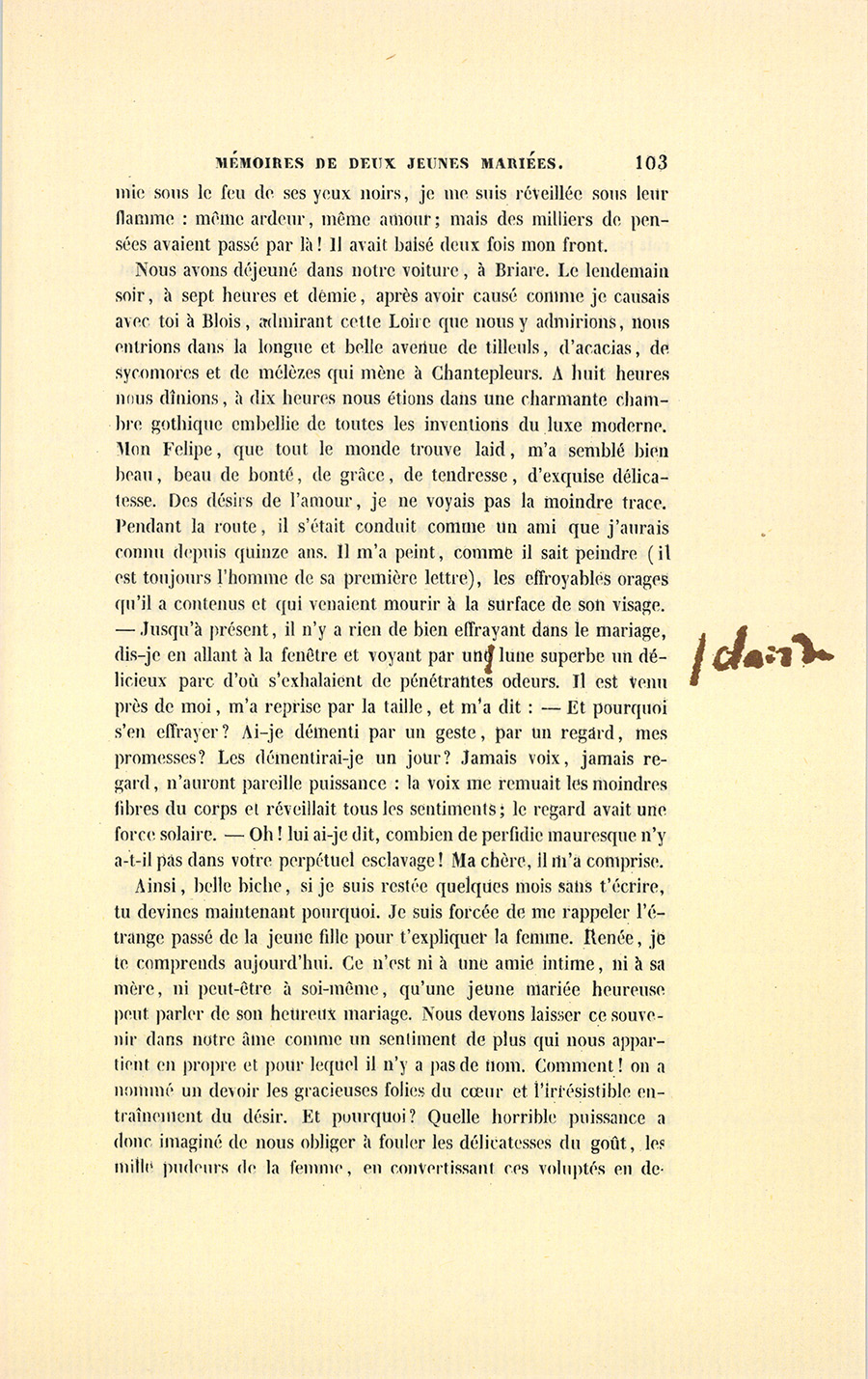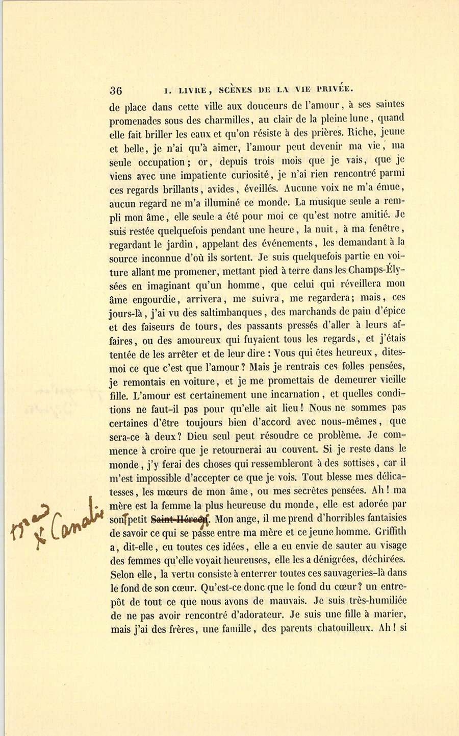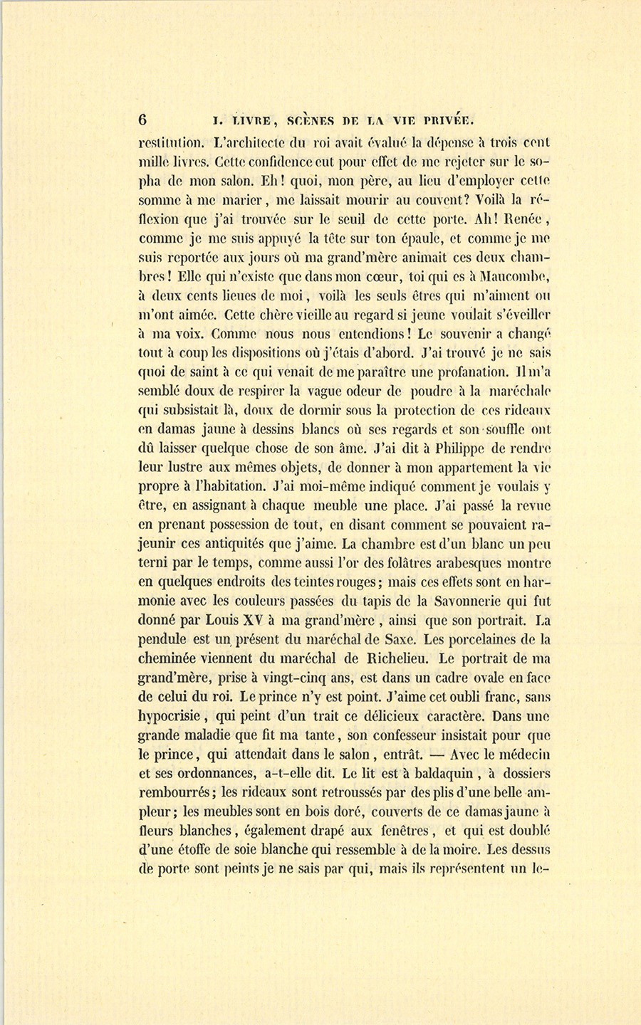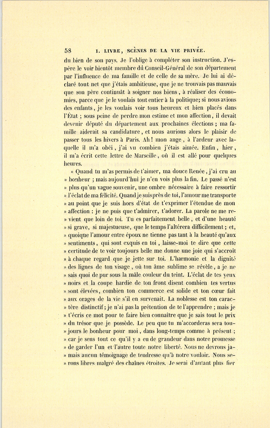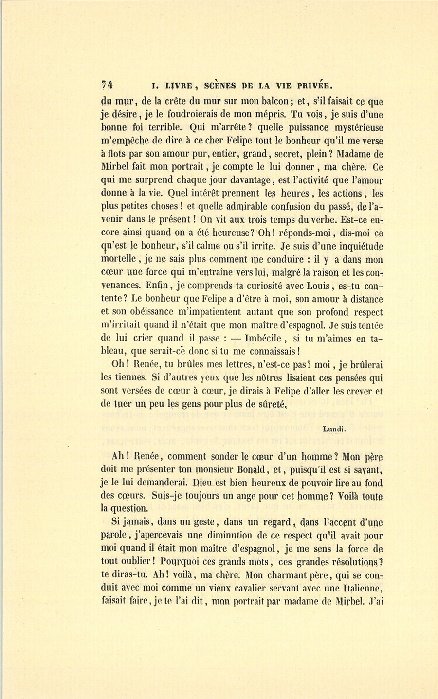 Ma chère Louise, avant de t’écrire, j’ai dû attendre ; mais maintenant je sais bien des choses, ou, pour mieux dire, je les ai apprises, et je dois te les dire pour ton bonheur à venir. Il y a tant de différence entre une jeune fille et une femme mariée, que la jeune fille ne peut pas plus la concevoir que la femme mariée ne {p. 53} peut redevenir jeune fille. J’ai mieux aimé être mariée à Louis de l’Estorade que de retourner au couvent. Voilà qui est clair. Après avoir deviné que si je n’épousais pas Louis je retournerais au couvent, j’ai dû, en termes de jeune fille, me résigner. Résignée, je me suis mise à examiner ma situation afin d’en tirer le meilleur parti possible.