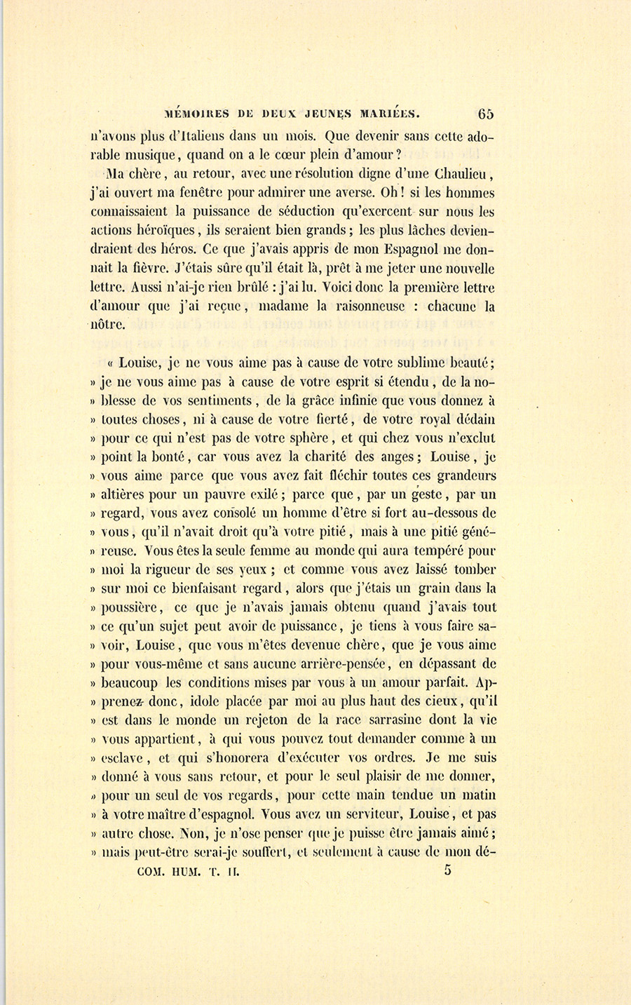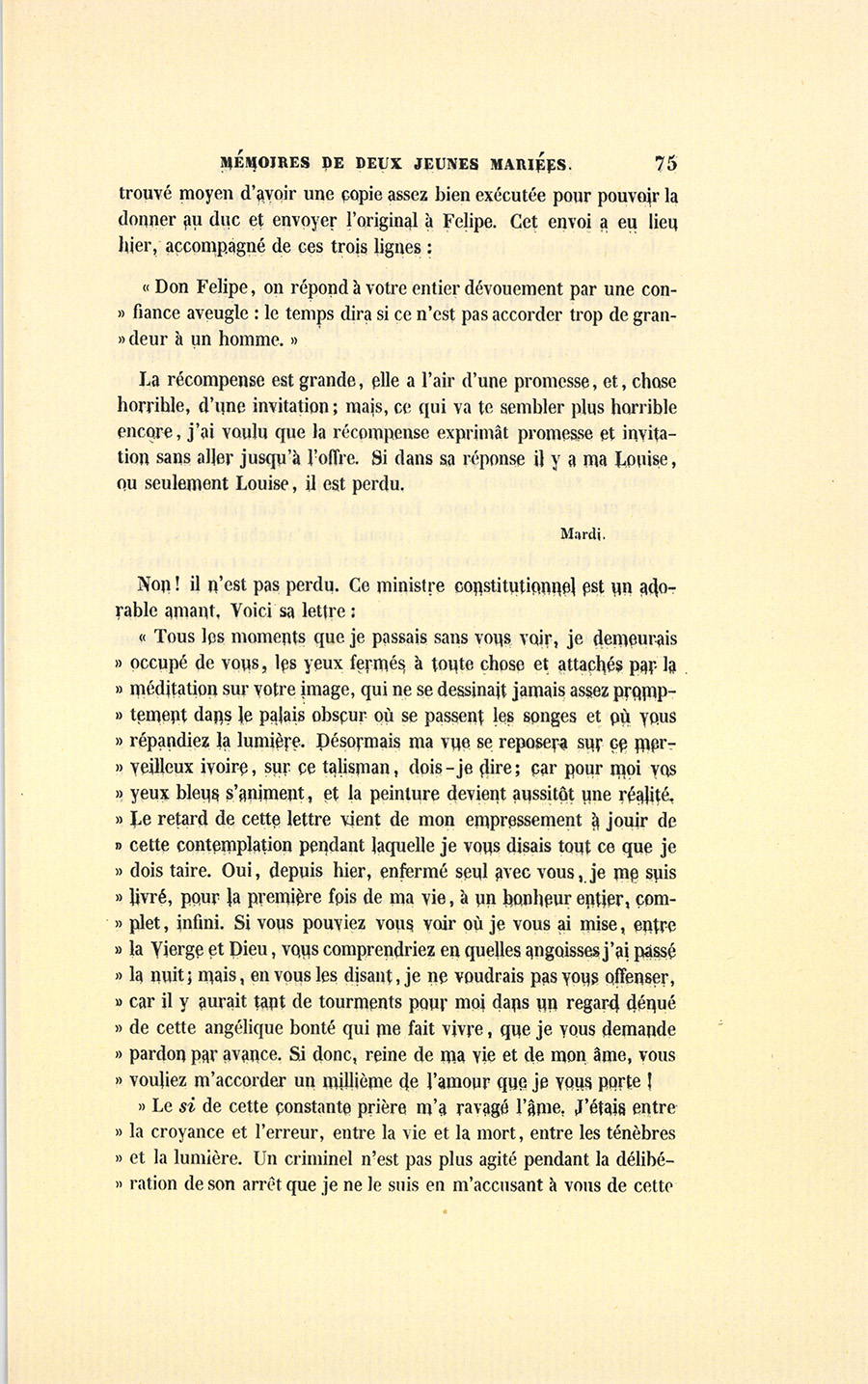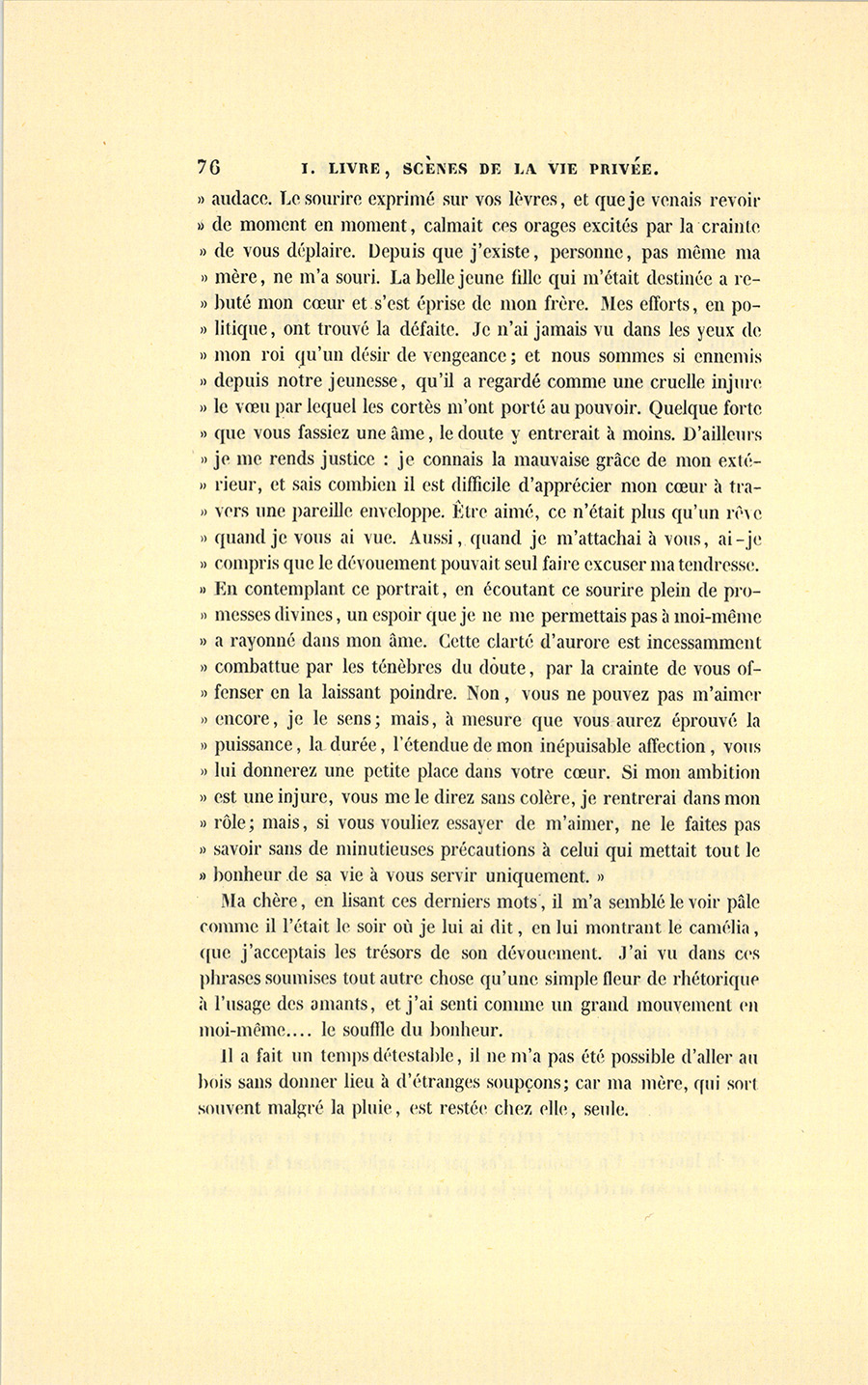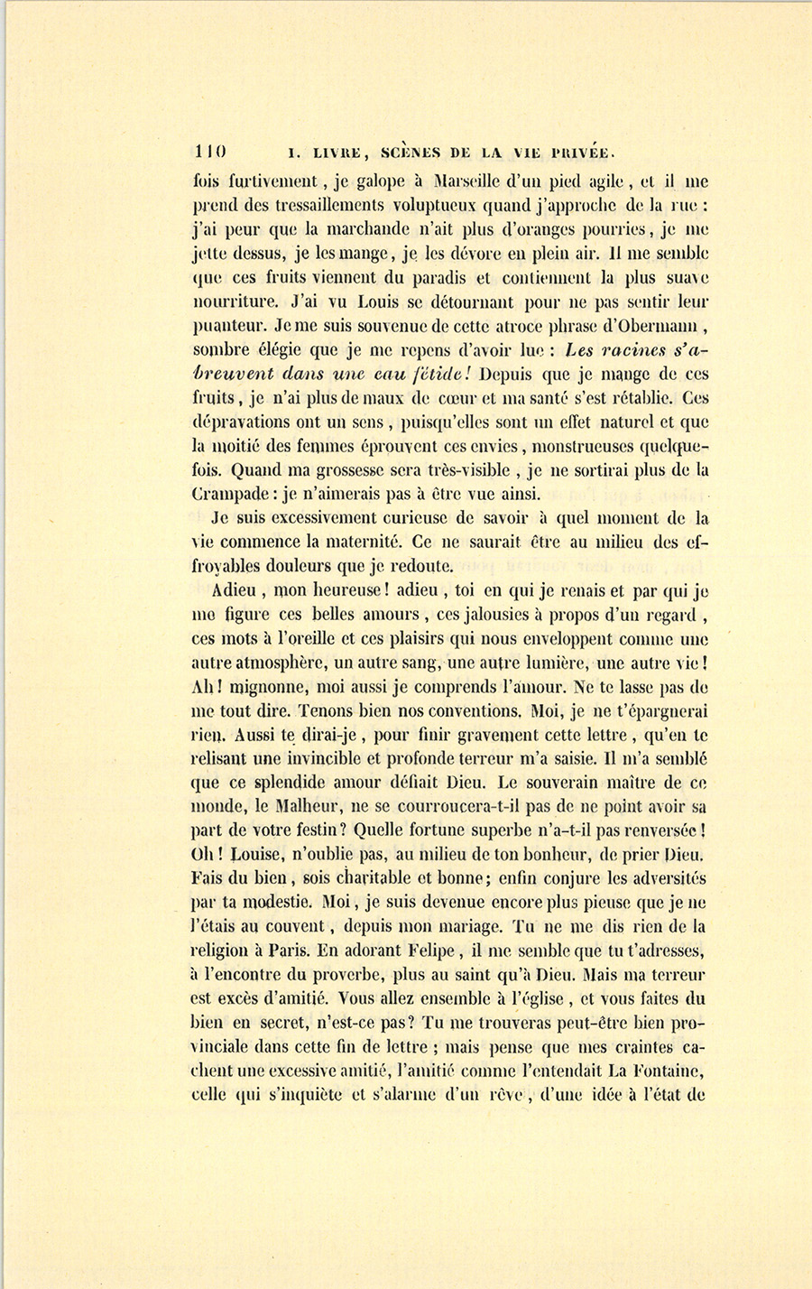 {p. 52} Ceci, ma chère madame de l’Estorade, s’est passé depuis quinze jours, et voilà quinze jours que je n’ai vu cet homme qui m’aime, car cet homme m’aime. Que fait-il ? Je voudrais être mouche, souris, moineau. Je voudrais pouvoir le voir, seul, chez lui, sans qu’il m’aperçût. Nous avons un homme à qui je puis dire : Allez mourir pour moi !… Et il est de caractère à y aller, je le crois du moins. Enfin, il y a dans Paris un homme à qui je pense, et dont le regard m’inonde intérieurement de lumière. Oh ! c’est un ennemi que je dois fouler aux pieds. Comment, il y aurait un homme sans lequel je ne pourrais vivre, qui me serait nécessaire ! Tu te maries et j’aime ! Au bout de quatre mois, ces deux colombes qui s’élevaient si haut sont tombées dans les marais de la réalité.