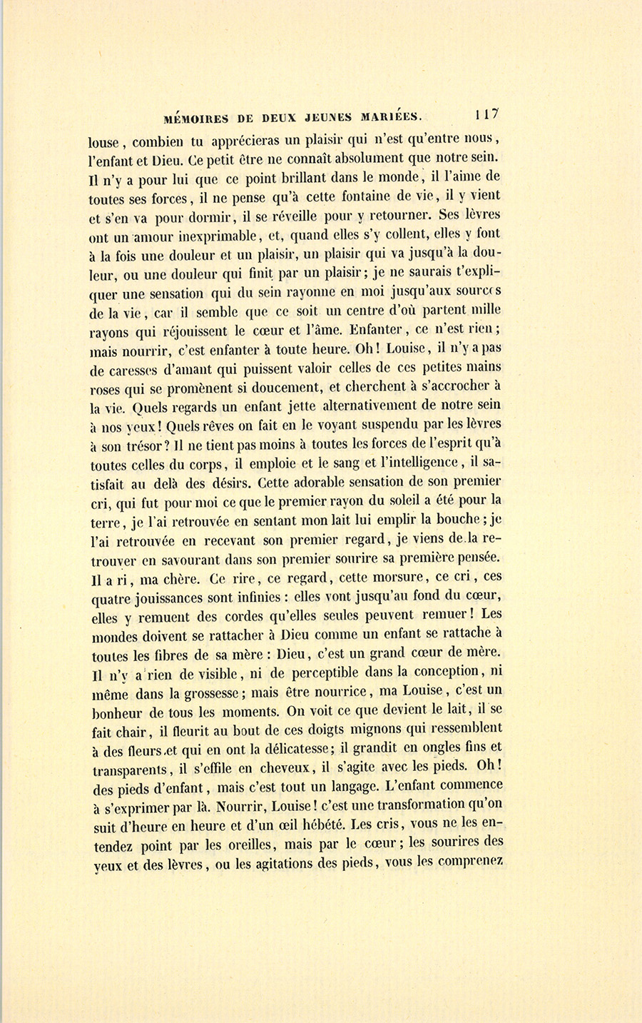 Ta vie à la campagne, objet de mes méditations, m’a suggéré cette autre observation que je dois te soumettre. Notre vie est composée, pour le corps comme pour le cœur, de certains mouvements réguliers. Tout excès apporté dans ce mécanisme est une cause de plaisir ou de douleur ; or, le plaisir ou la douleur est une fièvre d’âme essentiellement passagère, parce qu’elle n’est pas long-temps {p. 177} supportable. Faire de l’excès sa vie même, n’est-ce pas vivre malade ! Tu vis malade, en maintenant à l’état de passion un sentiment qui doit devenir dans le mariage une force égale et pure. Oui, mon ange, aujourd’hui je le reconnais : la gloire du ménage est précisément dans ce calme, dans cette profonde connaissance mutuelle, dans cet échange de biens et de maux que les plaisanteries vulgaires lui reprochent. Oh ! combien il est grand ce mot de la duchesse de Sully, la femme du grand Sully enfin, à qui l’on disait que son mari, quelque grave qu’il parût, ne se faisait pas scrupule d’avoir une maîtresse : – C’est tout simple, a-t-elle répondu, je suis l’honneur de la maison, et serais fort chagrine d’y jouer le rôle d’une courtisane. Plus voluptueuse que tendre, tu veux être et la femme et la maîtresse. Avec l’âme d’Héloïse et les sens de sainte Thérèse, tu te livres à des égarements sanctionnés par les lois ; en un mot, tu dépraves l’institution du mariage. Oui, toi qui me jugeais si sévèrement quand je paraissais immorale en acceptant, dès la veille de mon mariage, les moyens du bonheur ; en pliant tout à ton usage, tu mérites aujourd’hui les reproches que tu m’adressais. Eh ! quoi, tu veux asservir et la nature et la société à ton caprice ? Tu restes toi-même, tu ne te transformes point en ce que doit être une femme ; tu gardes les volontés, les exigences de la jeune fille, et tu portes dans ta passion les calculs les plus exacts, les plus mercantiles ; ne vends-tu pas très-cher tes parures ? Je te trouve bien défiante avec toutes tes précautions. Oh ! chère Louise, si tu pouvais connaître les douceurs du travail que les mères font sur elles-mêmes pour être bonnes et tendres à toute leur famille ! L’indépendance et la fierté de mon caractère se sont fondues dans une mélancolie douce, et que les plaisirs maternels ont dissipée en la récompensant. Si la matinée fut difficile, le soir sera pur et serein. J’ai peur que ce soit tout le contraire pour ta vie.