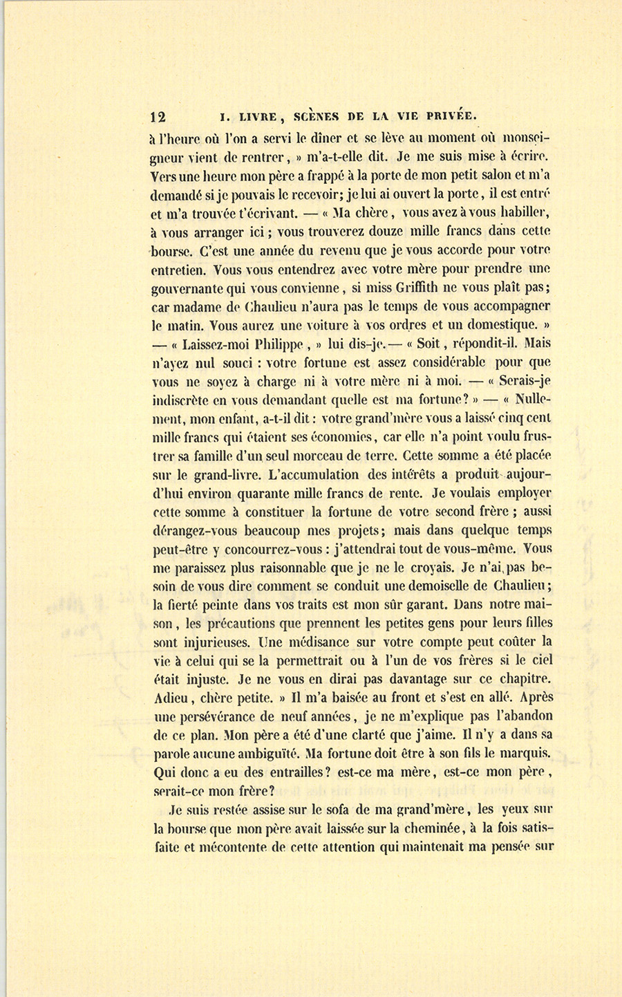 Le lendemain j’ai trouvé mon appartement mis en ordre et fait par le vieux Philippe, qui avait mis des fleurs dans les cornets. Enfin je me suis installée. Seulement personne n’avait songé qu’une pensionnaire des Carmélites a faim de bonne heure, et Rose a eu mille peines à me faire déjeuner. – « Mademoiselle s’est couchée {p. 12} à l’heure où l’on a servi le dîner et se lève au moment où monseigneur vient de rentrer », m’a-t-elle dit. Je me suis mise à écrire. Vers une heure mon père a frappé à la porte de mon petit salon et m’a demandé si je pouvais le recevoir ; je lui ai ouvert la porte, il est entré et m’a trouvée t’écrivant. – « Ma chère, vous avez à vous habiller, à vous arranger ici ; vous trouverez douze mille francs dans cette bourse. C’est une année du revenu que je vous accorde pour votre entretien. Vous vous entendrez avec votre mère pour prendre une gouvernante qui vous convienne, si miss Griffith ne vous plaît pas ; car madame de Chaulieu n’aura pas le temps de vous accompagner le matin. Vous aurez une voiture à vos ordres et un domestique. » – « Laissez-moi Philippe », lui dis-je. – « Soit, répondit-il. Mais n’ayez nul souci : votre fortune est assez considérable pour que vous ne soyez à charge ni à votre mère ni à moi. » – « Serais-je indiscrète en vous demandant quelle est ma fortune ? » – « Nullement, mon enfant, a-t-il dit : votre grand’mère vous a laissé cinq cent mille francs qui étaient ses économies, car elle n’a point voulu frustrer sa famille d’un seul morceau de terre. Cette somme a été placée sur le grand-livre. L’accumulation des intérêts a produit aujourd’hui environ quarante mille francs de rente. Je voulais employer cette somme à constituer la fortune de votre second frère ; aussi dérangez-vous beaucoup mes projets ; mais dans quelque temps peut-être y concourrez-vous : j’attendrai tout de vous-même. Vous me paraissez plus raisonnable que je ne le croyais. Je n’ai pas besoin de vous dire comment se conduit une demoiselle de Chaulieu ; la fierté peinte dans vos traits est mon sûr garant. Dans notre maison, les précautions que prennent les petites gens pour leurs filles sont injurieuses. Une médisance sur votre compte peut coûter la vie à celui qui se la permettrait ou à l’un de vos frères si le ciel était injuste. Je ne vous en dirai pas davantage sur ce chapitre. Adieu, chère petite. » Il m’a baisée au front et s’est en allé. Après une persévérance de neuf années, je ne m’explique pas l’abandon de ce plan. Mon père a été d’une clarté que j’aime. Il n’y a dans sa parole aucune ambiguïté. Ma fortune doit être à son fils le marquis. Qui donc a eu des entrailles ? est-ce ma mère, est-ce mon père, serait-ce mon frère ?