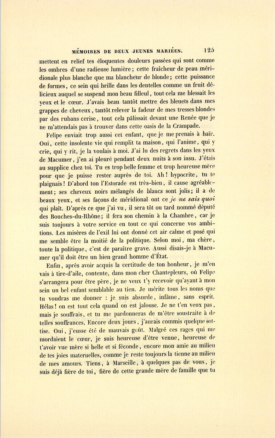 Voilà donc mes cheveux noirs, mes yeux noirs dont les cils se déplient, selon toi, comme des jalousies, mon air impérial et ma personne élevée à l’état de pouvoir souverain. Nous verrons dans dix ans d’ici, ma chère, si nous ne sommes pas toutes deux bien rieuses, bien heureuses dans ce Paris, d’où je te ramènerai quelquefois dans ma belle oasis de Provence. Ô Louise, ne compromets pas notre bel avenir à toutes deux ! Ne fais pas les folies dont tu {p. 60} me menaces. J’épouse un vieux jeune homme, épouse quelque jeune vieillard de la chambre des pairs. Tu es là dans le vrai.