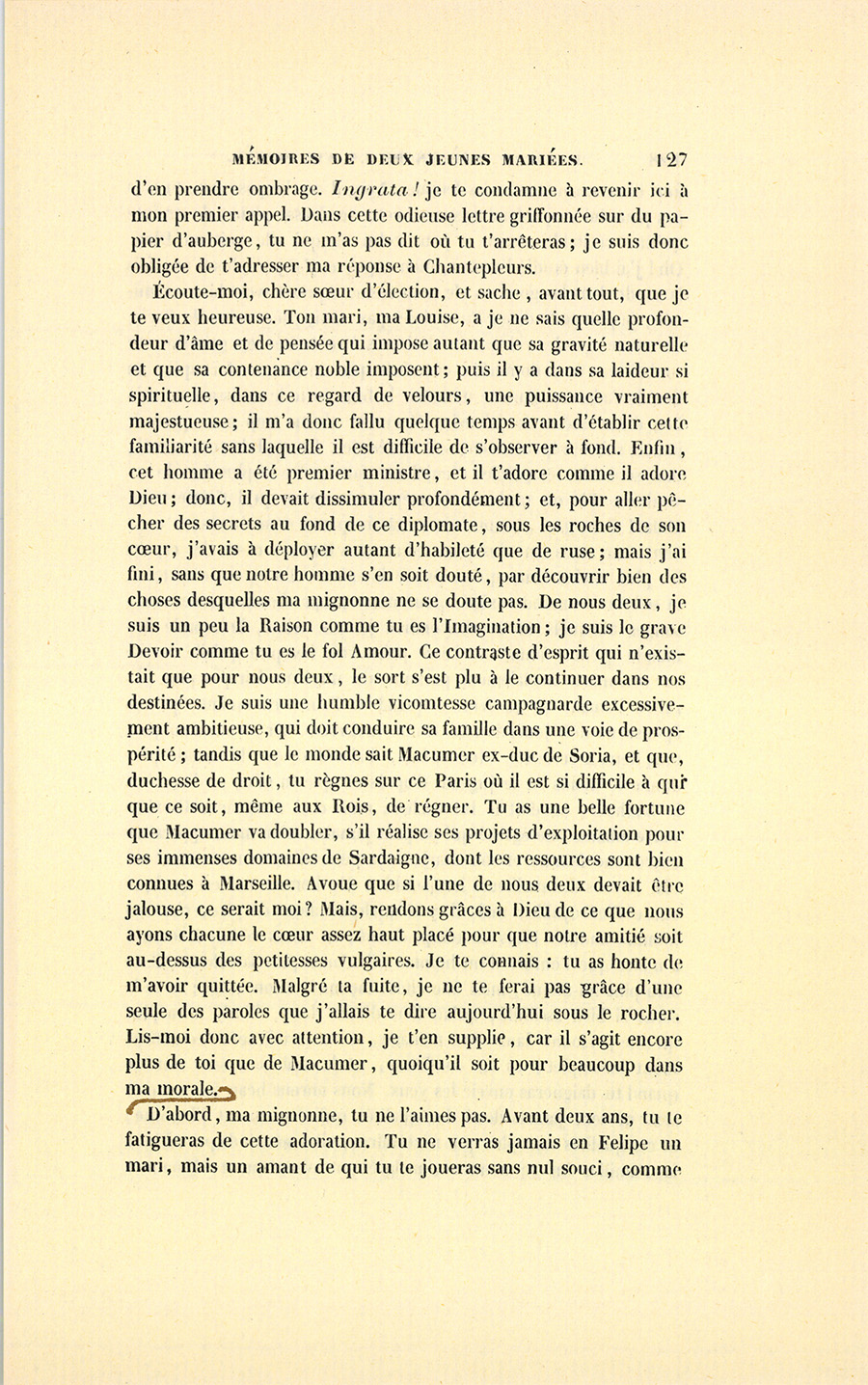 Mais la France me retrancherait alors tout au plus la moitié de {p. 154} mon revenu ; je serais encore aussi riche que je l’étais avant mon placement ; puis, d’ici la catastrophe, j’aurai touché le double de mon revenu antérieur. La catastrophe n’arrive que de siècle en siècle, on a donc le temps de se faire un capital en économisant. Enfin le comte de l’Estorade n’est-il pas pair de la France semi-républicaine de Juillet ? n’est-il pas un des soutiens de la couronne offerte par le peuple au roi des Français ? puis-je avoir des inquiétudes en ayant pour ami un président de chambre à la cour des comptes, un grand financier ? Ose dire que je suis folle ! Je calcule presque aussi bien que ton roi-citoyen. Sais-tu ce qui peut donner cette sagesse algébrique à une femme ? l’amour ! Hélas ! le moment est venu de t’expliquer les mystères de ma conduite, dont les raisons fuyaient ta perspicacité, ta tendresse curieuse et ta finesse. Je me marie dans un village auprès de Paris, secrètement. J’aime, je suis aimée. J’aime autant qu’une femme qui sait bien ce qu’est l’amour peut aimer. Je suis aimée autant qu’un homme doit aimer la femme par laquelle il est adoré. Pardonne-moi, Renée, de m’être cachée de toi, de tout le monde. Si ta Louise trompe tous les regards, déjoue toutes les curiosités, avoue que ma passion pour mon pauvre Macumer exigeait cette tromperie. L’Estorade et toi, vous m’eussiez assassinée de doutes, étourdie de remontrances. Les circonstances auraient pu d’ailleurs vous venir en aide. Toi seule sais à quel point je suis jalouse, et tu m’aurais inutilement tourmentée. Ce que tu vas nommer ma folie, ma Renée, je l’ai voulu faire à moi seule, à ma tête, à mon cœur, en jeune fille qui trompe la surveillance de ses parents. Mon amant a pour toute fortune trente mille francs de dettes que j’ai payées. Quel sujet d’observations ! Vous auriez voulu me prouver que Gaston est un intrigant, et ton mari eût espionné ce cher enfant. J’ai mieux aimé l’étudier moi-même. Voici vingt-deux mois qu’il me fait la cour ; j’ai vingt-sept ans, il en a vingt-trois. D’une femme à un homme, cette différence d’âge est énorme. Autre source de malheurs ! Enfin, il est poète, et vivait de son travail ; c’est te dire assez qu’il vivait de fort peu de chose. Ce cher lézard de poète était plus souvent au soleil à bâtir des châteaux en Espagne qu’à l’ombre de son taudis à travailler des poèmes. Or, les écrivains, les artistes, tous ceux qui n’existent que par la pensée, sont assez généralement taxés d’inconstance par les gens positifs. Ils épousent et conçoivent tant de caprices, qu’il est naturel de croire que la tête réagisse sur le cœur. Malgré les dettes payées, malgré la {p. 155} différence d’âge, malgré la poésie, après neuf mois d’une noble défense et sans lui avoir permis de baiser ma main, après les plus chastes et les plus délicieuses amours, dans quelques jours, je ne me livre pas, comme il y a huit ans, inexpériente, ignorante et curieuse ; je me donne, et suis attendue avec une si grande soumission, que je pourrais ajourner mon mariage à un an ; mais il n’y a pas la moindre servilité dans ceci : il y a servage et non soumission. Jamais il ne s’est rencontré de plus noble cœur, ni plus d’esprit dans la tendresse, ni plus d’âme dans l’amour que chez mon prétendu. Hélas ! mon ange, il a de qui tenir ! Tu vas savoir son histoire en deux mots.