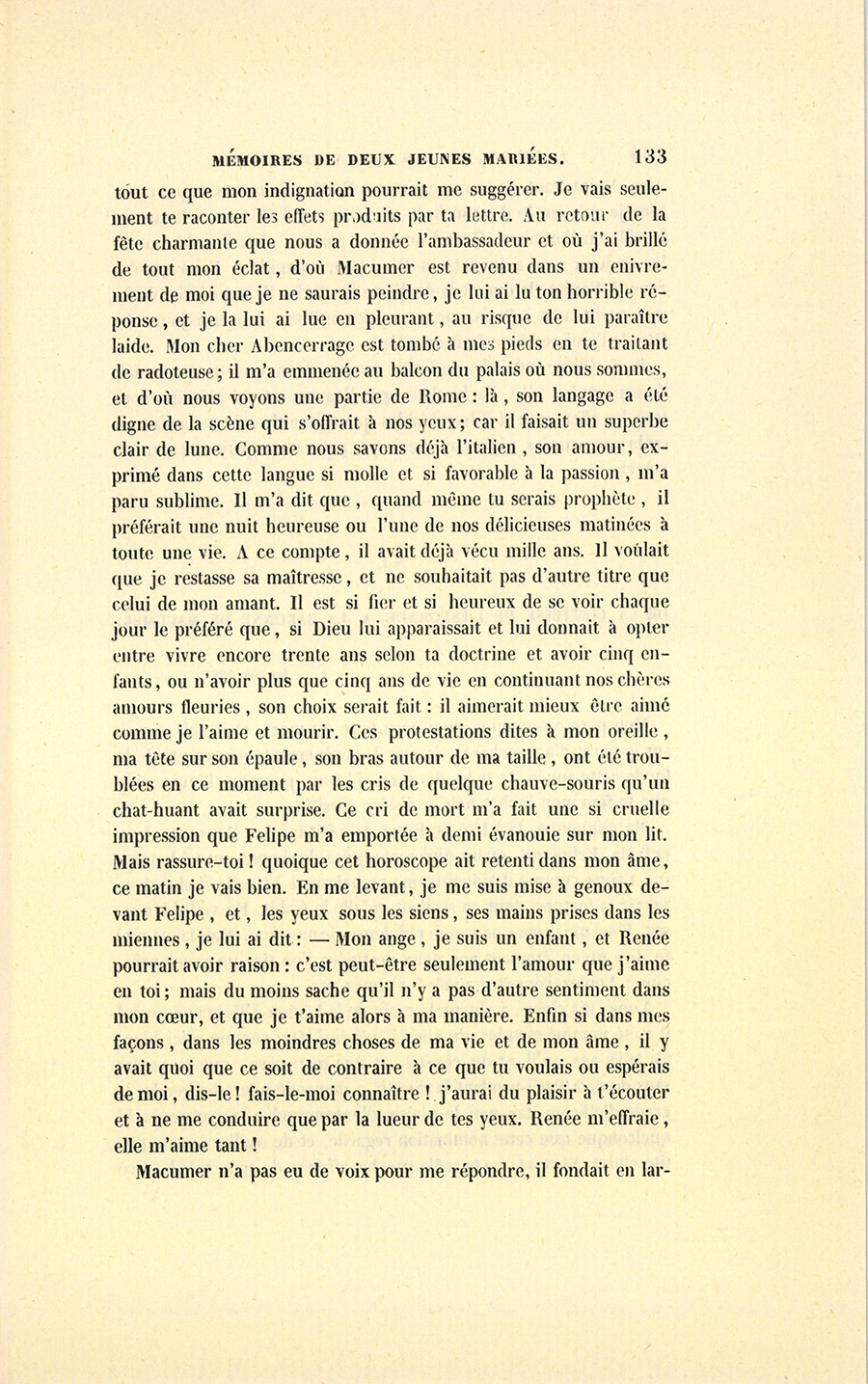 En ce moment j’ai la certitude d’être aimée autant qu’une femme peut être aimée sur cette terre, et j’ai foi dans cette adorable vie conjugale où j’apporte un amour que je ne connaissais pas… Oui, j’éprouve enfin le plaisir de la passion ressentie. Ce que toutes les femmes demandent aujourd’hui à l’amour, le mariage me le donne. Je sens en moi pour Gaston l’adoration que j’inspirais à mon pauvre Felipe ! je ne suis pas maîtresse de moi, je tremble devant cet enfant comme l’Abencerrage tremblait devant moi. Enfin, j’aime plus que je ne suis aimée ; j’ai peur de toute chose, j’ai les frayeurs les plus ridicules, j’ai peur d’être quittée, je tremble d’être vieille et laide quand Gaston sera toujours jeune et beau, je tremble de ne pas lui plaire assez ! Cependant je crois posséder les facultés, le dévouement, l’esprit nécessaires pour, non pas entretenir, mais faire croître cet amour loin du monde et dans la solitude. Si j’échouais, si le magnifique poème de cet amour secret devait avoir une fin, que dis-je une fin ! si Gaston m’aimait un jour moins que la veille, si je m’en aperçois, Renée, sache-le, ce n’est pas à lui, mais à moi que je m’en prendrai. Ce ne sera pas sa faute, ce sera la mienne. Je me connais, je suis plus amante que mère. Aussi te le dis-je d’avance, je mourrais quand même j’aurais des enfants. Avant de me lier avec moi-même, ma Renée, je te supplie donc, si ce malheur m’atteignait, de servir de mère à mes enfants, je te les aurai légués. Ton fanatisme pour le devoir, tes précieuses qualités, ton amour pour les enfants, ta tendresse pour moi, tout ce que je sais de toi me rendra la mort moins amère, je n’ose dire douce. Ce parti pris avec moi-même ajoute je ne sais quoi de terrible à la solennité de ce mariage ; aussi n’y veux-je point de témoins qui me connaissent ; aussi mon mariage sera-t-il célébré secrètement. Je pourrai trembler à mon aise, je ne verrai pas dans tes chers yeux une inquiétude, et moi seule saurai qu’en signant un nouvel acte de mariage je puis avoir signé mon arrêt de mort.