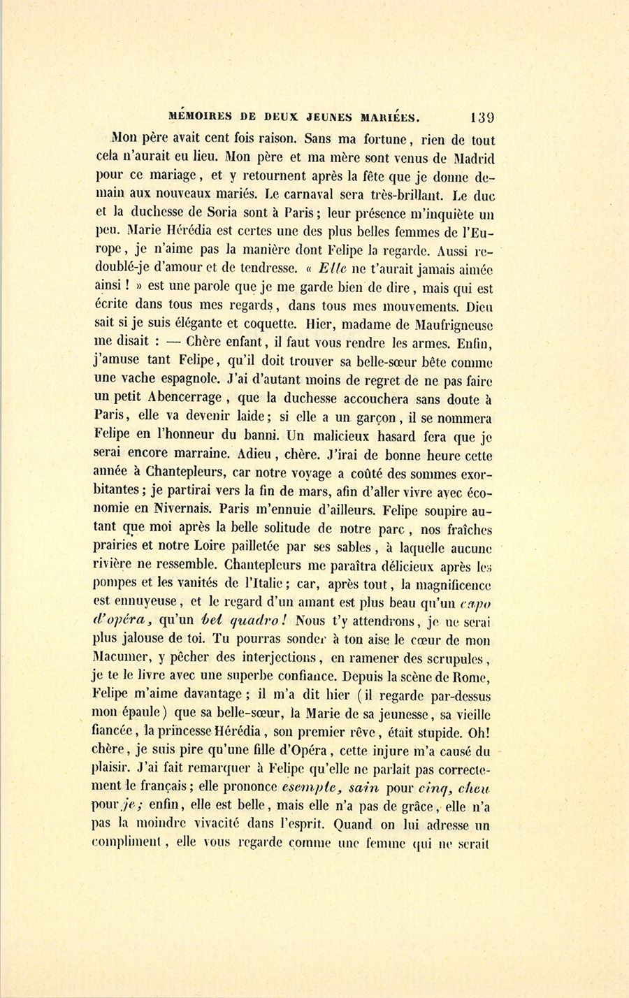 Voilà quinze jours, ma chère, que je vis de la vie du monde : un soir aux Italiens, l’autre au grand Opéra, de là toujours au bal. Ah ! le monde est une féerie. La musique des Italiens me ravit, et pendant que mon âme nage dans un plaisir divin, je suis lorgnée, admirée ; mais, par un seul de mes regards, je fais baisser les yeux au plus hardi jeune homme. J’ai vu là des jeunes gens charmants ; eh ! bien, pas un ne me plaît ; aucun ne m’a causé l’émotion que {p. 33} j’éprouve en entendant Garcia dans son magnifique duo avec Pellegrini dans Otello. Mon Dieu ! combien ce Rossini doit être jaloux pour avoir si bien exprimé la jalousie ? Quel cri que : Il mio cor si divide. Je te parle grec, tu n’as pas entendu Garcia, mais tu sais combien je suis jalouse ! Quel triste dramaturge que Shakespeare ! Othello se prend de gloire, il remporte des victoires, il commande, il parade, il se promène en laissant Desdémone dans son coin, et Desdémone, qui le voit préférant à elle les stupidités de la vie publique, ne se fâche point ? cette brebis mérite la mort. Que celui que je daignerai aimer s’avise de faire autre chose que de m’aimer ! Moi, je suis pour les longues épreuves de l’ancienne chevalerie. Je regarde comme très-impertinent et très-sot ce paltoquet de jeune seigneur qui a trouvé mauvais que sa souveraine l’envoyât chercher son gant au milieu des lions : elle lui réservait sans doute quelque belle fleur d’amour, et il l’a perdue après l’avoir méritée, l’insolent ! Mais je babille comme si je n’avais pas de grandes nouvelles à t’apprendre ! Mon père va sans doute représenter le roi notre maître à Madrid : je dis notre maître, car je ferai partie de l’ambassade. Ma mère désire rester ici, mon père m’emmènera pour avoir une femme près de lui.