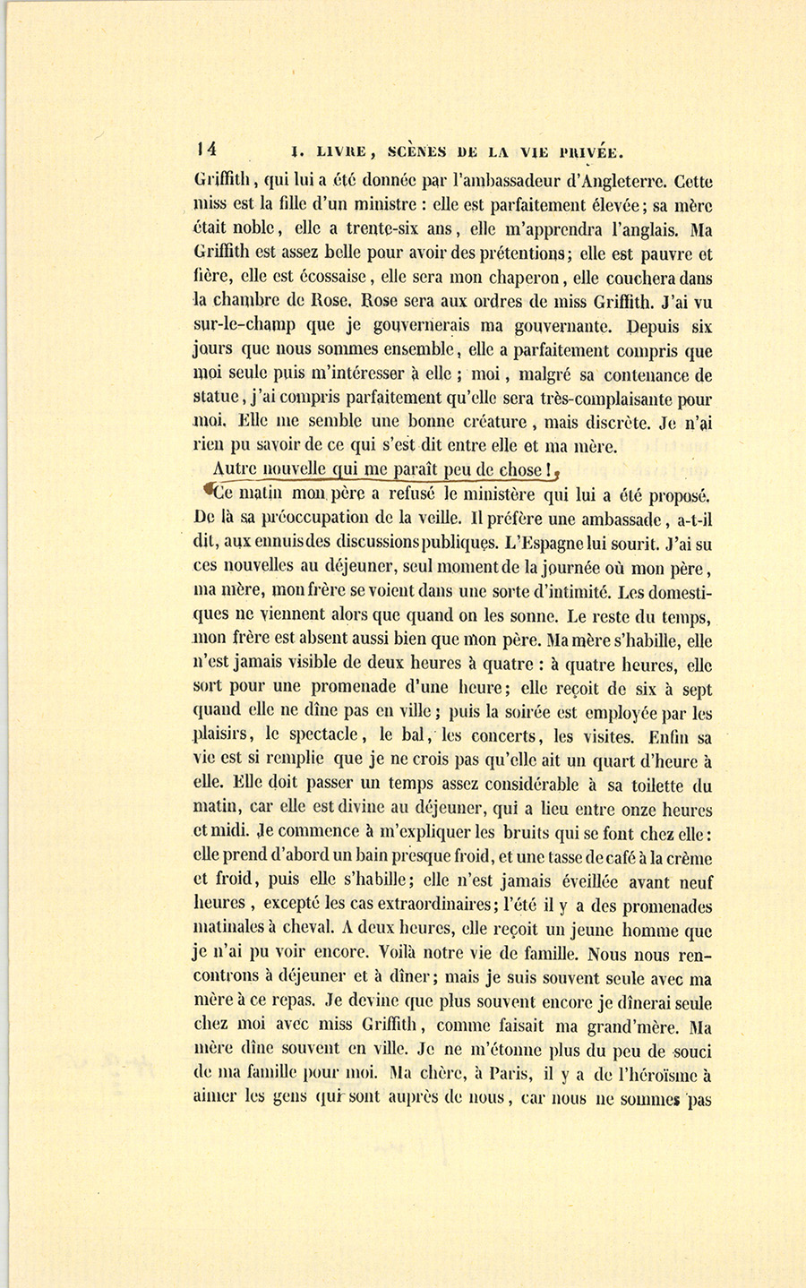 Je suis restée assise sur le sofa de ma grand’mère, les yeux sur la bourse que mon père avait laissée sur la cheminée, à la fois satisfaite et mécontente de cette attention qui maintenait ma pensée sur {p. 13} l’argent. Il est vrai que je n’ai plus à y songer : mes doutes sont éclaircis, et il y a quelque chose de digne à m’éviter toute souffrance d’orgueil à ce sujet. Philippe a couru toute la journée chez les différents marchands et ouvriers qui vont être chargés d’opérer ma métamorphose. Une célèbre couturière, une certaine Victorine, est venue, ainsi qu’une lingère et un cordonnier. Je suis impatiente comme un enfant de savoir comment je serai lorsque j’aurai quitté le sac où nous enveloppait le costume conventuel ; mais tous ces ouvriers veulent beaucoup de temps : le tailleur de corsets demande huit jours si je ne veux pas gâter ma taille. Ceci devient grave, j’ai donc une taille ? Janssen, le cordonnier de l’Opéra, m’a positivement assuré que j’avais le pied de ma mère. J’ai passé toute la matinée à ces occupations sérieuses. Il est venu jusqu’à un gantier qui a pris mesure de ma main. La lingère a eu mes ordres. À l’heure de mon dîner, qui s’est trouvée celle du déjeuner, ma mère m’a dit que nous irions ensemble chez les modistes pour les chapeaux, afin de me former le goût et me mettre à même de commander les miens. Je suis étourdie de ce commencement d’indépendance comme un aveugle qui recouvrerait la vue. Je puis juger de ce qu’est une carmélite à une fille du monde : la différence est si grande que nous n’aurions jamais pu la concevoir. Pendant ce déjeuner mon père fut distrait, et nous le laissâmes à ses idées ; il est fort avant dans les secrets du roi. J’étais parfaitement oubliée, il se souviendra de moi quand je lui serai nécessaire, j’ai vu cela. Mon père est un homme charmant, malgré ses cinquante ans : il a une taille jeune, il est bien fait, il est blond, il a une tournure et des grâces exquises ; il a la figure à la fois parlante et muette des diplomates ; son nez est mince et long, ses yeux sont bruns. Quel joli couple ! Combien de pensées singulières m’ont assaillie en voyant clairement que ces deux êtres, également nobles, riches, supérieurs, ne vivent point ensemble, n’ont rien de commun que le nom, et se maintiennent unis aux yeux du monde. L’élite de la cour et de la diplomatie était hier là. Dans quelques jours je vais à un bal chez la duchesse de Maufrigneuse, et je serai présentée à ce monde que je voudrais tant connaître. Il va venir tous les matins un maître de danse : je dois savoir danser dans un mois, sous peine de ne pas aller au bal. Avant le dîner, ma mère est venue me voir relativement à ma gouvernante. J’ai gardé miss {p. 14} Griffith, qui lui a été donnée par l’ambassadeur d’Angleterre. Cette miss est la fille d’un ministre : elle est parfaitement élevée ; sa mère était noble, elle a trente-six ans, elle m’apprendra l’anglais. Ma Griffith est assez belle pour avoir des prétentions ; elle est pauvre et fière, elle est écossaise, elle sera mon chaperon, elle couchera dans la chambre de Rose. Rose sera aux ordres de miss Griffith. J’ai vu sur-le-champ que je gouvernerais ma gouvernante. Depuis six jours que nous sommes ensemble, elle a parfaitement compris que moi seule puis m’intéresser à elle ; moi, malgré sa contenance de statue, j’ai compris parfaitement qu’elle sera très-complaisante pour moi. Elle me semble une bonne créature, mais discrète. Je n’ai rien pu savoir de ce qui s’est dit entre elle et ma mère.