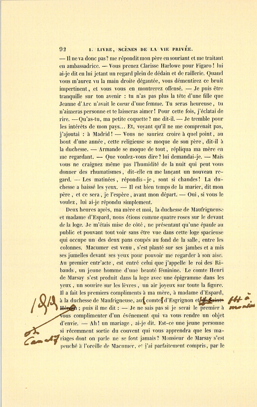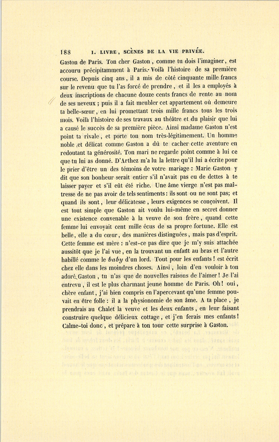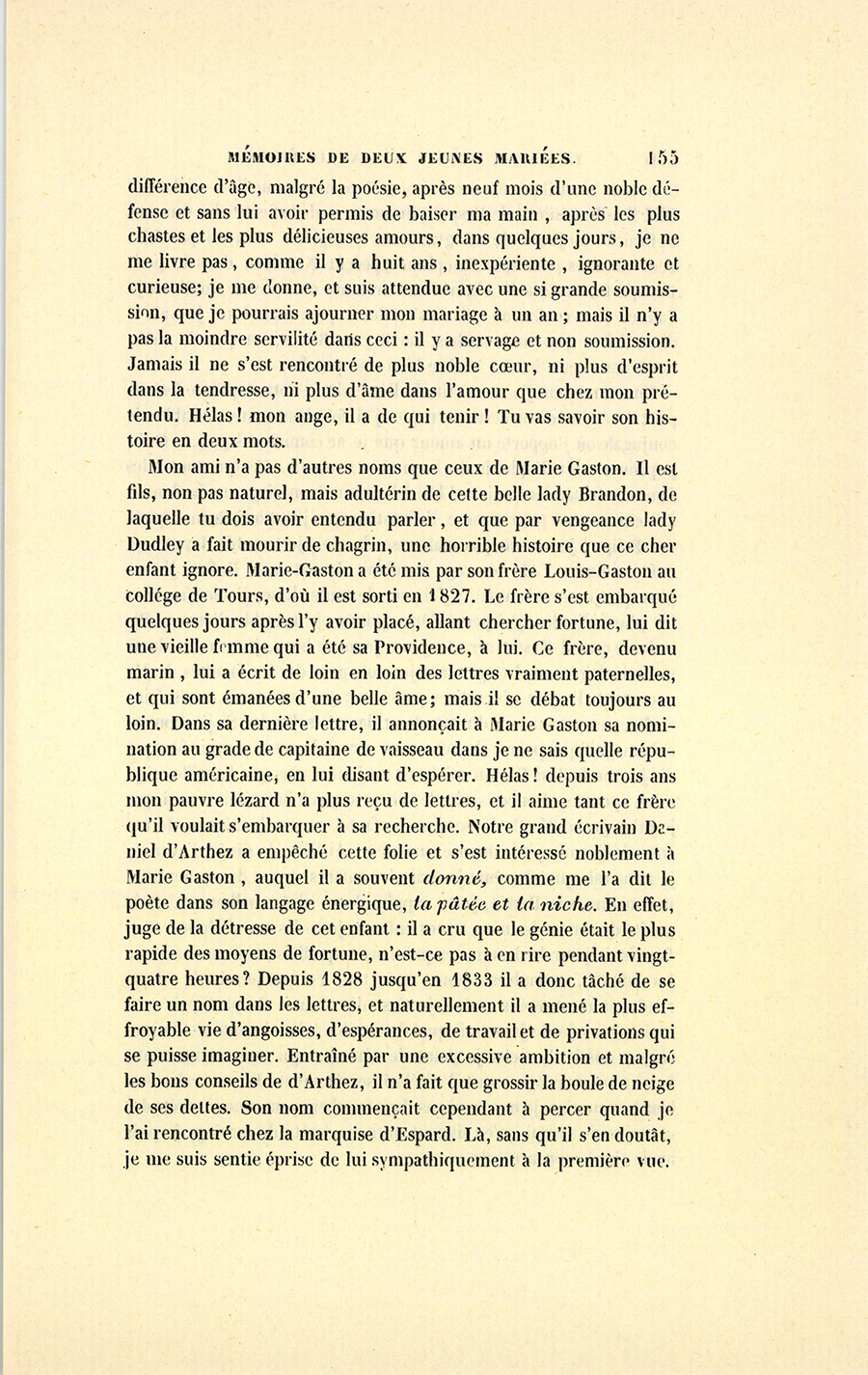 Mon ami n’a pas d’autres noms que ceux de Marie Gaston. Il est fils, non pas naturel, mais adultérin de cette belle lady Brandon, de laquelle tu dois avoir entendu parler, et que par vengeance lady Dudley a fait mourir de chagrin, une horrible histoire que ce cher enfant ignore. Marie-Gaston a été mis par son frère Louis-Gaston au collége de Tours, d’où il est sorti en 1827. Le frère s’est embarqué quelques jours après l’y avoir placé, allant chercher fortune, lui dit une vieille femme qui a été sa Providence, à lui. Ce frère, devenu marin, lui a écrit de loin en loin des lettres vraiment paternelles, et qui sont émanées d’une belle âme ; mais il se débat toujours au loin. Dans sa dernière lettre, il annonçait à Marie Gaston sa nomination au grade de capitaine de vaisseau dans je ne sais quelle république américaine, en lui disant d’espérer. Hélas ! depuis trois ans mon pauvre lézard n’a plus reçu de lettres, et il aime tant ce frère qu’il voulait s’embarquer à sa recherche. Notre grand écrivain Daniel d’Arthez a empêché cette folie et s’est intéressé noblement à Marie Gaston, auquel il a souvent donné, comme me l’a dit le poète dans son langage énergique, la pâtée et la niche. En effet, juge de la détresse de cet enfant : il a cru que le génie était le plus rapide des moyens de fortune, n’est-ce pas à en rire pendant vingt-quatre heures ? Depuis 1828 jusqu’en 1833 il a donc tâché de se faire un nom dans les lettres, et naturellement il a mené la plus effroyable vie d’angoisses, d’espérances, de travail et de privations qui se puisse imaginer. Entraîné par une excessive ambition et malgré les bons conseils de d’Arthez, il n’a fait que grossir la boule de neige de ses dettes. Son nom commençait cependant à percer quand je l’ai rencontré chez la marquise d’Espard. Là, sans qu’il s’en doutât, je me suis sentie éprise de lui sympathiquement à la première vue. {p. 156} Comment n’a-t-il pas encore été aimé ? comment me l’a-t-on laissé ? Oh ! il a du génie et de l’esprit, du cœur et de la fierté ; les femmes s’effraient toujours de ces grandeurs complètes. N’a-t-il pas fallu cent victoires pour que Joséphine aperçût Napoléon dans le petit Bonaparte, son mari ? L’innocente créature croit savoir combien je l’aime ! Pauvre Gaston ! il ne s’en doute pas ; mais à toi je vais le dire, il faut que tu le saches, car il y a, Renée, un peu de testament dans cette lettre. Médite bien mes paroles.