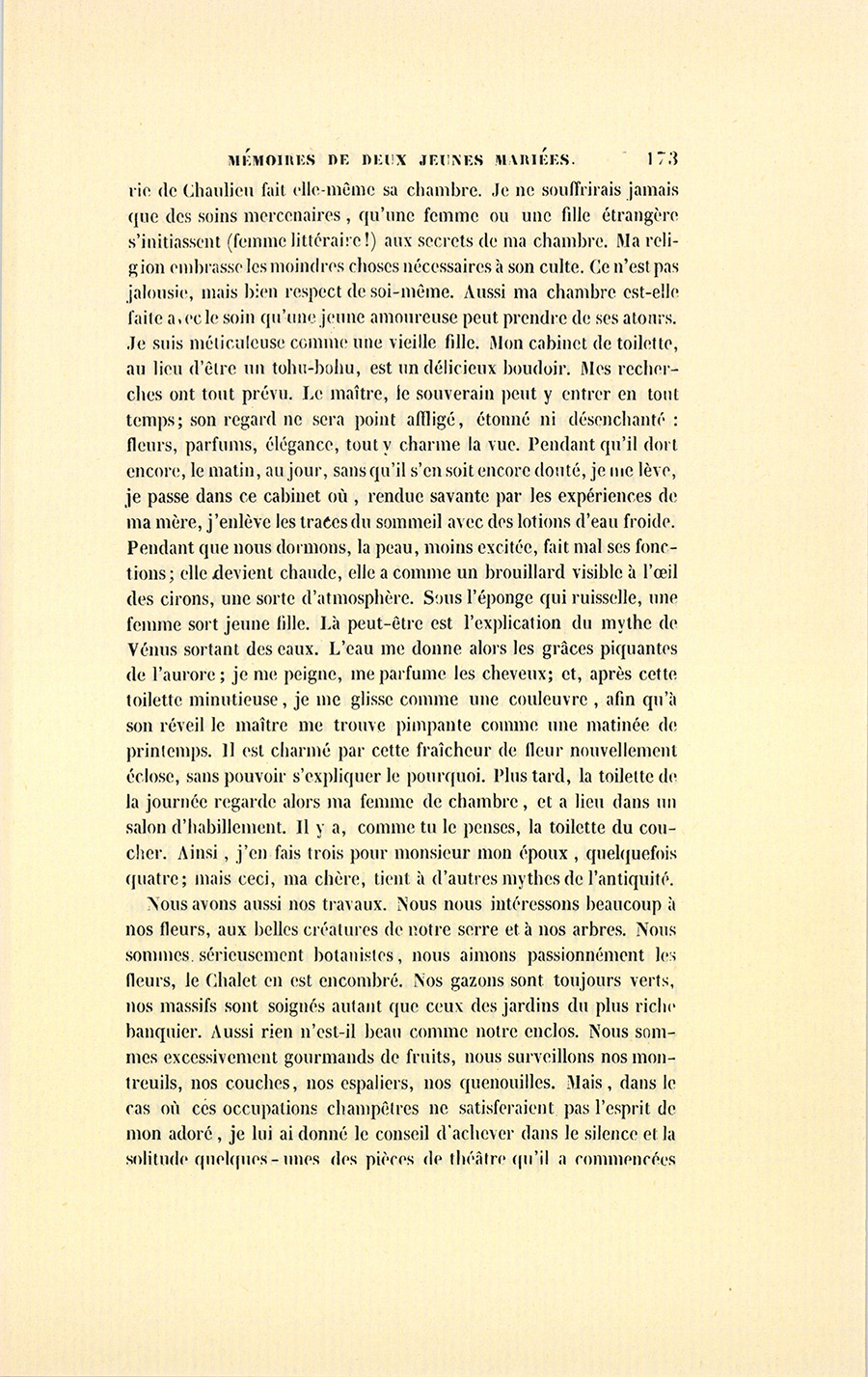 Ma vie, pleine de plaisirs, te paraîtrait d’ailleurs excessivement laborieuse. D’abord, ma chère, apprends que Louise-Armande-Marie {p. 173} de Chaulieu fait elle-même sa chambre. Je ne souffrirais jamais que des soins mercenaires, qu’une femme ou une fille étrangère s’initiassent (femme littéraire !) aux secrets de ma chambre. Ma religion embrasse les moindres choses nécessaires à son culte. Ce n’est pas jalousie, mais bien respect de soi-même. Aussi ma chambre est-elle faite avec le soin qu’une jeune amoureuse peut prendre de ses atours. Je suis méticuleuse comme une vieille fille. Mon cabinet de toilette, au lieu d’être un tohu-bohu, est un délicieux boudoir. Mes recherches ont tout prévu. Le maître, le souverain peut y entrer en tout temps ; son regard ne sera point affligé, étonné ni désenchanté : fleurs, parfums, élégance, tout y charme la vue. Pendant qu’il dort encore, le matin, au jour, sans qu’il s’en soit encore douté, je me lève, je passe dans ce cabinet où, rendue savante par les expériences de ma mère, j’enlève les traces du sommeil avec des lotions d’eau froide. Pendant que nous dormons, la peau, moins excitée, fait mal ses fonctions ; elle devient chaude, elle a comme un brouillard visible à l’œil des cirons, une sorte d’atmosphère. Sous l’éponge qui ruisselle, une femme sort jeune fille. Là peut-être est l’explication du mythe de Vénus sortant des eaux. L’eau me donne alors les grâces piquantes de l’aurore ; je me peigne, me parfume les cheveux ; et, après cette toilette minutieuse, je me glisse comme une couleuvre, afin qu’à son réveil le maître me trouve pimpante comme une matinée de printemps. Il est charmé par cette fraîcheur de fleur nouvellement éclose, sans pouvoir s’expliquer le pourquoi. Plus tard, la toilette de la journée regarde alors ma femme de chambre, et a lieu dans un salon d’habillement. Il y a, comme tu le penses, la toilette du coucher. Ainsi, j’en fais trois pour monsieur mon époux, quelquefois quatre ; mais ceci, ma chère, tient à d’autres mythes de l’antiquité.