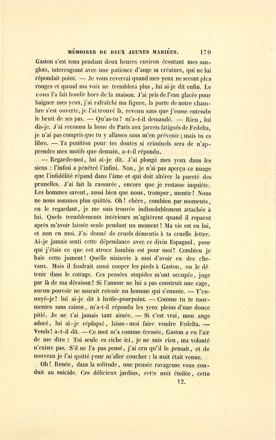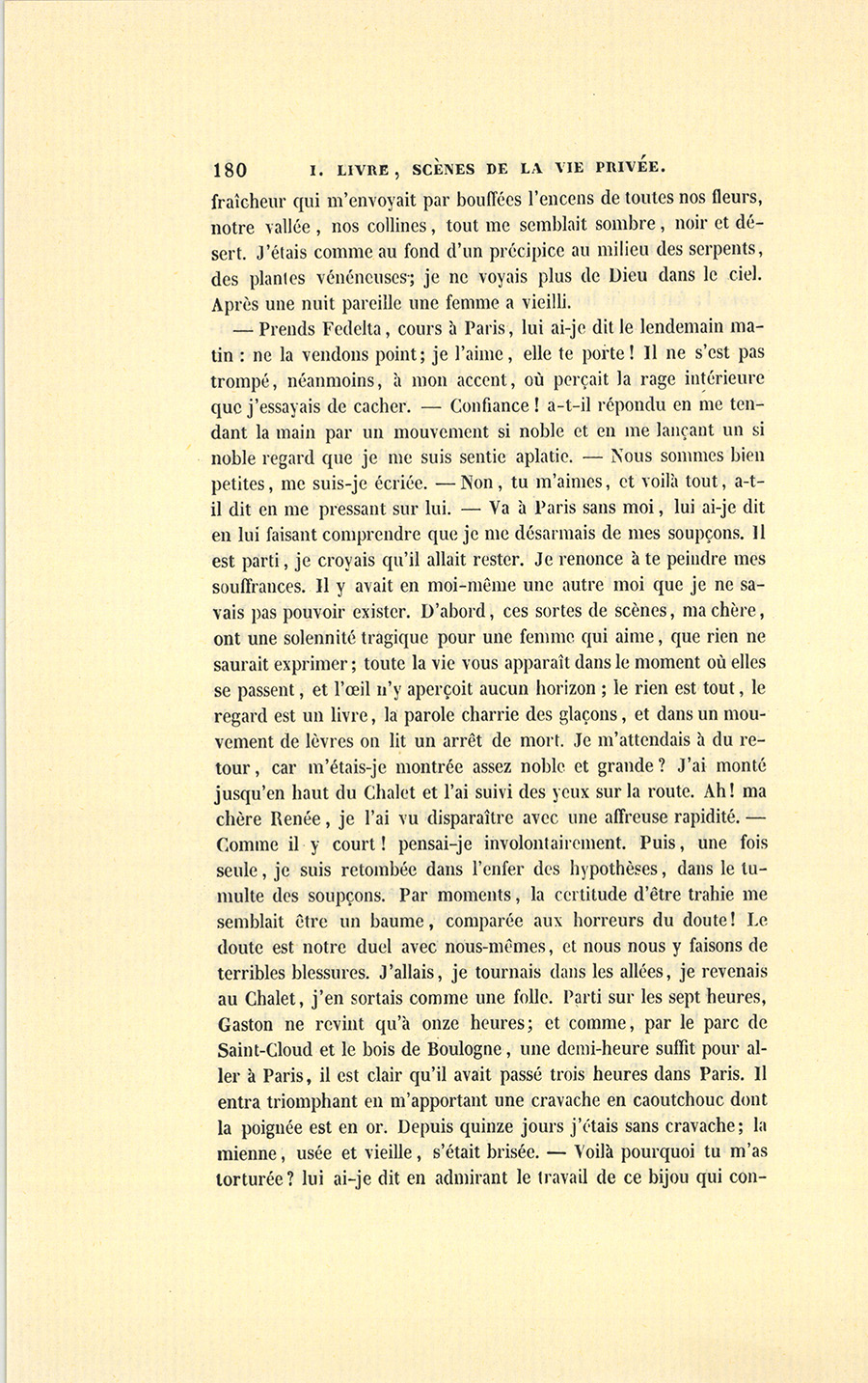 Oh ! Renée, dans la solitude, une pensée ravageuse vous conduit au suicide. Ces délicieux jardins, cette nuit étoilée, cette {p. 180} fraîcheur qui m’envoyait par bouffées l’encens de toutes nos fleurs, notre vallée, nos collines, tout me semblait sombre, noir et désert. J’étais comme au fond d’un précipice au milieu des serpents, des plantes vénéneuses ; je ne voyais plus de Dieu dans le ciel. Après une nuit pareille une femme a vieilli.