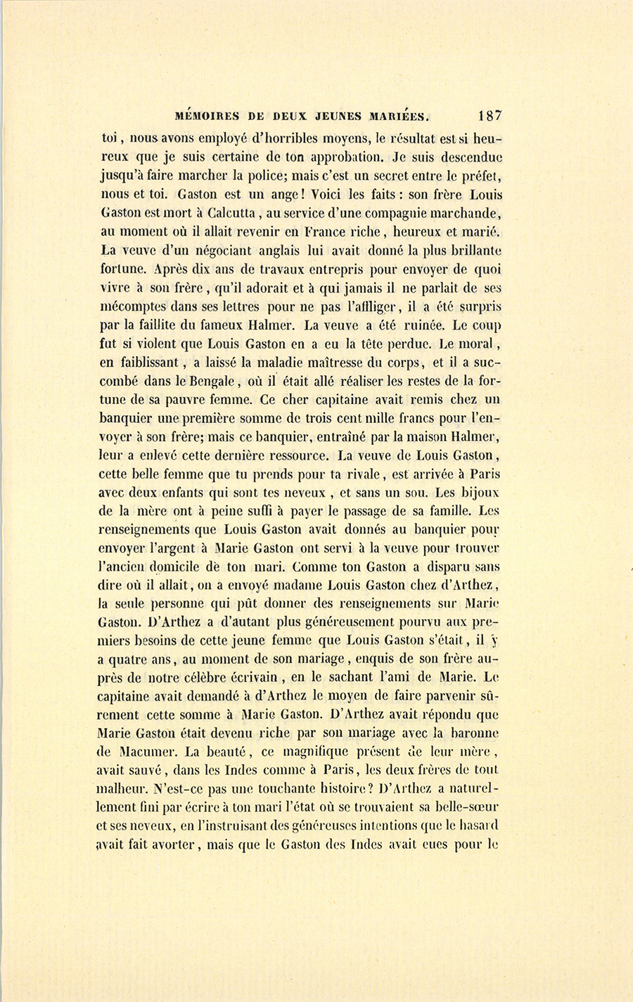 Ma chère Louise, je t’envoie cette lettre par un exprès avant de courir au Chalet moi-même. Calme-toi. Ton dernier mot m’a paru si insensé que j’ai cru pouvoir, en de pareilles circonstances, tout confier à Louis : il s’agissait de te sauver de toi-même. Si, comme {p. 187} toi, nous avons employé d’horribles moyens, le résultat est si heureux que je suis certaine de ton approbation. Je suis descendue jusqu’à faire marcher la police ; mais c’est un secret entre le préfet, nous et toi. Gaston est un ange ! Voici les faits : son frère Louis Gaston est mort à Calcutta, au service d’une compagnie marchande, au moment où il allait revenir en France riche, heureux et marié. La veuve d’un négociant anglais lui avait donné la plus brillante fortune. Après dix ans de travaux entrepris pour envoyer de quoi vivre à son frère, qu’il adorait et à qui jamais il ne parlait de ses mécomptes dans ses lettres pour ne pas l’affliger, il a été surpris par la faillite du fameux Halmer. La veuve a été ruinée. Le coup fut si violent que Louis Gaston en a eu la tête perdue. Le moral, en faiblissant, a laissé la maladie maîtresse du corps, et il a succombé dans le Bengale, où il était allé réaliser les restes de la fortune de sa pauvre femme. Ce cher capitaine avait remis chez un banquier une première somme de trois cent mille francs pour l’envoyer à son frère ; mais ce banquier, entraîné par la maison Halmer, leur a enlevé cette dernière ressource. La veuve de Louis Gaston, cette belle femme que tu prends pour ta rivale, est arrivée à Paris avec deux enfants qui sont tes neveux, et sans un sou. Les bijoux de la mère ont à peine suffi à payer le passage de sa famille. Les renseignements que Louis Gaston avait donnés au banquier pour envoyer l’argent à Marie Gaston ont servi à la veuve pour trouver l’ancien domicile de ton mari. Comme ton Gaston a disparu sans dire où il allait, on a envoyé madame Louis Gaston chez d’Arthez, la seule personne qui pût donner des renseignements sur Marie Gaston. D’Arthez a d’autant plus généreusement pourvu aux premiers besoins de cette jeune femme que Louis Gaston s’était, il y a quatre ans, au moment de son mariage, enquis de son frère auprès de notre célèbre écrivain, en le sachant l’ami de Marie. Le capitaine avait demandé à d’Arthez le moyen de faire parvenir sûrement cette somme à Marie Gaston. D’Arthez avait répondu que Marie Gaston était devenu riche par son mariage avec la baronne de Macumer. La beauté, ce magnifique présent de leur mère, avait sauvé, dans les Indes comme à Paris, les deux frères de tout malheur. N’est-ce pas une touchante histoire ? D’Arthez a naturellement fini par écrire à ton mari l’état où se trouvaient sa belle-sœur et ses neveux, en l’instruisant des généreuses intentions que le hasard avait fait avorter, mais que le Gaston des Indes avait eues pour le {p. 188} Gaston de Paris. Ton cher Gaston, comme tu dois l’imaginer, est accouru précipitamment à Paris. Voilà l’histoire de sa première course. Depuis cinq ans, il a mis de côté cinquante mille francs sur le revenu que tu l’as forcé de prendre, et il les a employés à deux inscriptions de chacune douze cents francs de rente au nom de ses neveux ; puis il a fait meubler cet appartement où demeure ta belle-sœur, en lui promettant trois mille francs tous les trois mois. Voilà l’histoire de ses travaux au théâtre et du plaisir que lui a causé le succès de sa première pièce. Ainsi madame Gaston n’est point ta rivale, et porte ton nom très-légitimement. Un homme noble et délicat comme Gaston a dû te cacher cette aventure en redoutant ta générosité. Ton mari ne regarde point comme à lui ce que tu lui as donné. D’Arthez m’a lu la lettre qu’il lui a écrite pour le prier d’être un des témoins de votre mariage : Marie Gaston y dit que son bonheur serait entier s’il n’avait pas eu de dettes à te laisser payer et s’il eût été riche. Une âme vierge n’est pas maîtresse de ne pas avoir de tels sentiments : ils sont ou ne sont pas ; et quand ils sont, leur délicatesse, leurs exigences se conçoivent. Il est tout simple que Gaston ait voulu lui-même en secret donner une existence convenable à la veuve de son frère, quand cette femme lui envoyait cent mille écus de sa propre fortune. Elle est belle, elle a du cœur, des manières distinguées, mais pas d’esprit. Cette femme est mère : n’est-ce pas dire que je m’y suis attachée aussitôt que je l’ai vue, en la trouvant un enfant au bras et l’autre habillé comme le baby d’un lord. Tout pour les enfants ! est écrit chez elle dans les moindres choses. Ainsi, loin d’en vouloir à ton adoré Gaston, tu n’as que de nouvelles raisons de l’aimer ! Je l’ai entrevu, il est le plus charmant jeune homme de Paris. Oh ! oui, chère enfant, j’ai bien compris en l’apercevant qu’une femme pouvait en être folle : il a la physionomie de son âme. À ta place, je prendrais au Chalet la veuve et les deux enfants, en leur faisant construire quelque délicieux cottage, et j’en ferais mes enfants ! Calme-toi donc, et prépare à ton tour cette surprise à Gaston.