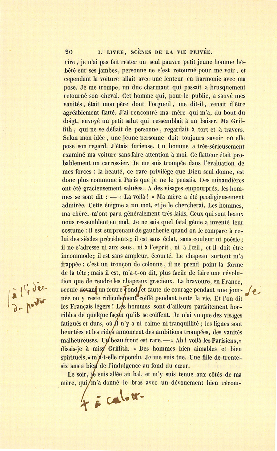 Hier, à deux heures, je suis allée me promener aux Champs-Élysées et au bois de Boulogne par une de ces journées d’automne comme nous en avons tant admiré sur les bords de la Loire. J’ai donc enfin vu Paris ! L’aspect de la place Louis XV est vraiment beau, mais de ce beau que créent les hommes. J’étais bien mise, mélancolique quoique bien disposée à rire, la figure calme sous un charmant chapeau, les bras croisés. Je n’ai pas recueilli le moindre {p. 20} sourire, je n’ai pas fait rester un seul pauvre petit jeune homme hébété sur ses jambes, personne ne s’est retourné pour me voir, et cependant la voiture allait avec une lenteur en harmonie avec ma pose. Je me trompe, un duc charmant qui passait a brusquement retourné son cheval. Cet homme qui, pour le public, a sauvé mes vanités, était mon père dont l’orgueil, me dit-il, venait d’être agréablement flatté. J’ai rencontré ma mère qui m’a, du bout du doigt, envoyé un petit salut qui ressemblait à un baiser. Ma Griffith, qui ne se défiait de personne, regardait à tort et à travers. Selon mon idée, une jeune personne doit toujours savoir où elle pose son regard. J’étais furieuse. Un homme a très-sérieusement examiné ma voiture sans faire attention à moi. Ce flatteur était probablement un carrossier. Je me suis trompée dans l’évaluation de mes forces : la beauté, ce rare privilége que Dieu seul donne, est donc plus commune à Paris que je ne le pensais. Des minaudières ont été gracieusement saluées. À des visages empourprés, les hommes se sont dit : – « La voilà ! » Ma mère a été prodigieusement admirée. Cette énigme a un mot, et je le chercherai. Les hommes, ma chère, m’ont paru généralement très-laids. Ceux qui sont beaux nous ressemblent en mal. Je ne sais quel fatal génie a inventé leur costume : il est surprenant de gaucherie quand on le compare à celui des siècles précédents ; il est sans éclat, sans couleur ni poésie ; il ne s’adresse ni aux sens, ni à l’esprit, ni à l’œil, et il doit être incommode ; il est sans ampleur, écourté. Le chapeau surtout m’a frappée : c’est un tronçon de colonne, il ne prend point la forme de la tête ; mais il est, m’a-t-on dit, plus facile de faire une révolution que de rendre les chapeaux gracieux. La bravoure, en France, recule à l’idée de porter un feutre à calote ronde, et faute de courage pendant une journée on y reste ridiculement coiffé pendant toute la vie. Et l’on dit les Français légers ! Les hommes sont d’ailleurs parfaitement horribles de quelque façon qu’ils se coiffent. Je n’ai vu que des visages fatigués et durs, où il n’y a ni calme ni tranquillité ; les lignes sont heurtées et les rides annoncent des ambitions trompées, des vanités malheureuses. Un beau front est rare. – « Ah ! voilà les Parisiens », disais-je à miss Griffith. – « Des hommes bien aimables et bien spirituels », m’a-t-elle répondu. Je me suis tue. Une fille de trente-six ans a bien de l’indulgence au fond du cœur.