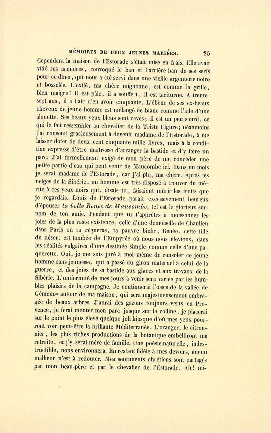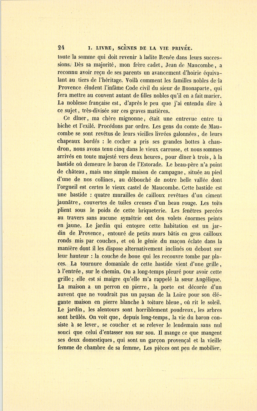 Douze mille livres, produit annuel des biens de madame de l’Estorade, accumulées avec les économies paternelles, font au pauvre garde d’honneur une fortune considérable en Provence, quelque chose comme deux cent cinquante mille livres, outre ses biens au soleil. Le bonhomme l’Estorade avait acheté, la veille du jour où il devait revoir le chevalier, un beau domaine mal administré, où il se propose de planter dix mille mûriers qu’il élevait exprès dans sa pépinière, en prévoyant cette acquisition. Le baron, en retrouvant son fils, n’a plus eu qu’une pensée, celle de le marier, et de le marier à une jeune fille noble. Mon père et ma mère ont partagé pour mon compte la pensée de leur voisin dès que le vieillard leur eut annoncé son intention de prendre Renée de Maucombe sans dot, et de lui reconnaître au contrat {p. 24} toute la somme qui doit revenir à ladite Renée dans leurs successions. Dès sa majorité, mon frère cadet, Jean de Maucombe, a reconnu avoir reçu de ses parents un avancement d’hoirie équivalant au tiers de l’héritage. Voilà comment les familles nobles de la Provence éludent l’infâme Code civil du sieur de Buonaparte, qui fera mettre au couvent autant de filles nobles qu’il en a fait marier. La noblesse française est, d’après le peu que j’ai entendu dire à ce sujet, très-divisée sur ces graves matières.