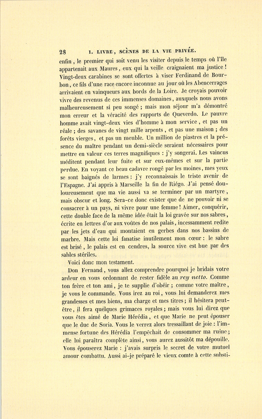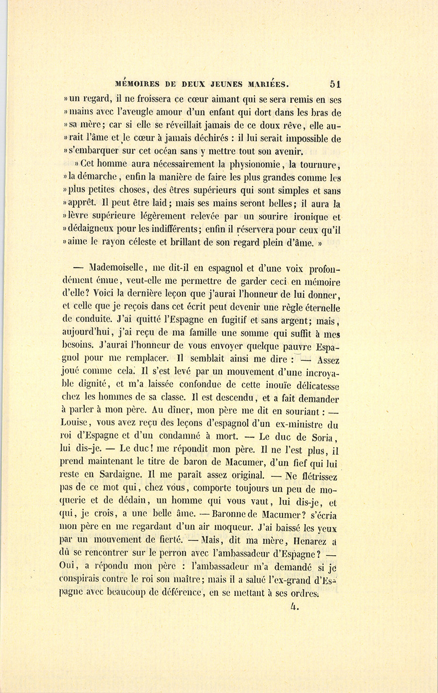 – Mademoiselle, me dit-il en espagnol et d’une voix profondément émue, veut-elle me permettre de garder ceci en mémoire d’elle ? Voici la dernière leçon que j’aurai l’honneur de lui donner, et celle que je reçois dans cet écrit peut devenir une règle éternelle de conduite. J’ai quitté l’Espagne en fugitif et sans argent ; mais, aujourd’hui, j’ai reçu de ma famille une somme qui suffit à mes besoins. J’aurai l’honneur de vous envoyer quelque pauvre Espagnol pour me remplacer. Il semblait ainsi me dire : – Assez joué comme cela. Il s’est levé par un mouvement d’une incroyable dignité, et m’a laissée confondue de cette inouïe délicatesse chez les hommes de sa classe. Il est descendu, et a fait demander à parler à mon père. Au dîner, mon père me dit en souriant : – Louise, vous avez reçu des leçons d’espagnol d’un ex-ministre du roi d’Espagne et d’un condamné à mort. – Le duc de Soria, lui dis-je. – Le duc ! me répondit mon père. Il ne l’est plus, il prend maintenant le titre de baron de Macumer, d’un fief qui lui reste en Sardaigne. Il me paraît assez original. – Ne flétrissez pas de ce mot qui, chez vous, comporte toujours un peu de moquerie et de dédain, un homme qui vous vaut, lui dis-je, et qui, je crois, a une belle âme. – Baronne de Macumer ? s’écria mon père en me regardant d’un air moqueur. J’ai baissé les yeux par un mouvement de fierté. – Mais, dit ma mère, Hénarez a dû se rencontrer sur le perron avec l’ambassadeur d’Espagne ? – Oui, a répondu mon père : l’ambassadeur m’a demandé si je conspirais contre le roi son maître ; mais il a salué l’ex-grand d’Espagne avec beaucoup de déférence, en se mettant à ses ordres.