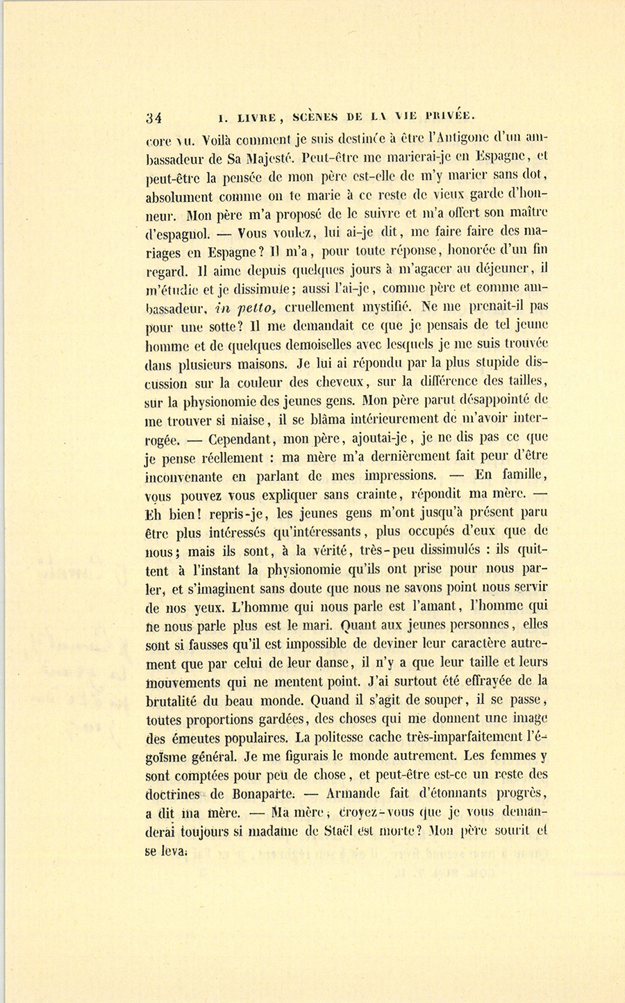 Ma chère, tu ne vois là rien que de simple, et néanmoins il y a là des choses monstrueuses : en quinze jours, j’ai découvert les secrets de la maison. Ma mère suivrait mon père à Madrid, s’il voulait prendre monsieur de Canalis en qualité de secrétaire d’ambassade ; mais le roi désigne les secrétaires, le duc n’ose pas contrarier le roi qui est fort absolu, ni fâcher ma mère ; et ce grand politique croit avoir tranché les difficultés en laissant ici la duchesse. Monsieur de Canalis, le grand poète du jour, est le jeune homme qui cultive la société de ma mère, et qui étudie sans doute avec elle la diplomatie de trois heures à cinq heures. La diplomatie doit être une belle chose, car il est assidu comme un joueur à la Bourse. Monsieur le duc de Rhétoré, notre aîné, solennel, froid et fantasque, serait écrasé par son père à Madrid, il reste à Paris. Miss Griffith sait d’ailleurs qu’Alphonse aime une danseuse de l’Opéra. Comment peut-on aimer des jambes et des pirouettes ? Nous avons remarqué que mon frère assiste aux représentations quand y danse Tullia, il applaudit les pas de cette créature et sort après. Je crois que deux filles dans une maison y font plus de ravages que n’en ferait la peste. Quant à mon second frère, il est à son régiment, je ne l’ai pas {p. 34} encore vu. Voilà comment je suis destinée à être l’Antigone d’un ambassadeur de Sa Majesté. Peut-être me marierai-je en Espagne, et peut-être la pensée de mon père est-elle de m’y marier sans dot, absolument comme on te marie à ce reste de vieux garde d’honneur. Mon père m’a proposé de le suivre et m’a offert son maître d’espagnol. – Vous voulez, lui ai-je dit, me faire faire des mariages en Espagne ? Il m’a, pour toute réponse, honorée d’un fin regard. Il aime depuis quelques jours à m’agacer au déjeuner, il m’étudie et je dissimule ; aussi l’ai-je, comme père et comme ambassadeur, in petto, cruellement mystifié. Ne me prenait-il pas pour une sotte ? Il me demandait ce que je pensais de tel jeune homme et de quelques demoiselles avec lesquels je me suis trouvée dans plusieurs maisons. Je lui ai répondu par la plus stupide discussion sur la couleur des cheveux, sur la différence des tailles, sur la physionomie des jeunes gens. Mon père parut désappointé de me trouver si niaise, il se blâma intérieurement de m’avoir interrogée. – Cependant, mon père, ajoutai-je, je ne dis pas ce que je pense réellement : ma mère m’a dernièrement fait peur d’être inconvenante en parlant de mes impressions. – En famille, vous pouvez vous expliquer sans crainte, répondit ma mère. – Eh bien ! repris-je, les jeunes gens m’ont jusqu’à présent paru être plus intéressés qu’intéressants, plus occupés d’eux que de nous ; mais ils sont, à la vérité, très-peu dissimulés : ils quittent à l’instant la physionomie qu’ils ont prise pour nous parler, et s’imaginent sans doute que nous ne savons point nous servir de nos yeux. L’homme qui nous parle est l’amant, l’homme qui ne nous parle plus est le mari. Quant aux jeunes personnes, elles sont si fausses qu’il est impossible de deviner leur caractère autrement que par celui de leur danse, il n’y a que leur taille et leurs mouvements qui ne mentent point. J’ai surtout été effrayée de la brutalité du beau monde. Quand il s’agit de souper, il se passe, toutes proportions gardées, des choses qui me donnent une image des émeutes populaires. La politesse cache très-imparfaitement l’égoïsme général. Je me figurais le monde autrement. Les femmes y sont comptées pour peu de chose, et peut-être est-ce un reste des doctrines de Bonaparte. – Armande fait d’étonnants progrès, a dit ma mère. – Ma mère, croyez-vous que je vous demanderai toujours si madame de Staël est morte ? Mon père sourit et se leva.