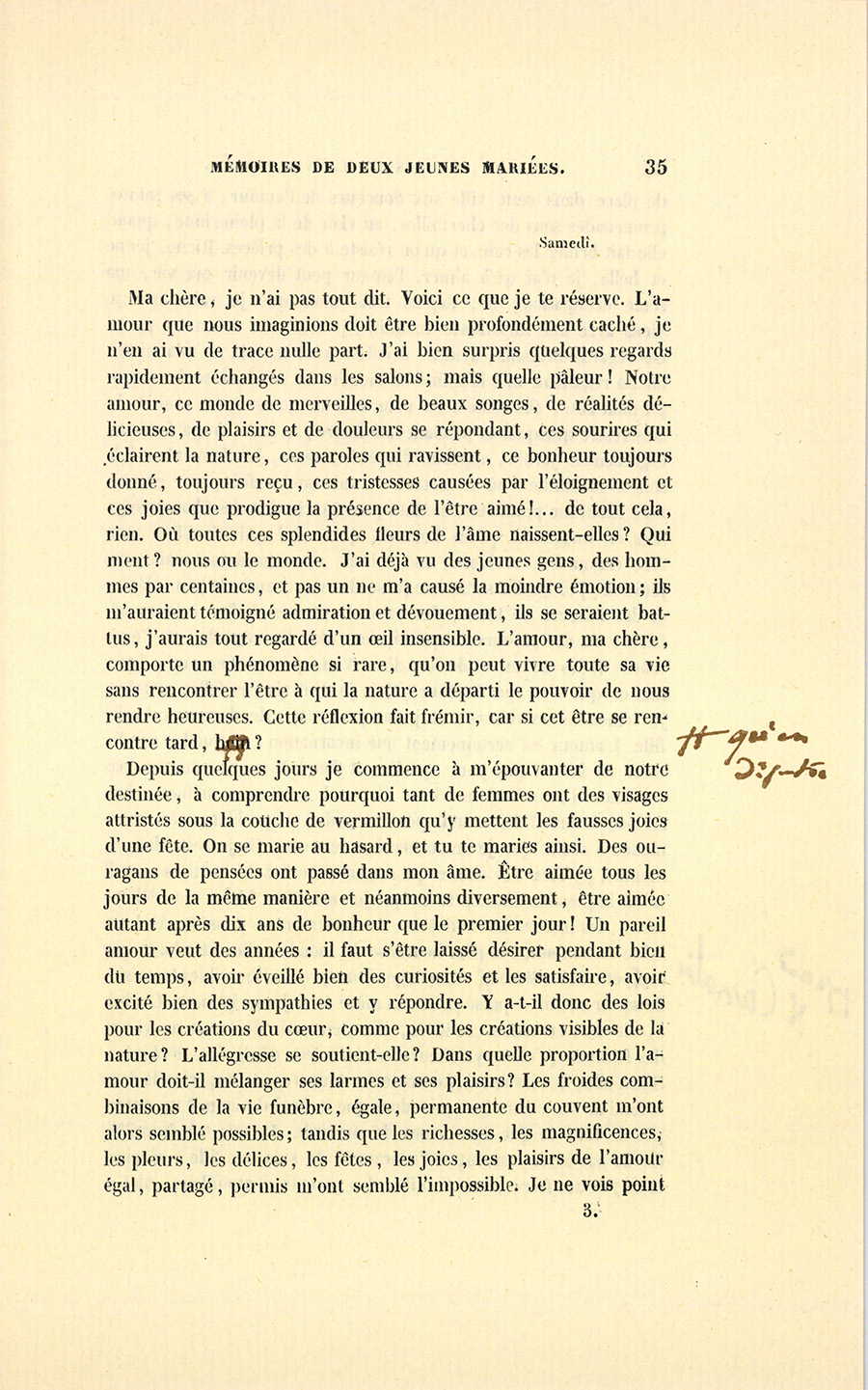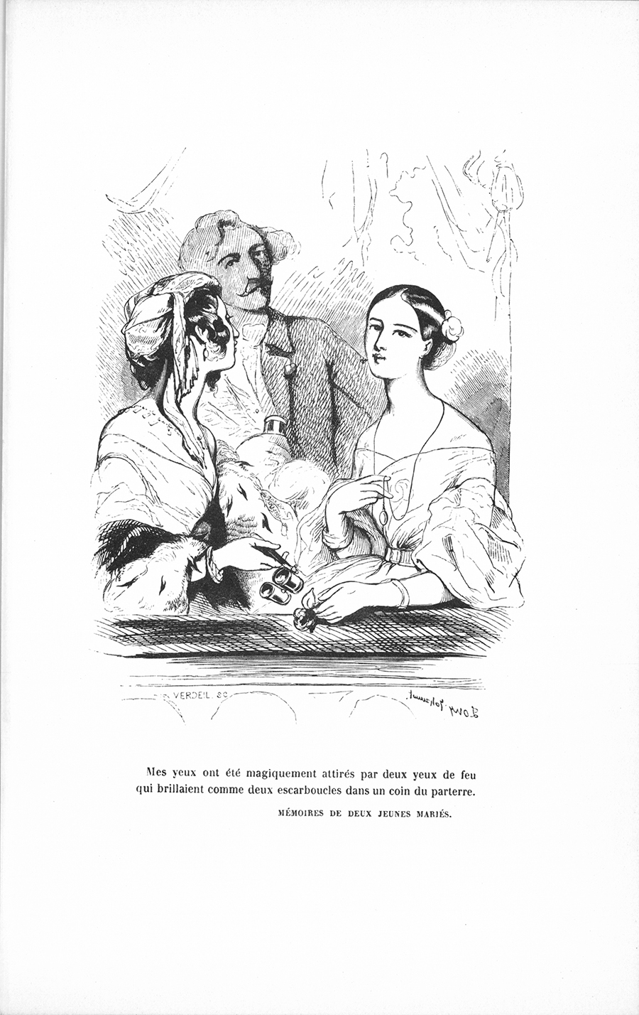 Hier, aux Italiens, je me suis sentie regardée, mes yeux ont été magiquement attirés par deux yeux de feu qui brillaient comme deux escarboucles dans un coin obscur de l’orchestre. [ill.] Hénarez n’a pas détaché ses yeux de dessus moi. Le monstre a cherché la seule place d’où il pouvait me voir, et il y est. Je ne sais pas ce qu’il est en politique ; mais il a le génie de l’amour.