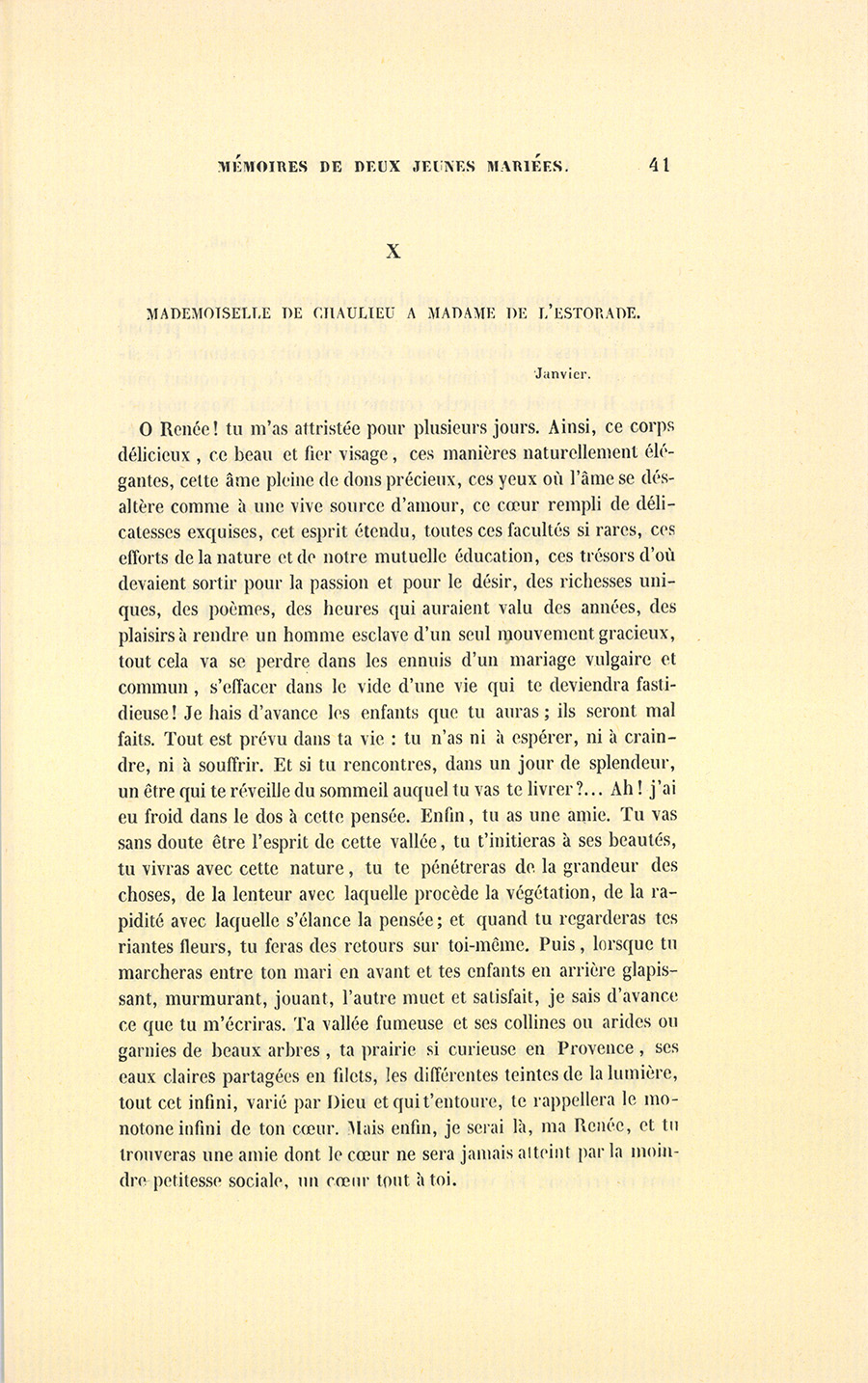 L’amour est, je crois, un poème entièrement personnel. Il n’y a rien qui ne soit à la fois vrai et faux dans tout ce que les auteurs nous en écrivent. En vérité, ma chère belle, comme tu ne peux {p. 43} plus me parler que d’amour conjugal, je crois, dans l’intérêt bien entendu de notre double existence, qu’il est nécessaire que je reste fille, et que j’aie quelque belle passion, pour que nous connaissions bien la vie. Raconte-moi très-exactement tout ce qui t’arrivera, surtout dans les premiers jours, avec cet animal que je nomme un mari. Je te promets la même exactitude, si jamais je suis aimée. Adieu, pauvre chérie engloutie.