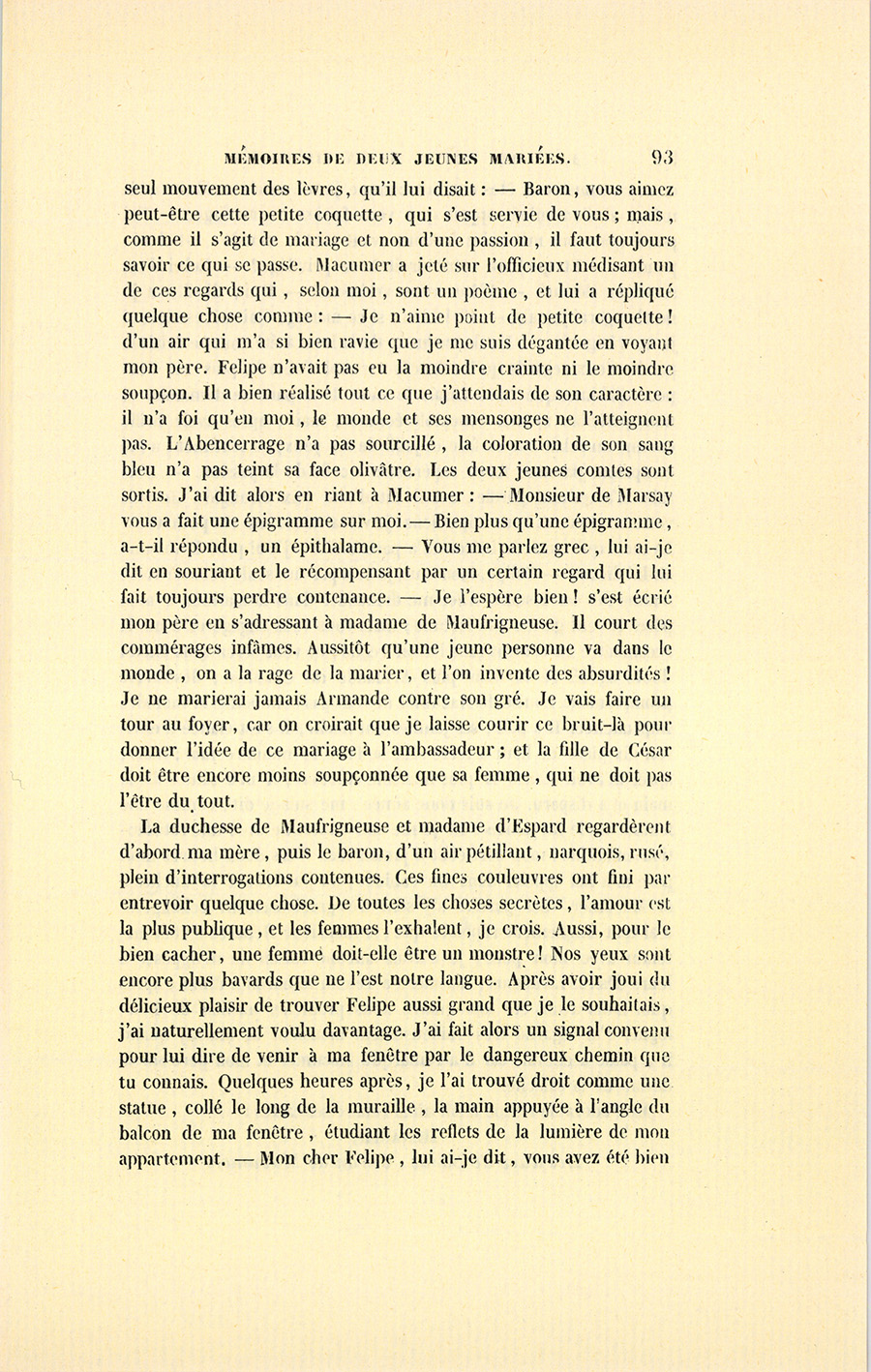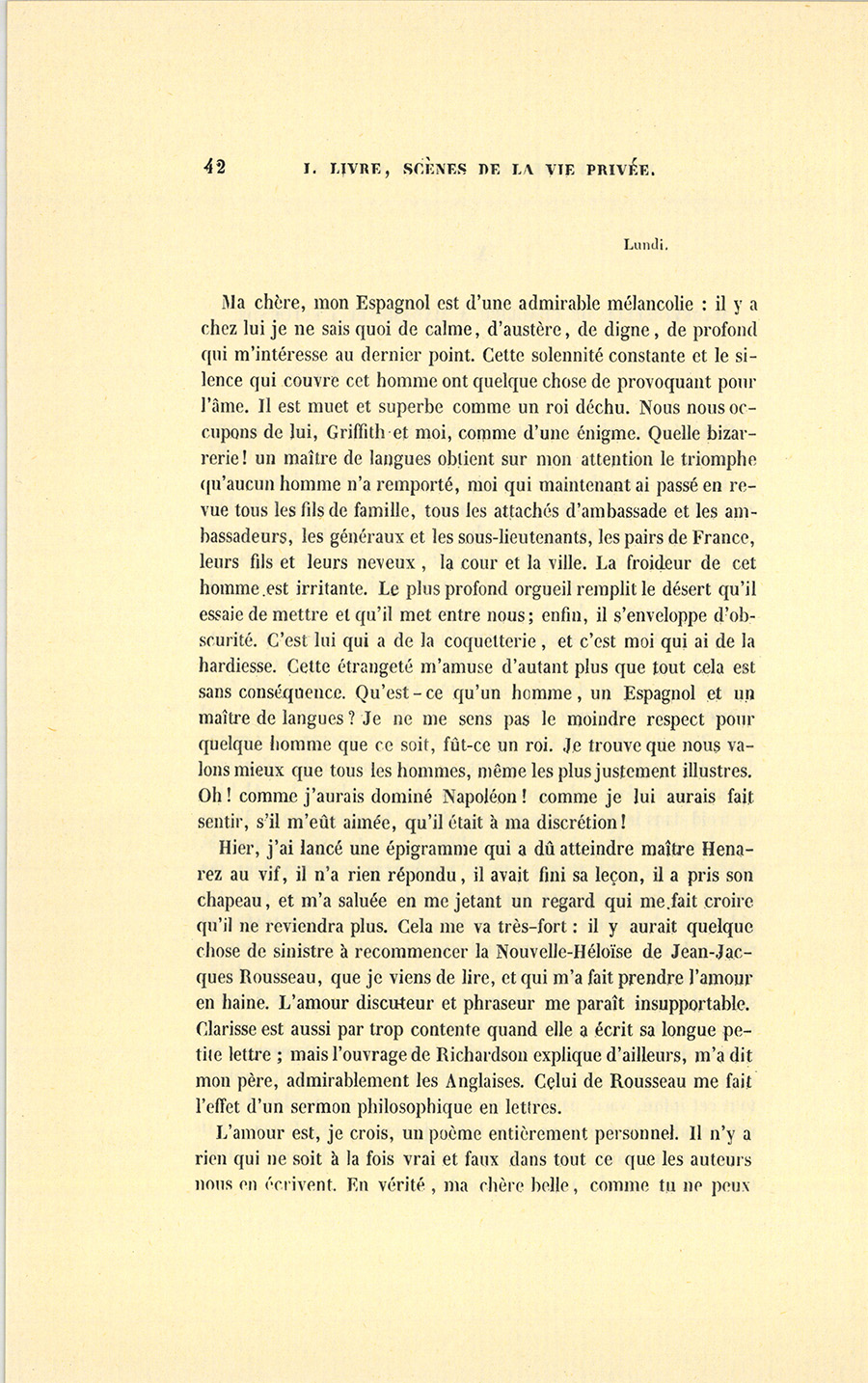 Cette réponse, que le vicomte de Vandenesse m’a rapportée textuellement, m’a donné beaucoup à penser. Je ne puis dire en quelles anxiétés j’ai passé le temps jusqu’à ma première leçon, qui a eu lieu ce matin. Pendant le premier quart d’heure de la leçon, je me suis demandé, en l’examinant, s’il était duc ou bourgeois, sans pouvoir y rien comprendre. Il semblait deviner mes pensées à mesure qu’elles naissaient et se plaire à les contrarier. Enfin je n’y tins plus, je quittai brusquement mon livre en interrompant la traduction que j’en faisais à haute voix, je lui dis en espagnol : – Vous nous trompez, monsieur. Vous n’êtes pas un pauvre bourgeois libéral, vous êtes le duc de Soria ? – Mademoiselle, répondit-il avec un mouvement de tristesse, malheureusement, je ne suis pas le duc de Soria. Je compris tout ce qu’il mit de désespoir dans le mot malheureusement. Ah ! ma chère, il sera, certes, impossible à aucun homme de mettre autant de passion et de choses dans un seul mot. Il avait baissé les yeux, et n’osait plus me regarder. – Monsieur de Talleyrand, lui dis-je, chez qui vous avez passé les années d’exil, ne laisse d’autre alternative à un Hénarez que celle d’être ou duc de Soria disgracié ou domestique. Il leva les yeux sur moi, et me montra deux brasiers noirs et brillants, deux yeux à la fois flamboyants et humiliés. Cet homme m’a paru être alors à la torture. – Mon père, dit-il, était en effet serviteur du roi d’Espagne. Griffith ne connaissait pas cette manière d’étudier. Nous faisions des silences inquiétants à chaque demande et à chaque réponse. – Enfin, lui dis-je, êtes-vous noble ou bourgeois ? – Vous savez, mademoiselle, qu’en Espagne tout le monde, même les mendiants, sont nobles. Cette réserve m’impatienta. J’avais préparé depuis la dernière leçon un de ces amusements qui sourient à l’imagination. J’avais tracé dans une lettre le portrait idéal de l’homme par qui je voudrais être aimée, en me proposant de le lui donner à traduire. Jusqu’à présent j’ai traduit de l’espagnol en français, et non du français en espagnol ; je lui en fis l’observation, et priai Griffith de me chercher la dernière lettre que j’avais reçue d’une de mes amies. Je verrai, pensais-je, à l’effet que lui {p. 50} fera mon programme, quel sang est dans ses veines. Je pris le papier des mains de Griffith en disant : – Voyons si j’ai bien copié ? car tout était de mon écriture. Je lui tendis le papier ou si tu veux le piège, et je l’examinai pendant qu’il lisait ceci.