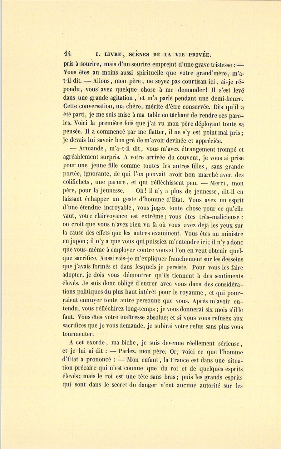 Ma belle biche, ce matin à neuf heures, mon père s’est fait annoncer chez moi, j’étais levée et habillée ; je l’ai trouvé gravement assis au coin de mon feu dans mon salon, pensif au delà de son habitude ; il m’a montré la bergère en face de lui, je l’ai compris, et m’y suis plongée avec une gravité qui le singeait si bien, qu’il s’est {p. 44} pris à sourire, mais d’un sourire empreint d’une grave tristesse : – Vous êtes au moins aussi spirituelle que votre grand’mère, m’a-t-il dit. – Allons, mon père, ne soyez pas courtisan ici, ai-je répondu, vous avez quelque chose à me demander ! Il s’est levé dans une grande agitation, et m’a parlé pendant une demi-heure. Cette conversation, ma chère, mérite d’être conservée. Dès qu’il a été parti, je me suis mise à ma table en tâchant de rendre ses paroles. Voici la première fois que j’ai vu mon père déployant toute sa pensée. Il a commencé par me flatter, il ne s’y est point mal pris ; je devais lui savoir bon gré de m’avoir devinée et appréciée.
