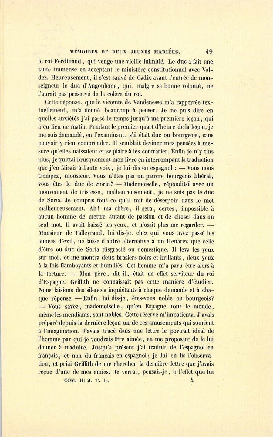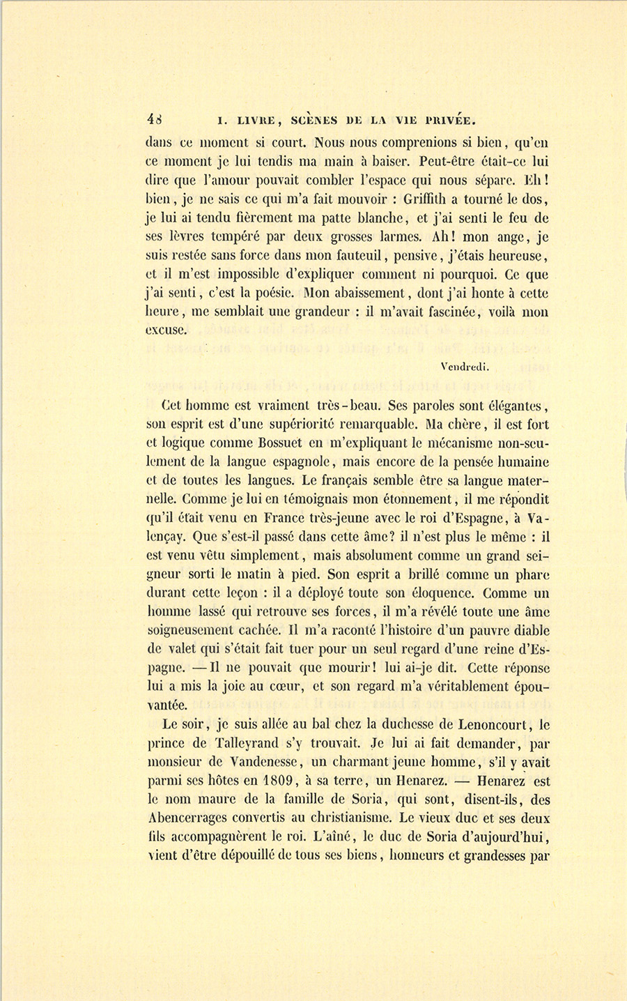 Le soir, je suis allée au bal chez la duchesse de Lenoncourt, le prince de Talleyrand s’y trouvait. Je lui ai fait demander, par monsieur de Vandenesse, un charmant jeune homme, s’il y avait parmi ses hôtes en 1809, à sa terre, un Hénarez. – Hénarez est le nom maure de la famille de Soria, qui sont, disent-ils, des Abencerrages convertis au christianisme. Le vieux duc et ses deux fils accompagnèrent le roi. L’aîné, le duc de Soria d’aujourd’hui, vient d’être dépouillé de tous ses biens, honneurs et grandesses par {p. 49} le roi Ferdinand, qui venge une vieille inimitié. Le duc a fait une faute immense en acceptant le ministère constitutionnel avec Valdez. Heureusement, il s’est sauvé de Cadix avant l’entrée de monseigneur le duc d’Angoulême, qui, malgré sa bonne volonté, ne l’aurait pas préservé de la colère du roi.