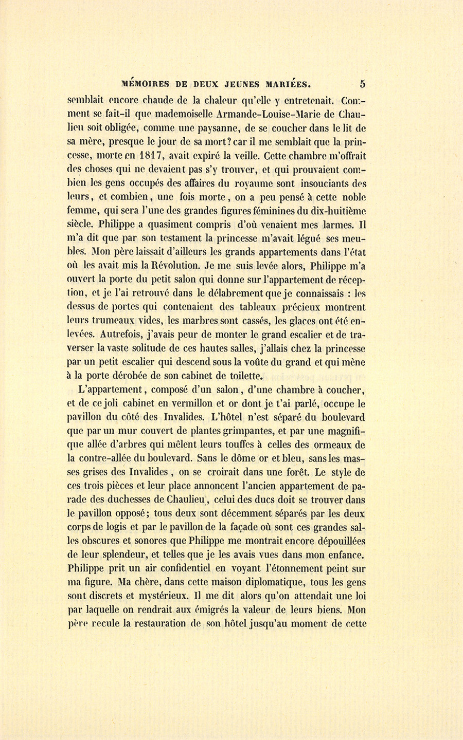Cet appartement est celui de cette grand’mère tant aimée, la princesse de Vaurémont à qui je dois une fortune quelconque, de laquelle personne ne m’a rien dit. À ce passage, tu partageras la tristesse qui m’a saisie en entrant dans ce lieu consacré par mes souvenirs. L’appartement était comme elle l’avait laissé ! J’allais coucher dans le lit où elle est morte. Assise sur le bord de sa chaise longue, je pleurai sans voir que je n’étais pas seule, je pensai que je m’y étais souvent mise à ses genoux pour mieux l’écouter. De là j’avais vu son visage perdu dans ses dentelles rousses, et maigri par l’âge autant que par les douleurs de l’agonie. Cette chambre me {p. 5} semblait encore chaude de la chaleur qu’elle y entretenait. Comment se fait-il que mademoiselle Armande-Louise-Marie de Chaulieu soit obligée, comme une paysanne, de se coucher dans le lit de sa mère, presque le jour de sa mort ? car il me semblait que la princesse, morte en 1817, avait expiré la veille. Cette chambre m’offrait des choses qui ne devaient pas s’y trouver, et qui prouvaient combien les gens occupés des affaires du royaume sont insouciants des leurs, et combien, une fois morte, on a peu pensé à cette noble femme, qui sera l’une des grandes figures féminines du dix-huitième siècle. Philippe a quasiment compris d’où venaient mes larmes. Il m’a dit que par son testament la princesse m’avait légué ses meubles. Mon père laissait d’ailleurs les grands appartements dans l’état où les avait mis la Révolution. Je me suis levée alors, Philippe m’a ouvert la porte du petit salon qui donne sur l’appartement de réception, et je l’ai retrouvé dans le délabrement que je connaissais : les dessus de portes qui contenaient des tableaux précieux montrent leurs trumeaux vides, les marbres sont cassés, les glaces ont été enlevées. Autrefois, j’avais peur de monter le grand escalier et de traverser la vaste solitude de ces hautes salles, j’allais chez la princesse par un petit escalier qui descend sous la voûte du grand et qui mène à la porte dérobée de son cabinet de toilette.