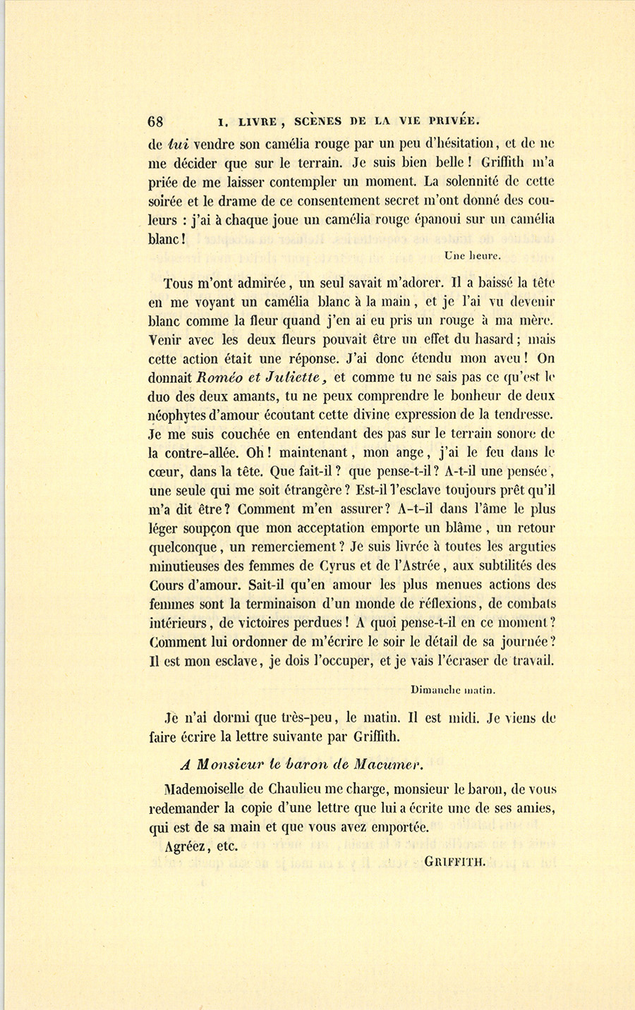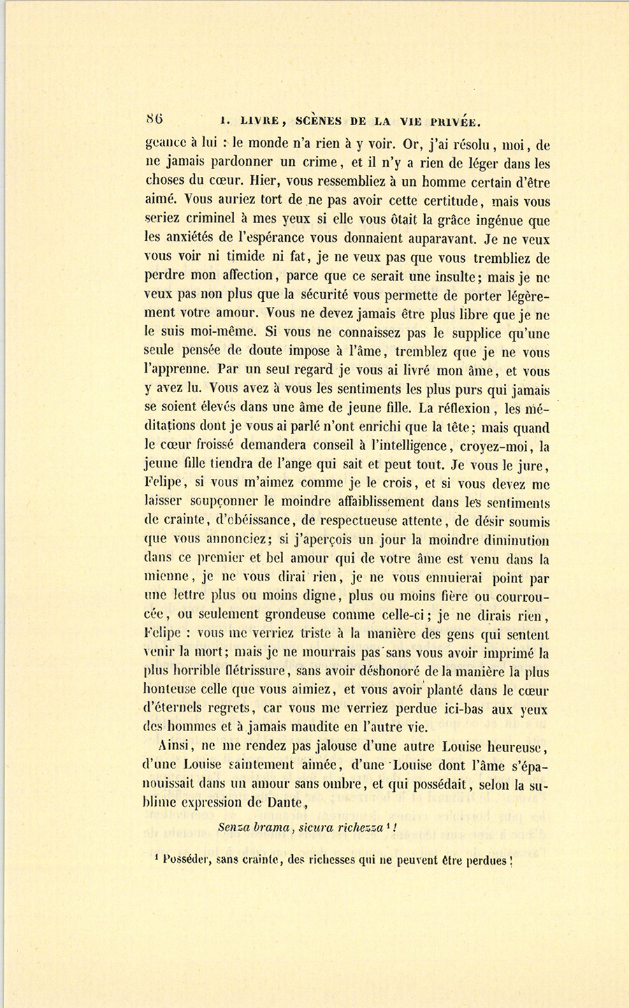 Voici quelles mesures j’ai prises pour cacher mon bonheur, car je souhaite éviter toute espèce d’occasion à ma jalousie. Je ressemble à cette belle princesse italienne qui courait comme une lionne ronger son amour dans quelque ville de Suisse, après avoir fondu sur sa proie comme une lionne. Aussi ne te parlé-je de mes dispositions que pour te demander une autre grâce, celle de ne jamais venir nous voir sans que je t’en aie priée moi-même, et de respecter la solitude dans laquelle je veux vivre.