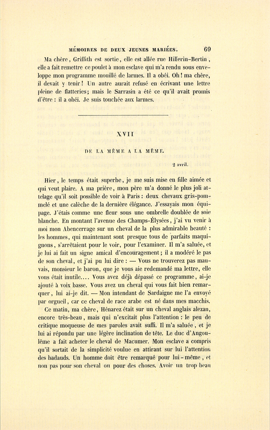 {p. 157} Je ne reviendrai plus sur ce pacte fait entre moi-même et le moi que je vais devenir ; je te l’ai confié pour que tu connusses l’étendue de tes devoirs. Je me marie séparée de biens, et tout en sachant que je suis assez riche pour que nous puissions vivre à notre aise, Gaston ignore quelle est ma fortune. En vingt-quatre heures je distribuerai ma fortune à mon gré. Comme je ne veux rien d’humiliant, j’ai fait mettre douze mille francs de rente à son nom ; il les trouvera dans son secrétaire la veille de notre mariage ; et s’il ne les acceptait pas, je suspendrais tout. Il a fallu la menace de ne pas l’épouser pour obtenir le droit de payer ses dettes. Je suis lasse de t’avoir écrit ces aveux ; après-demain je t’en dirai davantage, car je suis obligée d’aller demain à la campagne pour toute la journée.