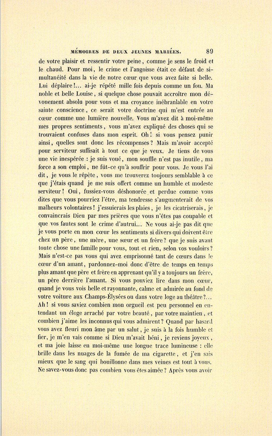 Quand tu m’as permis de t’aimer, ma douce Renée, j’ai cru au bonheur ; mais aujourd’hui je n’en vois plus la fin. Le passé n’est plus qu’un vague souvenir, une ombre nécessaire à faire ressortir l’éclat de ma félicité. Quand je suis près de toi, l’amour me transporte au point que je suis hors d’état de t’exprimer l’étendue de mon affection : je ne puis que t’admirer, t’adorer. La parole ne me revient que loin de toi. Tu es parfaitement belle, et d’une beauté si grave, si majestueuse, que le temps l’altérera difficilement ; et, quoique l’amour entre époux ne tienne pas tant à la beauté qu’aux sentiments, qui sont exquis en toi, laisse-moi te dire que cette certitude de te voir toujours belle me donne une joie qui s’accroît à chaque regard que je jette sur toi. L’harmonie et la dignité des lignes de ton visage, où ton âme sublime se révèle, a je ne sais quoi de pur sous la mâle couleur du teint. L’éclat de tes yeux noirs et la coupe hardie de ton front disent combien tes vertus sont élevées, combien ton commerce est solide et ton cœur fait aux orages de la vie s’il en survenait. La noblesse est ton caractère distinctif ; je n’ai pas la prétention de te l’apprendre ; mais je t’écris ce mot pour te faire bien connaître que je sais tout le prix du trésor que je possède. Le peu que tu m’accorderas sera toujours le bonheur pour moi, dans long-temps comme à présent ; car je sens tout ce qu’il y a eu de grandeur dans notre promesse de garder l’un et l’autre toute notre liberté. Nous ne devrons jamais aucun témoignage de tendresse qu’à notre vouloir. Nous serons libres malgré des chaînes étroites. Je serai d’autant plus fier {p. 59} de te reconquérir ainsi que je sais maintenant le prix que tu attaches à cette conquête. Tu ne pourras jamais parler ou respirer, agir, penser, sans que j’admire toujours davantage la grâce de ton corps et celle de ton âme. Il y a en toi je ne sais quoi de divin, de sensé, d’enchanteur, qui met d’accord la réflexion, l’honneur, le plaisir et l’espérance, qui donne enfin à l’amour une étendue plus spacieuse que celle de la vie. Oh ! mon ange, puisse le génie de l’amour me rester fidèle et l’avenir être plein de cette volupté à l’aide de laquelle tu as embelli tout autour de moi ! Quand seras-tu mère, pour que je te voie applaudir à l’énergie de ta vie, pour que je t’entende, de cette voix si suave et avec ces idées si fines, si neuves et si curieusement bien rendues, bénir l’amour qui a rafraîchi mon âme, retrempé mes facultés, qui fait mon orgueil, et où j’ai puisé, comme dans une magique fontaine, une vie nouvelle ? Oui, je serai tout ce que tu veux que je sois : je deviendrai l’un des hommes utiles de mon pays, et je ferai rejaillir sur toi cette gloire dont le principe sera ta satisfaction.