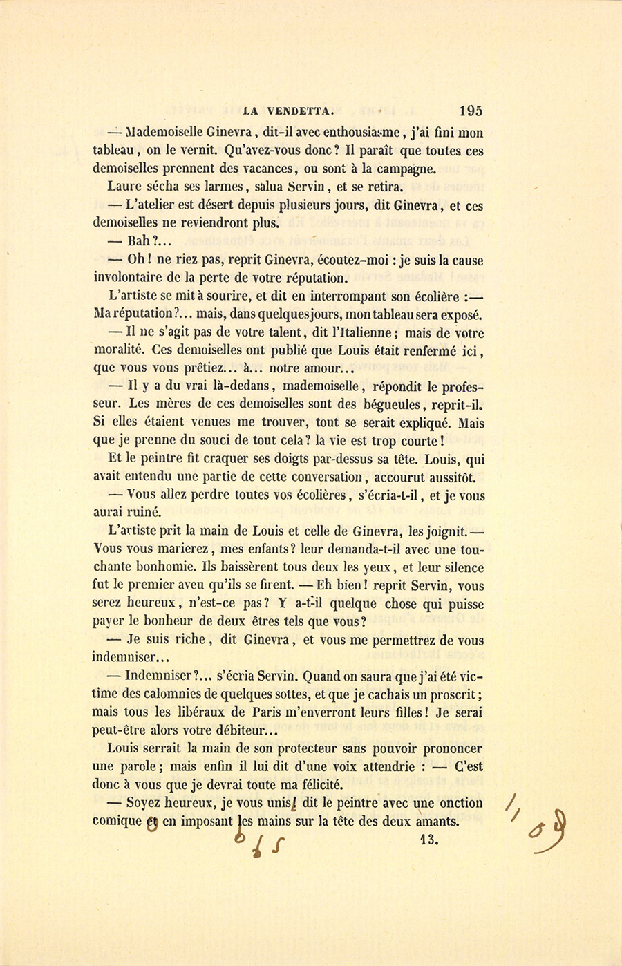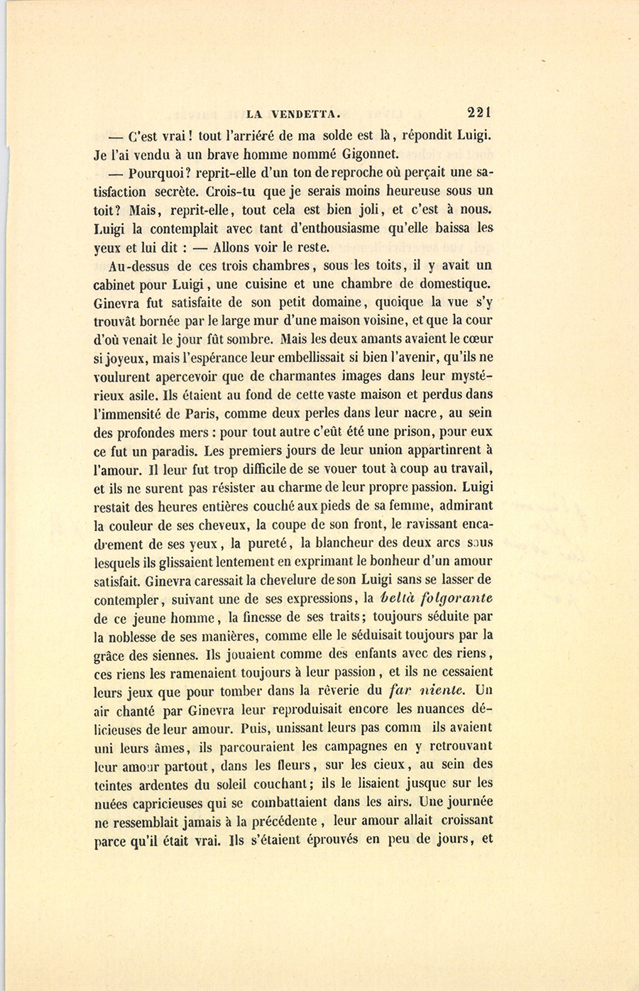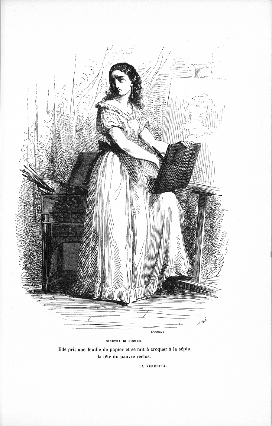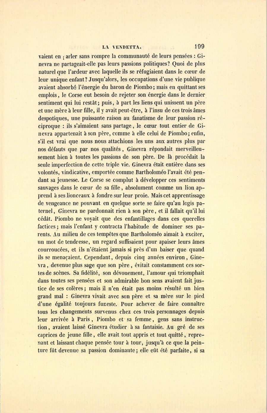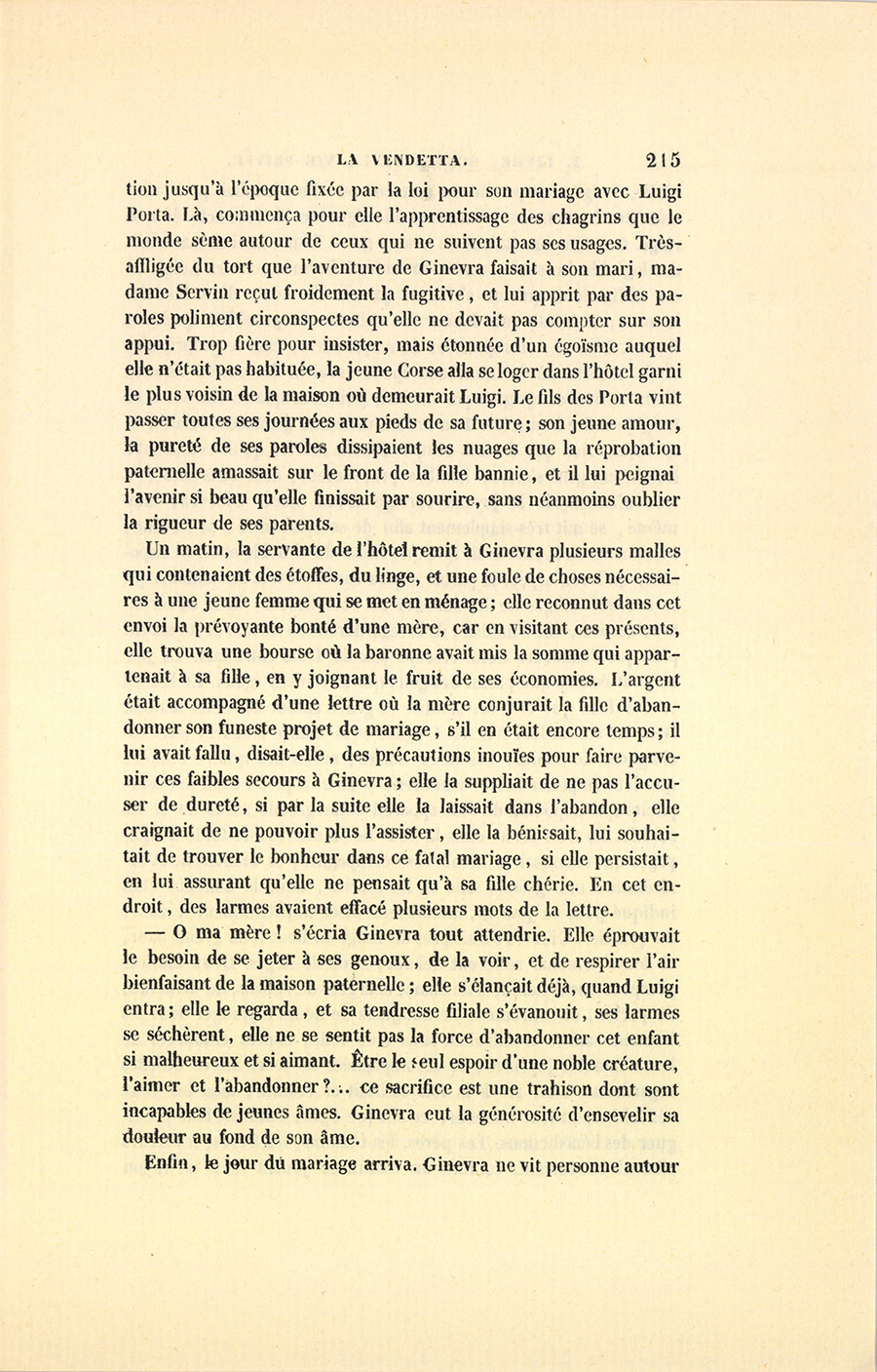 Le lendemain du jour où Ginevra quitta la maison de son père, elle alla prier madame Servin de lui accorder un asile et sa {p. 215} protection jusqu’à l’époque fixée par la loi pour son mariage avec Luigi Porta. Là, commença pour elle l’apprentissage des chagrins que le monde sème autour de ceux qui ne suivent pas ses usages. Très-affligée du tort que l’aventure de Ginevra faisait à son mari, madame Servin reçut froidement la fugitive, et lui apprit par des paroles poliment circonspectes qu’elle ne devait pas compter sur son appui. Trop fière pour insister, mais étonnée d’un égoïsme auquel elle n’était pas habituée, la jeune Corse alla se loger dans l’hôtel garni le plus voisin de la maison où demeurait Luigi. Le fils des Porta vint passer toutes ses journées aux pieds de sa future ; son jeune amour, la pureté de ses paroles dissipaient les nuages que la réprobation paternelle amassait sur le front de la fille bannie, et il lui peignait l’avenir si beau qu’elle finissait par sourire, sans néanmoins oublier la rigueur de ses parents.