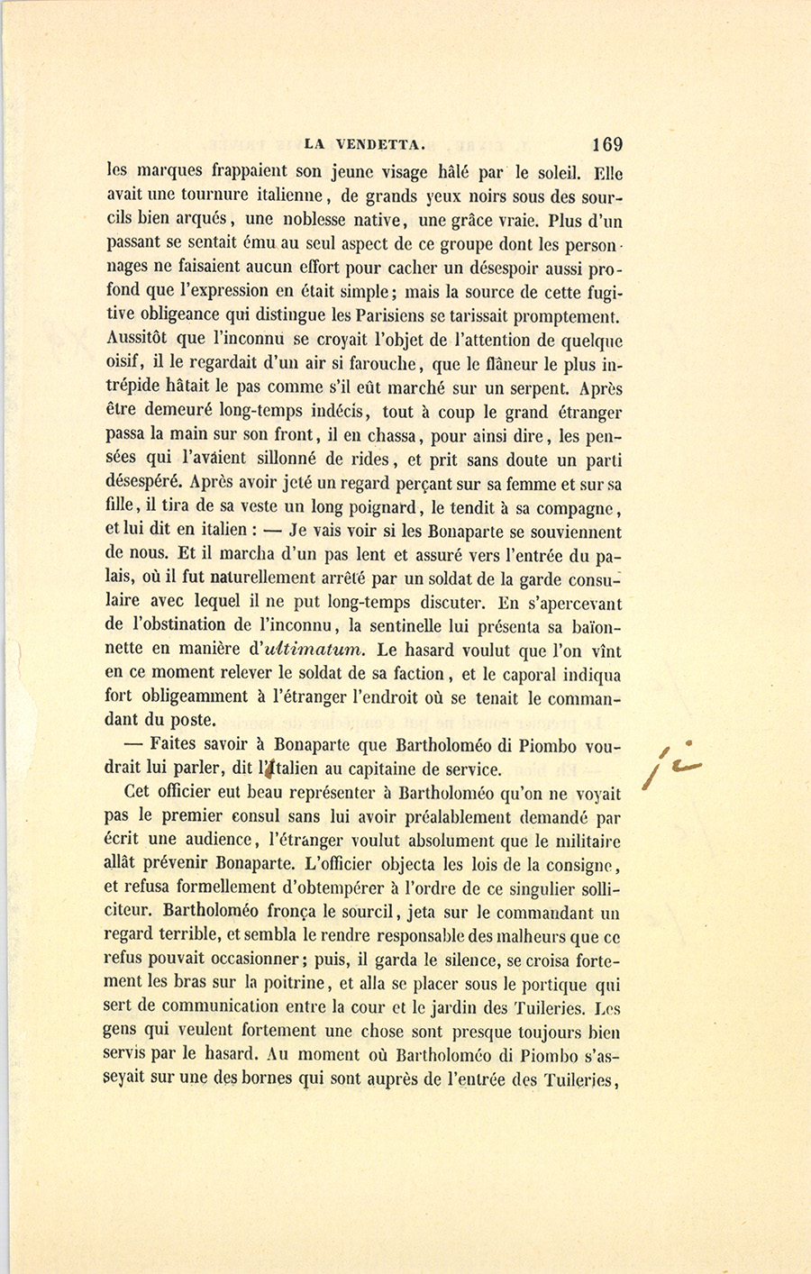 En 1800, vers la fin du mois d’octobre, un étranger, accompagné d’une femme et d’une petite fille, arriva devant les Tuileries à Paris, et se tint assez long-temps auprès des décombres d’une maison récemment démolie, à l’endroit où s’élève aujourd’hui l’aile commencée qui devait unir le château de Catherine de Médicis au Louvre des Valois. Il resta là, debout, les bras croisés, la tête inclinée et la relevait parfois pour regarder alternativement le palais consulaire, et sa femme assise auprès de lui sur une pierre. Quoique l’inconnue parût ne s’occuper que de la petite fille âgée de neuf à dix ans dont les longs cheveux noirs étaient comme un amusement entre ses mains, elle ne perdait aucun des regards que lui adressait son compagnon. Un même sentiment, autre que l’amour, unissait ces deux êtres, et animait d’une même inquiétude leurs mouvements et leurs pensées. La misère est peut-être le plus puissant de tous les liens. L’étranger avait une de ces têtes abondantes en cheveux, larges et graves, qui se sont souvent offertes au pinceau des Carraches. Ces cheveux si noirs étaient mélangés d’une grande quantité de cheveux blancs. Quoique nobles et fiers, ses traits avaient un ton de dureté qui les gâtait. Malgré sa force et sa taille droite, il semblait avoir plus de soixante ans. Ses vêtements délabrés annonçaient qu’il venait d’un pays étranger. Quoique la figure jadis belle et alors flétrie de la femme trahît une tristesse profonde, quand son mari la regardait elle s’efforçait de sourire en affectant une contenance calme. La petite fille restait debout, malgré la fatigue dont {p. 169} les marques frappaient son jeune visage hâlé par le soleil. Elle avait une tournure italienne, de grands yeux noirs sous des sourcils bien arqués, une noblesse native, une grâce vraie. Plus d’un passant se sentait ému au seul aspect de ce groupe dont les personnages ne faisaient aucun effort pour cacher un désespoir aussi profond que l’expression en était simple ; mais la source de cette fugitive obligeance qui distingue les Parisiens se tarissait promptement. Aussitôt que l’inconnu se croyait l’objet de l’attention de quelque oisif, il le regardait d’un air si farouche, que le flâneur le plus intrépide hâtait le pas comme s’il eût marché sur un serpent. Après être demeuré long-temps indécis, tout à coup le grand étranger passa la main sur son front, il en chassa, pour ainsi dire, les pensées qui l’avaient sillonné de rides, et prit sans doute un parti désespéré. Après avoir jeté un regard perçant sur sa femme et sur sa fille, il tira de sa veste un long poignard, le tendit à sa compagne, et lui dit en italien : – Je vais voir si les Bonaparte se souviennent de nous. Et il marcha d’un pas lent et assuré vers l’entrée du palais, où il fut naturellement arrêté par un soldat de la garde consulaire avec lequel il ne put long-temps discuter. En s’apercevant de l’obstination de l’inconnu, la sentinelle lui présenta sa baïonnette en manière d’ultimatum. Le hasard voulut que l’on vînt en ce moment relever le soldat de sa faction, et le caporal indiqua fort obligeamment à l’étranger l’endroit où se tenait le commandant du poste.
