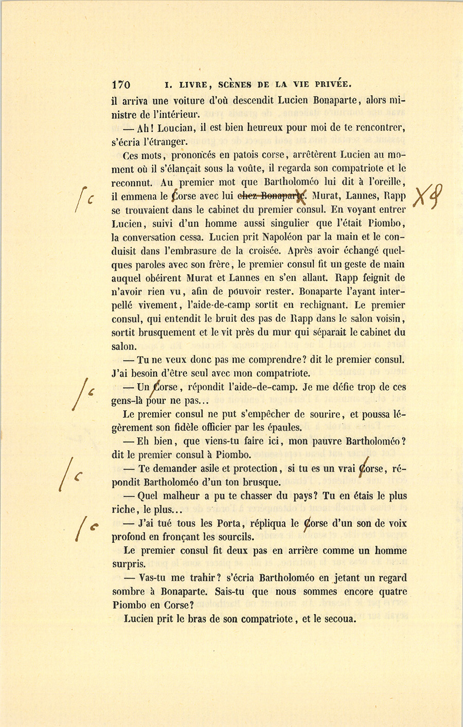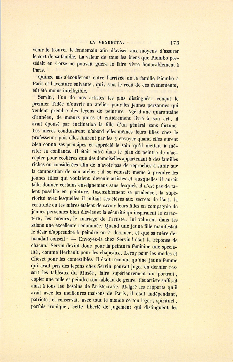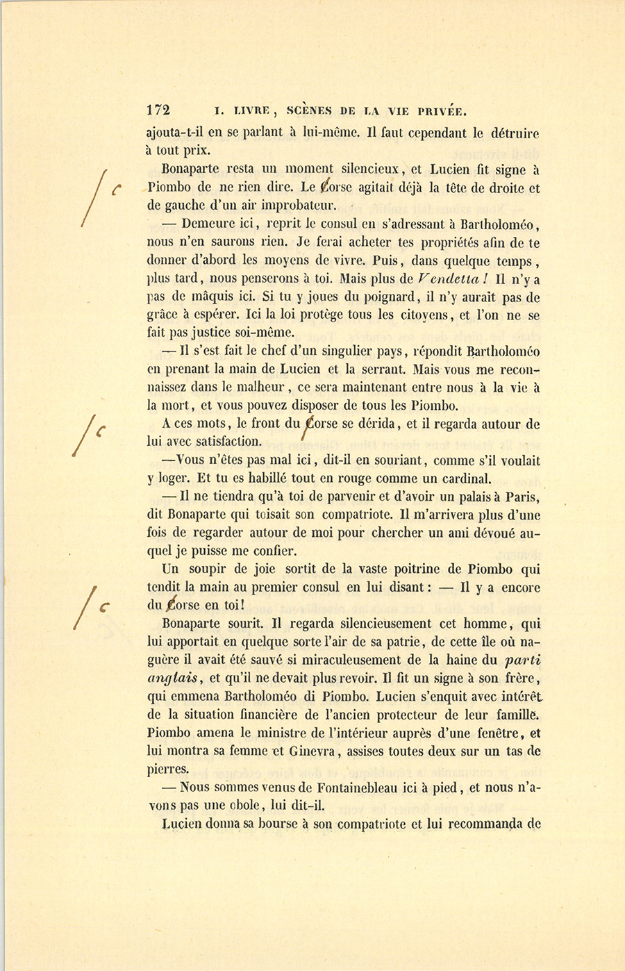 Lucien donna sa bourse à son compatriote et lui recommanda de {p. 173} venir le trouver le lendemain afin d’aviser aux moyens d’assurer le sort de sa famille. La valeur de tous les biens que Piombo possédait en Corse ne pouvait guère le faire vivre honorablement à Paris.