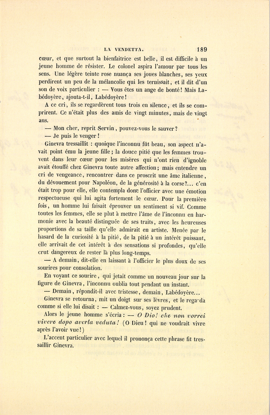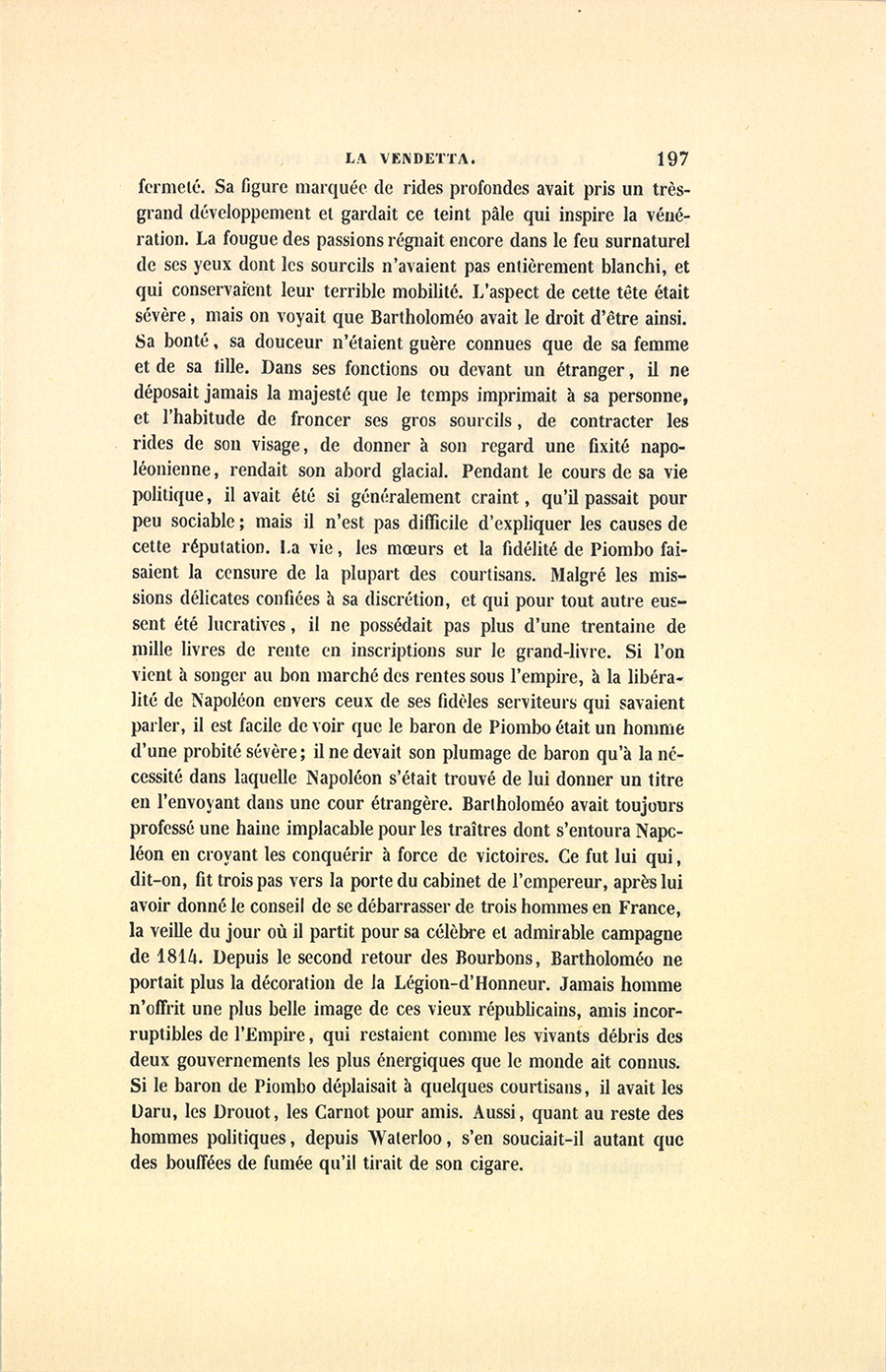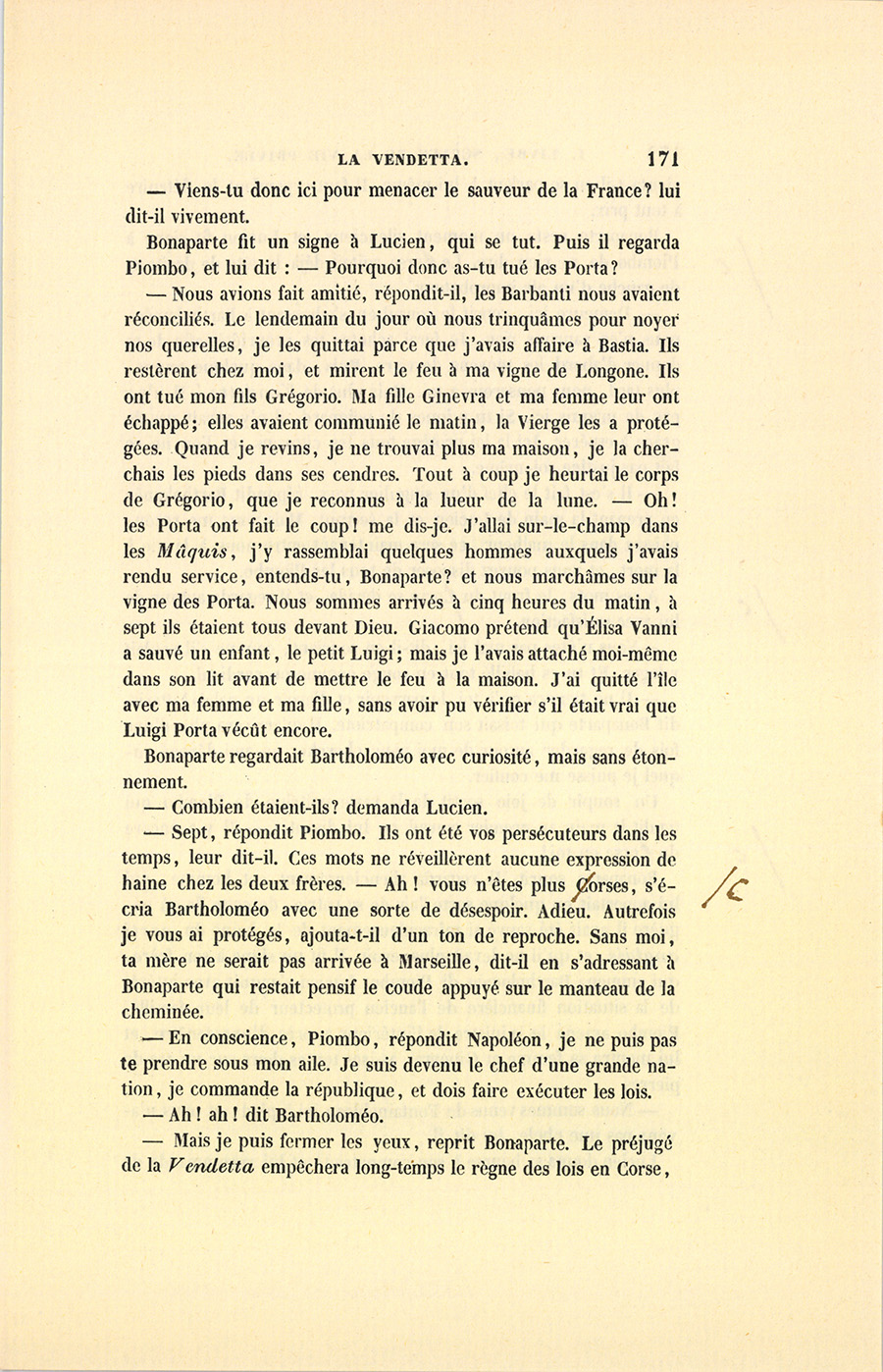 – Mais je puis fermer les yeux, reprit Bonaparte. Le préjugé de la Vendetta empêchera long-temps le règne des lois en Corse, {p. 172} ajouta-t-il en se parlant à lui-même. Il faut cependant le détruire à tout prix.