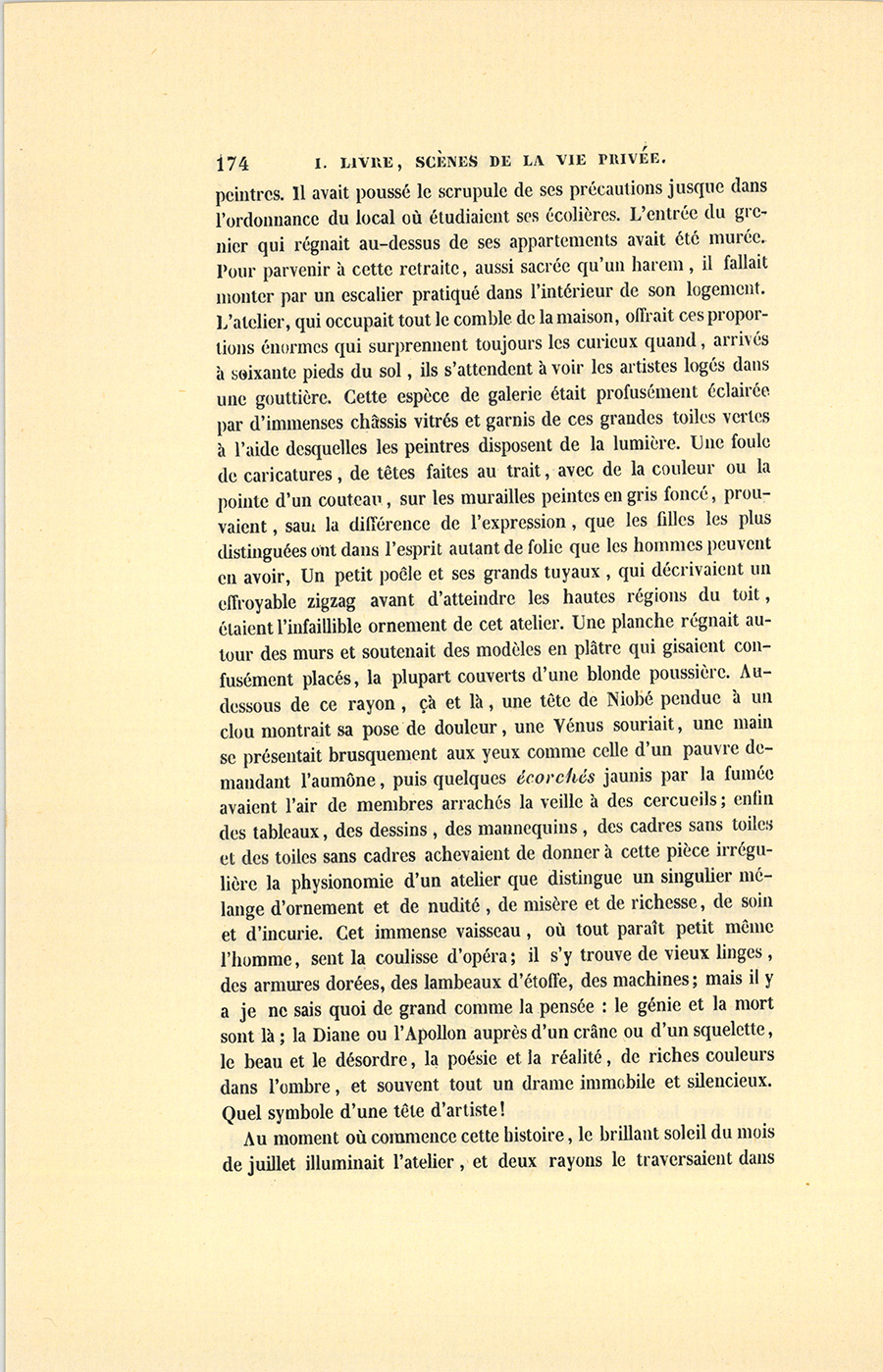 Au moment où commence cette histoire, le brillant soleil du mois de juillet illuminait l’atelier, et deux rayons le traversaient dans {p. 175} sa profondeur en y traçant de larges bandes d’or diaphanes où brillaient des grains de poussière. Une douzaine de chevalets élevaient leurs flèches aiguës, semblables à des mâts de vaisseau dans un port. Plusieurs jeunes filles animaient cette scène par la variété de leurs physionomies, de leurs attitudes, et par la différence de leurs toilettes. Les fortes ombres que jetaient les serges vertes, placées suivant les besoins de chaque chevalet, produisaient une multitude de contrastes, de piquants effets de clair-obscur. Ce groupe formait le plus beau de tous les tableaux de l’atelier. Une jeune fille blonde et mise simplement se tenait loin de ses compagnes, travaillait avec courage en paraissant prévoir le malheur ; nulle ne la regardait, ne lui adressait la parole : elle était la plus jolie, la plus modeste et la moins riche. Deux groupes principaux, séparés l’un de l’autre par une faible distance, indiquaient deux sociétés, deux esprits jusque dans cet atelier où les rangs et la fortune auraient dû s’oublier. Assises ou debout, ces jeunes filles, entourées de leurs boîtes à couleurs, jouant avec leurs pinceaux ou les préparant, maniant leurs éclatantes palettes, peignant, parlant, riant, chantant, abandonnées à leur naturel, laissant voir leur caractère, composaient un spectacle inconnu aux hommes : celle-ci, fière, hautaine, capricieuse, aux cheveux noirs, aux belles mains, lançait au hasard la flamme de ses regards ; celle-là, insouciante et gaie, le sourire sur les lèvres, les cheveux châtains, les mains blanches et délicates, vierge française, légère, sans arrière-pensée, vivant de sa vie actuelle ; une autre, rêveuse, mélancolique, pâle, penchant la tête comme une fleur qui tombe ; sa voisine, au contraire, grande, indolente, aux habitudes musulmanes, l’œil long, noir, humide ; parlant peu, mais songeant et regardant à la dérobée la tête d’Antinoüs. Au milieu d’elles, comme le jocoso d’une pièce espagnole, pleine d’esprit et de saillies épigrammatiques, une fille les espionnait toutes d’un seul coup d’œil, les faisait rire et levait sans cesse sa figure trop vive pour n’être pas jolie ; elle commandait au premier groupe des écolières qui comprenait les filles de banquier, de notaire et de négociant ; toutes riches, mais essuyant toutes les dédains imperceptibles quoique poignants que leur prodiguaient les autres jeunes personnes appartenant à l’aristocratie. Celles-ci étaient gouvernées par la fille d’un huissier du cabinet du roi, petite créature aussi sotte que vaine, et fière d’avoir pour père un homme ayant une charge à la Cour ; elle voulait toujours paraître avoir {p. 176} compris du premier coup les observations du maître, et semblait travailler par grâce ; elle se servait d’un lorgnon, ne venait que très parée, tard, et suppliait ses compagnes de parler bas. Dans ce second groupe, on eût remarqué des tailles délicieuses, des figures distinguées ; mais les regards de ces jeunes filles offraient peu de naïveté. Si leurs attitudes étaient élégantes et leurs mouvements gracieux, les figures manquaient de franchise, et l’on devinait facilement qu’elles appartenaient à un monde où la politesse façonne de bonne heure les caractères, où l’abus des jouissances sociales tue les sentiments et développe l’égoïsme. Lorsque cette réunion était complète, il se trouvait dans le nombre de ces jeunes filles des têtes enfantines, des vierges d’une pureté ravissante, des visages dont la bouche légèrement entr’ouverte laissait voir des dents vierges, et sur laquelle errait un sourire de vierge. L’atelier ne ressemblait pas alors à un sérail, mais à un groupe d’anges assis sur un nuage dans le ciel.