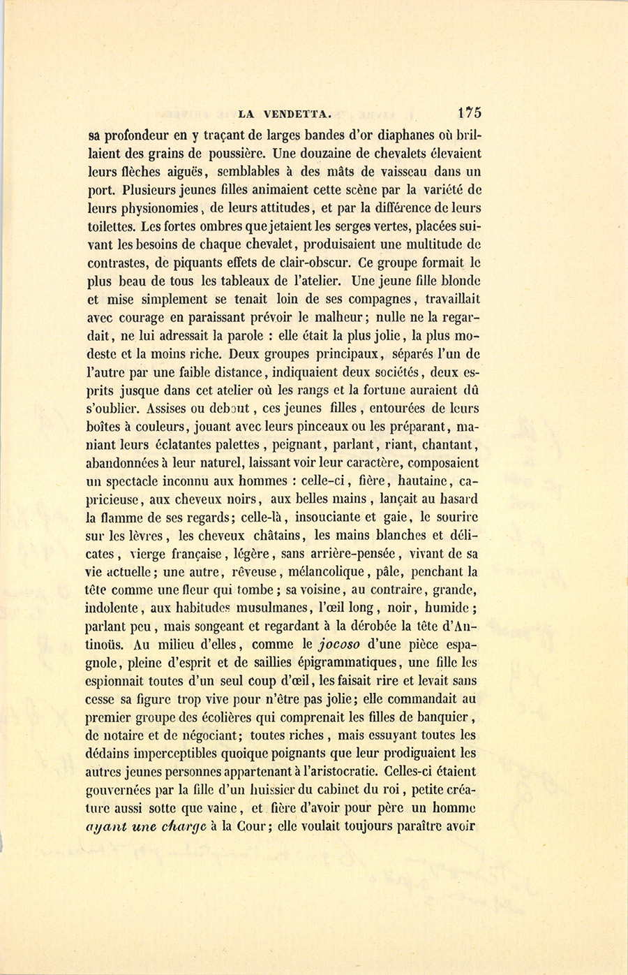 Les jeunes personnes qui composaient le groupe des nobles appartenaient aux familles royalistes les plus exaltées de Paris. Il serait difficile de donner une idée des exagérations de cette époque et de l’horreur que causaient les bonapartistes. Quelque insignifiante et petite que puisse paraître aujourd’hui l’action d’Amélie Thirion, elle était alors une expression de haine fort naturelle. Ginevra Piombo, l’une des premières écolières de Servin, occupait la place dont on voulait la priver depuis le jour où elle était venue à l’atelier ; le groupe aristocratique l’avait insensiblement entourée : la chasser d’une place qui lui appartenait en quelque sorte était non-seulement lui faire injure, mais lui causer une espèce de peine ; car les artistes ont tous une place de prédilection pour leur travail. Mais l’animadversion politique entrait peut-être pour peu de chose dans la conduite de ce petit Côté Droit de l’atelier. Ginevra Piombo, la plus forte des élèves de Servin, était l’objet d’une profonde jalousie : le maître professait autant d’admiration pour les talents que pour le caractère de cette élève favorite qui servait de terme à toutes ses comparaisons ; enfin, sans qu’on s’expliquât l’ascendant que cette jeune personne obtenait sur tout ce qui l’entourait, elle exerçait sur ce petit monde un prestige presque semblable à celui de Bonaparte sur ses soldats. L’aristocratie de l’atelier avait résolu depuis plusieurs jours la chute de cette reine ; mais, personne n’ayant encore osé s’éloigner de la bonapartiste, mademoiselle Thirion venait de frapper un coup décisif, afin de rendre ses compagnes complices de sa haine. Quoique Ginevra fût sincèrement aimée par deux ou trois des Royalistes, presque toutes chapitrées au logis paternel relativement à la politique, elles jugèrent avec ce tact particulier aux femmes qu’elles devaient rester indifférentes à la querelle. À son arrivée, Ginevra fut donc accueillie par un profond silence. De toutes les jeunes filles venues jusqu’alors dans l’atelier de Servin, elle était la plus belle, la plus grande et la mieux faite. Sa démarche possédait un caractère de noblesse et de grâce qui commandait le respect. Sa figure empreinte d’intelligence semblait rayonner, tant y {p. 179} respirait cette animation particulière aux corses et qui n’exclut point le calme. Ses longs cheveux, ses yeux et ses cils noirs exprimaient la passion. Quoique les coins de sa bouche se dessinassent mollement et que ses lèvres fussent un peu trop fortes, il s’y peignait cette bonté que donne aux êtres forts la conscience de leur force. Par un singulier caprice de la nature, le charme de son visage se trouvait en quelque sorte démenti par un front de marbre où se peignait une fierté presque sauvage, où respiraient les mœurs de la Corse. Là était le seul lien qu’il y eût entre elle et son pays natal : dans tout le reste de sa personne, la simplicité, l’abandon des beautés lombardes séduisaient si bien qu’il fallait ne pas la voir pour lui causer la moindre peine. Elle inspirait un si vif attrait que, par prudence, son vieux père la faisait accompagner jusqu’à l’atelier. Le seul défaut de cette créature véritablement poétique venait de la puissance même d’une beauté si largement développée : elle avait l’air d’être femme. Elle s’était refusée au mariage, par amour pour son père et sa mère, en se sentant nécessaire à leurs vieux jours. Son goût pour la peinture avait remplacé les passions qui agitent ordinairement les femmes.
