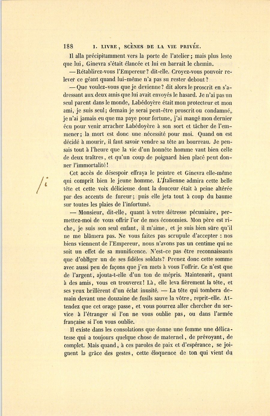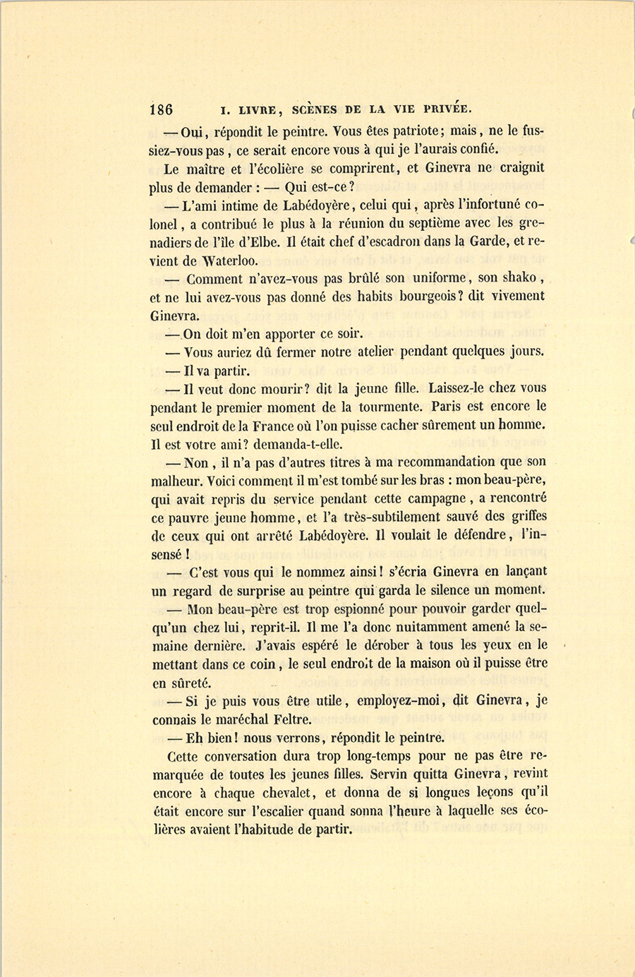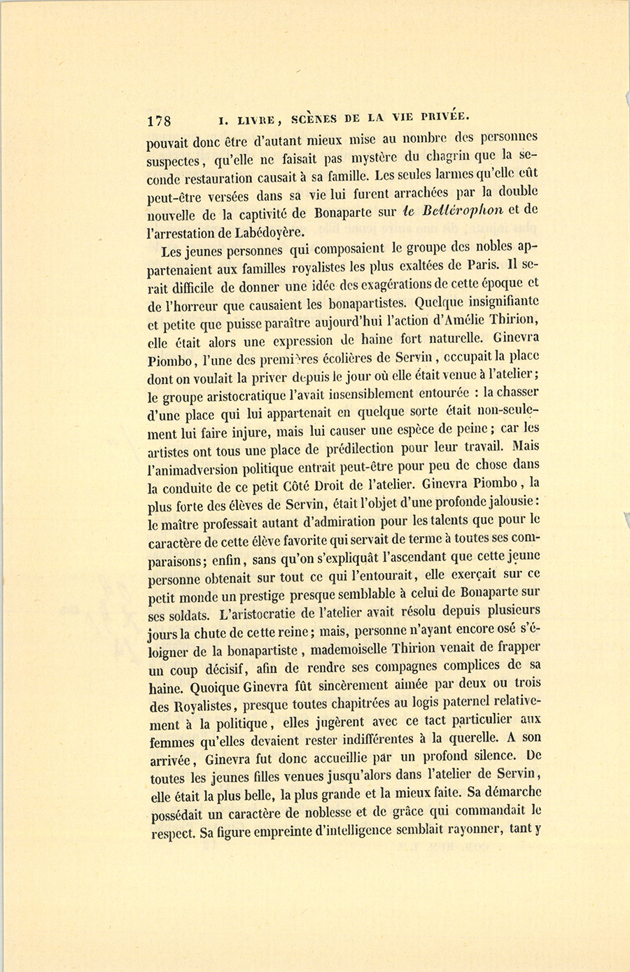 Pour comprendre l’importance de l’ostracisme exercé par Amélie Thirion, il est nécessaire d’ajouter que cette scène avait lieu vers la fin du mois de juillet 1815. Le second retour des Bourbons venait de troubler bien des amitiés qui avaient résisté au mouvement de la première restauration. En ce moment les familles presque toutes divisées d’opinion, renouvelaient plusieurs de ces déplorables scènes qui souillent l’histoire de tous les pays aux époques de guerre civile ou religieuse. Les enfants, les jeunes filles, les vieillards partageaient la fièvre monarchique à laquelle le gouvernement était en proie. La discorde se glissait sous tous les toits, et la défiance teignait de ses sombres couleurs les actions et les discours les plus intimes. Ginevra Piombo aimait Napoléon avec idolâtrie, et comment aurait-elle pu le haïr ? l’Empereur était son compatriote et le bienfaiteur de son père. Le baron de Piombo était un des serviteurs de Napoléon qui avaient coopéré le plus efficacement au retour de l’île d’Elbe. Incapable de renier sa foi politique, jaloux même de la confesser, le vieux baron de Piombo restait à Paris au milieu de ses ennemis. Ginevra Piombo {p. 178} pouvait donc être d’autant mieux mise au nombre des personnes suspectes, qu’elle ne faisait pas mystère du chagrin que la seconde restauration causait à sa famille. Les seules larmes qu’elle eût peut-être versées dans sa vie lui furent arrachées par la double nouvelle de la captivité de Bonaparte sur le Bellérophon et de l’arrestation de Labédoyère.