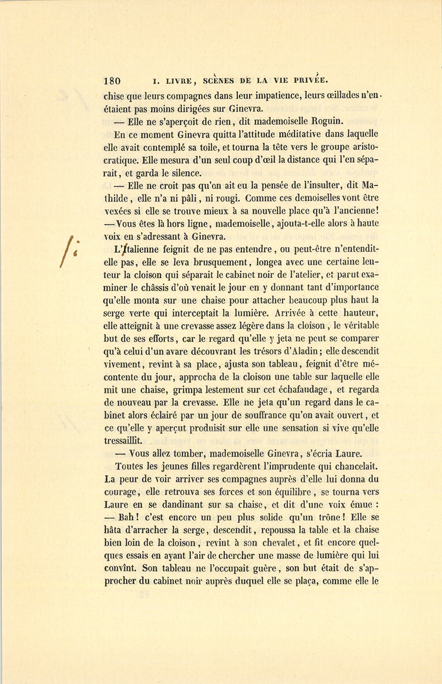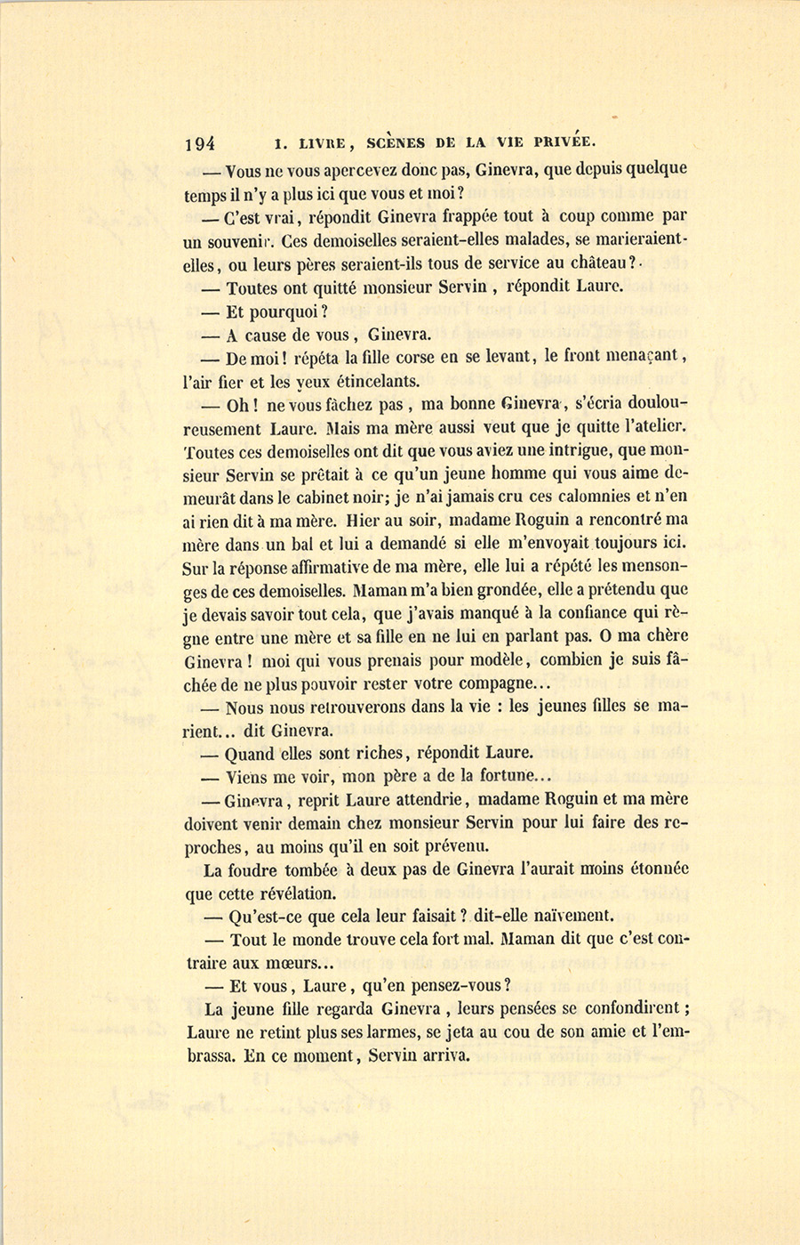– Mademoiselle Ginevra, dit-il après avoir jeté un coup d’œil sur l’atelier, pourquoi vous êtes-vous mise là ? Le jour est mauvais. Approchez-vous donc de ces demoiselles, et descendez un peu votre rideau.