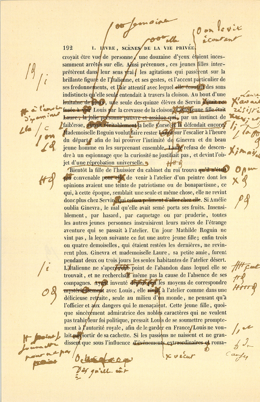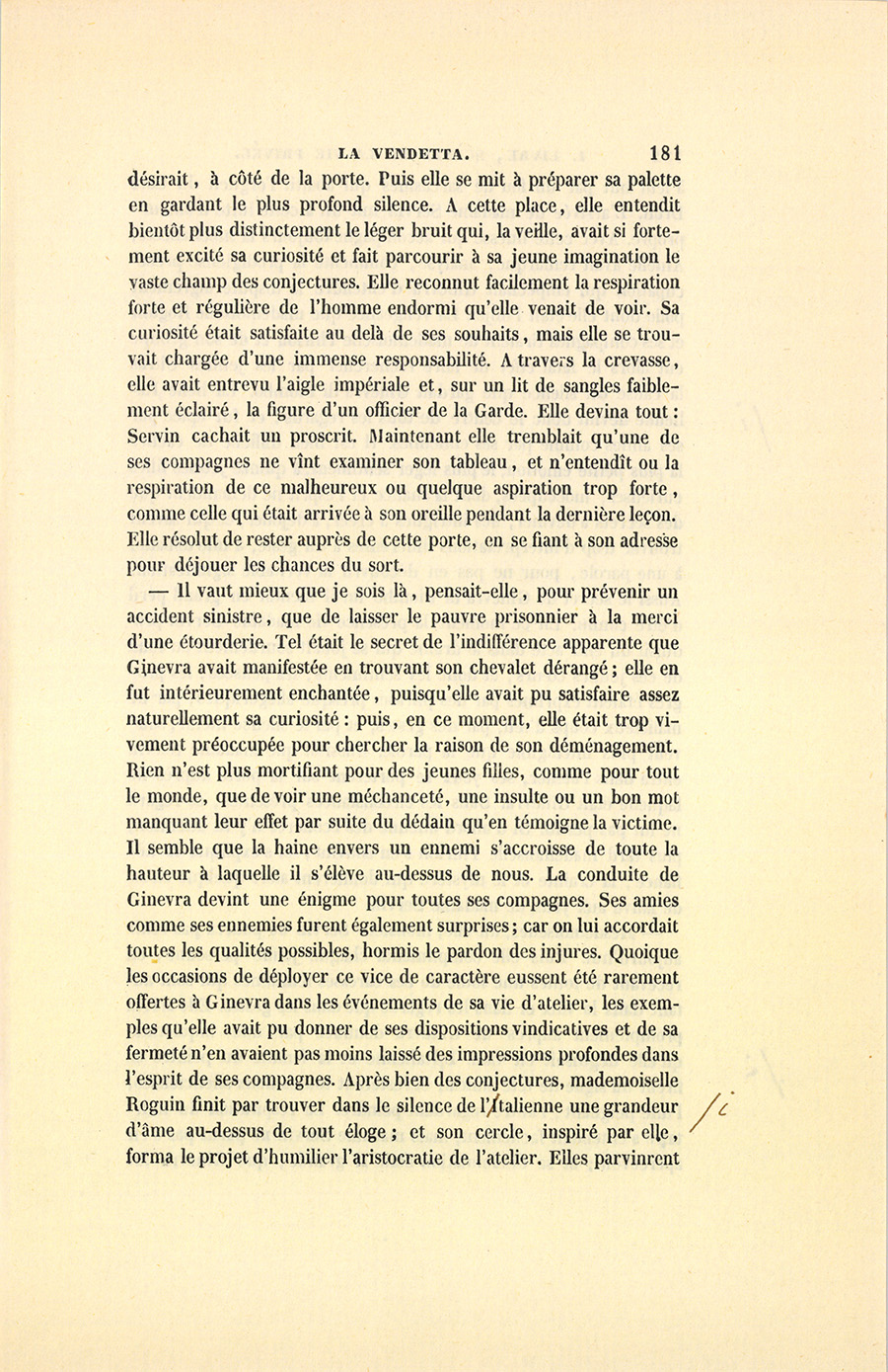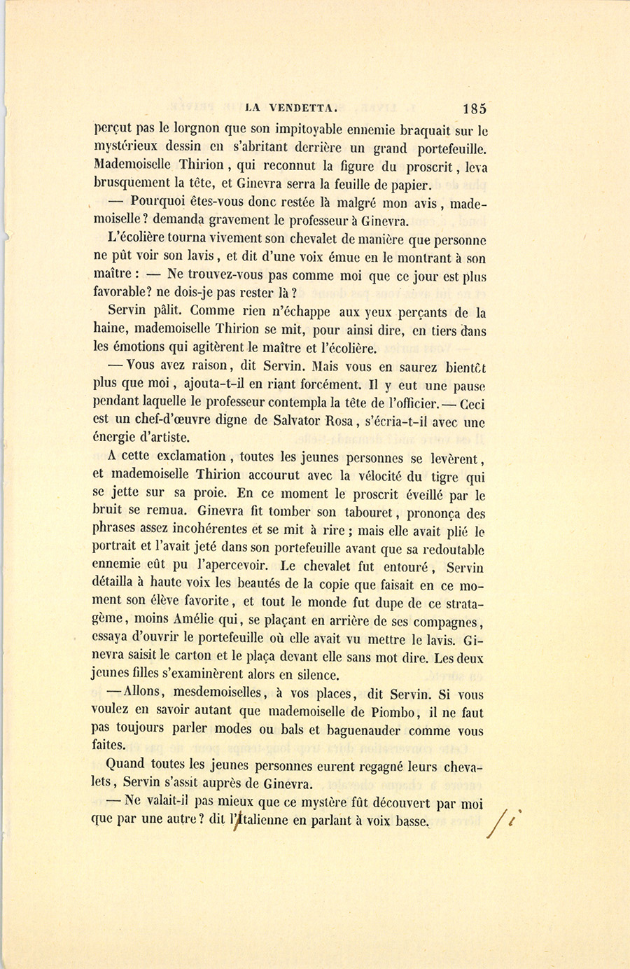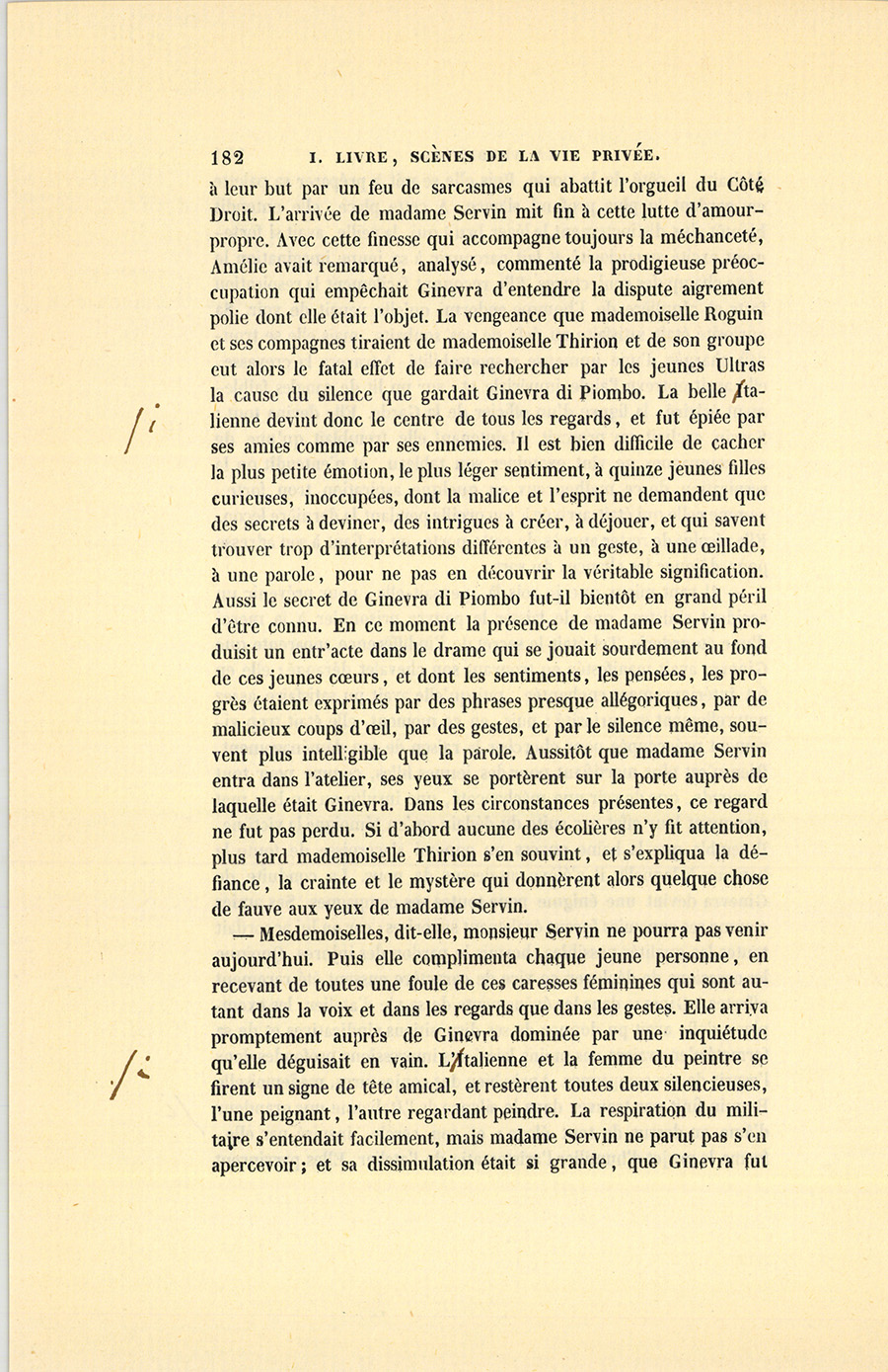 – Il vaut mieux que je sois là, pensait-elle, pour prévenir un accident sinistre, que de laisser le pauvre prisonnier à la merci d’une étourderie. Tel était le secret de l’indifférence apparente que Ginevra avait manifestée en trouvant son chevalet dérangé ; elle en fut intérieurement enchantée, puisqu’elle avait pu satisfaire assez naturellement sa curiosité : puis, en ce moment, elle était trop vivement préoccupée pour chercher la raison de son déménagement. Rien n’est plus mortifiant pour des jeunes filles, comme pour tout le monde, que de voir une méchanceté, une insulte ou un bon mot manquant leur effet par suite du dédain qu’en témoigne la victime. Il semble que la haine envers un ennemi s’accroisse de toute la hauteur à laquelle il s’élève au-dessus de nous. La conduite de Ginevra devint une énigme pour toutes ses compagnes. Ses amies comme ses ennemies furent également surprises ; car on lui accordait toutes les qualités possibles, hormis le pardon des injures. Quoique les occasions de déployer ce vice de caractère eussent été rarement offertes à Ginevra dans les événements de sa vie d’atelier, les exemples qu’elle avait pu donner de ses dispositions vindicatives et de sa fermeté n’en avaient pas moins laissé des impressions profondes dans l’esprit de ses compagnes. Après bien des conjectures, mademoiselle Roguin finit par trouver dans le silence de l’italienne une grandeur d’âme au-dessus de tout éloge ; et son cercle, inspiré par elle, forma le projet d’humilier l’aristocratie de l’atelier. Elles parvinrent {p. 182} à leur but par un feu de sarcasmes qui abattit l’orgueil du Côté Droit. L’arrivée de madame Servin mit fin à cette lutte d’amour-propre. Avec cette finesse qui accompagne toujours la méchanceté, Amélie avait remarqué, analysé, commenté la prodigieuse préoccupation qui empêchait Ginevra d’entendre la dispute aigrement polie dont elle était l’objet. La vengeance que mademoiselle Roguin et ses compagnes tiraient de mademoiselle Thirion et de son groupe eut alors le fatal effet de faire rechercher par les jeunes Ultras la cause du silence que gardait Ginevra di Piombo. La belle italienne devint donc le centre de tous les regards, et fut épiée par ses amies comme par ses ennemies. Il est bien difficile de cacher la plus petite émotion, le plus léger sentiment, à quinze jeunes filles curieuses, inoccupées, dont la malice et l’esprit ne demandent que des secrets à deviner, des intrigues à créer, à déjouer, et qui savent trouver trop d’interprétations différentes à un geste, à une œillade, à une parole, pour ne pas en découvrir la véritable signification. Aussi le secret de Ginevra di Piombo fut-il bientôt en grand péril d’être connu. En ce moment la présence de madame Servin produisit un entr’acte dans le drame qui se jouait sourdement au fond de ces jeunes cœurs, et dont les sentiments, les pensées, les progrès étaient exprimés par des phrases presque allégoriques, par de malicieux coups d’œil, par des gestes, et par le silence même, souvent plus intelligible que la parole. Aussitôt que madame Servin entra dans l’atelier, ses yeux se portèrent sur la porte auprès de laquelle était Ginevra. Dans les circonstances présentes, ce regard ne fut pas perdu. Si d’abord aucune des écolières n’y fit attention, plus tard mademoiselle Thirion s’en souvint, et s’expliqua la défiance, la crainte et le mystère qui donnèrent alors quelque chose de fauve aux yeux de madame Servin.