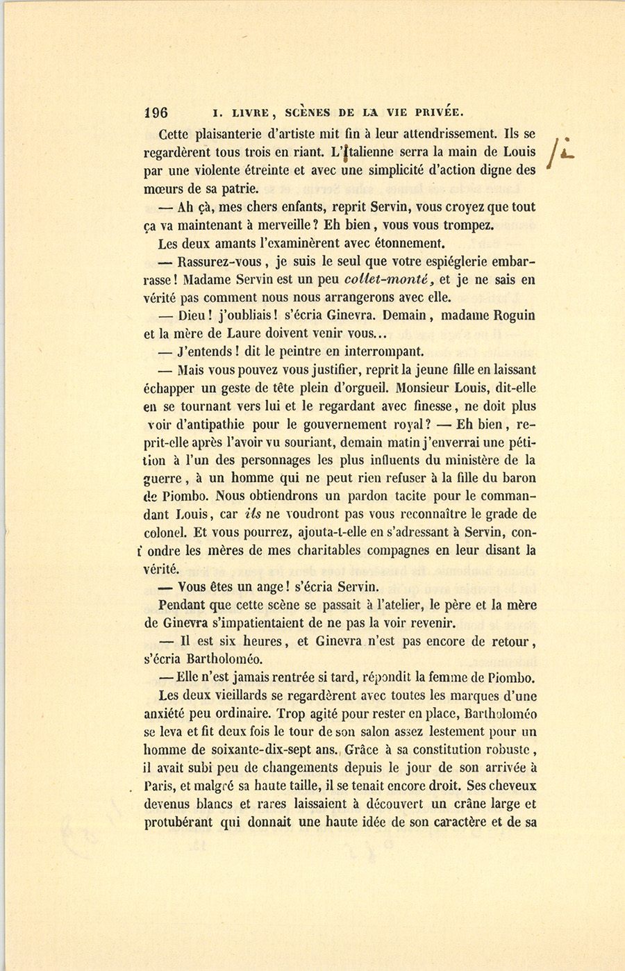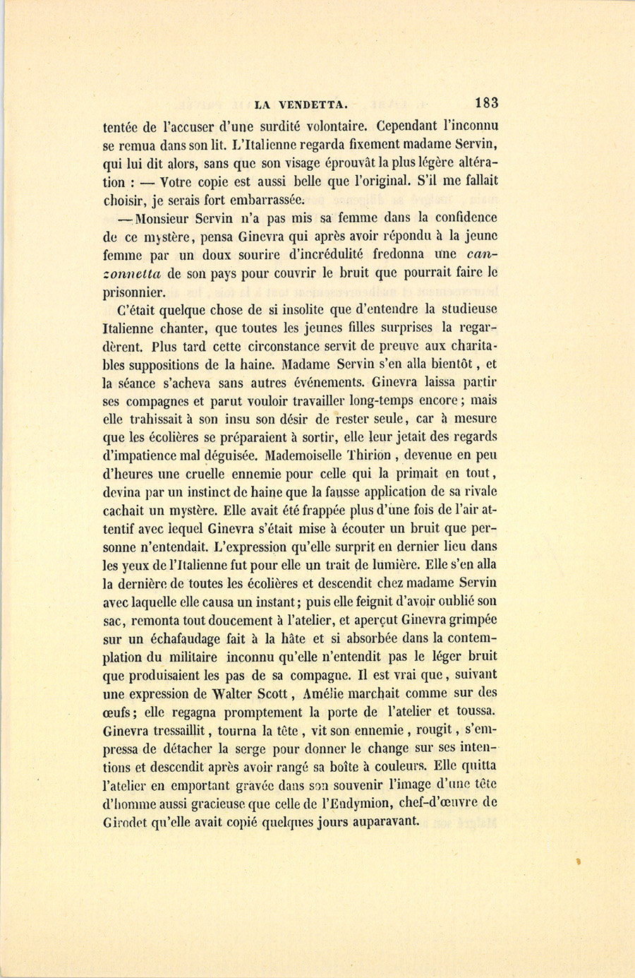 – Mesdemoiselles, dit-elle, monsieur Servin ne pourra pas venir aujourd’hui. Puis elle complimenta chaque jeune personne, en recevant de toutes une foule de ces caresses féminines qui sont autant dans la voix et dans les regards que dans les gestes. Elle arriva promptement auprès de Ginevra dominée par une inquiétude qu’elle déguisait en vain. L’italienne et la femme du peintre se firent un signe de tête amical, et restèrent toutes deux silencieuses, l’une peignant, l’autre regardant peindre. La respiration du militaire s’entendait facilement, mais madame Servin ne parut pas s’en apercevoir ; et sa dissimulation était si grande, que Ginevra fut {p. 183} tentée de l’accuser d’une surdité volontaire. Cependant l’inconnu se remua dans son lit. L’Italienne regarda fixement madame Servin, qui lui dit alors, sans que son visage éprouvât la plus légère altération : – Votre copie est aussi belle que l’original. S’il me fallait choisir, je serais fort embarrassée.