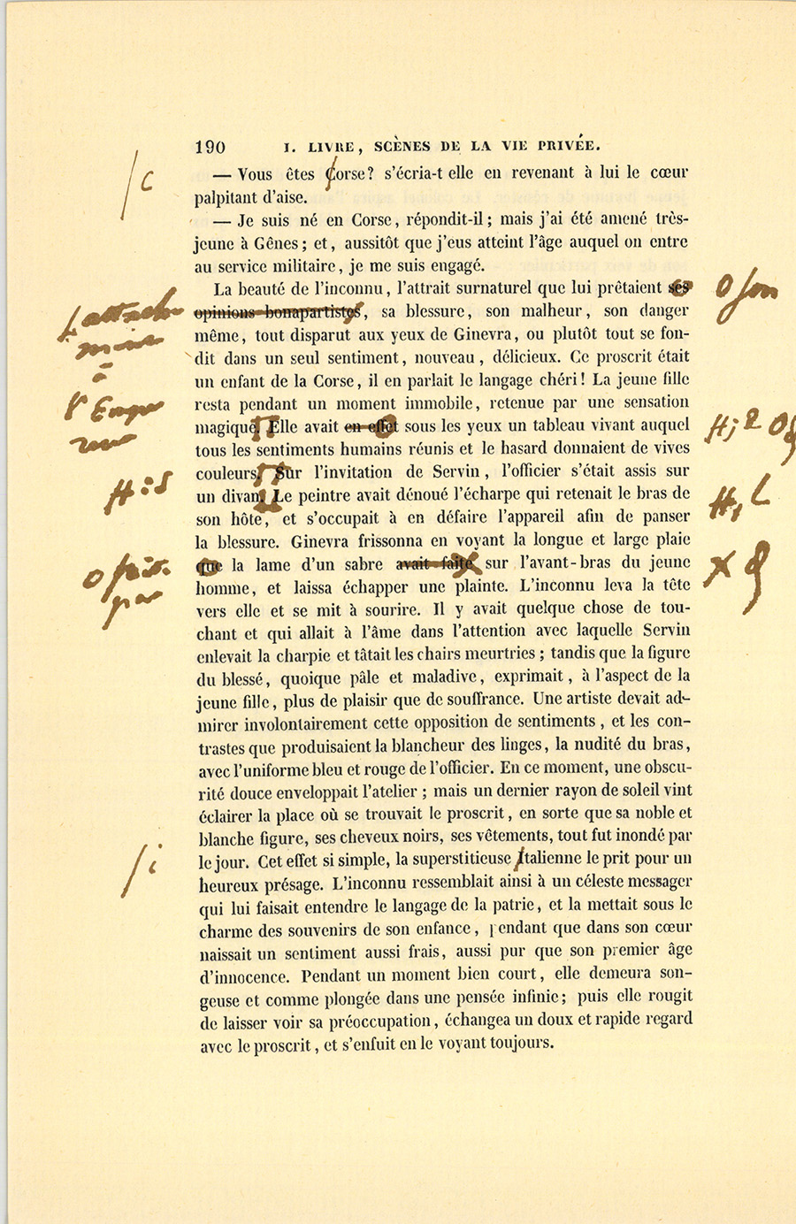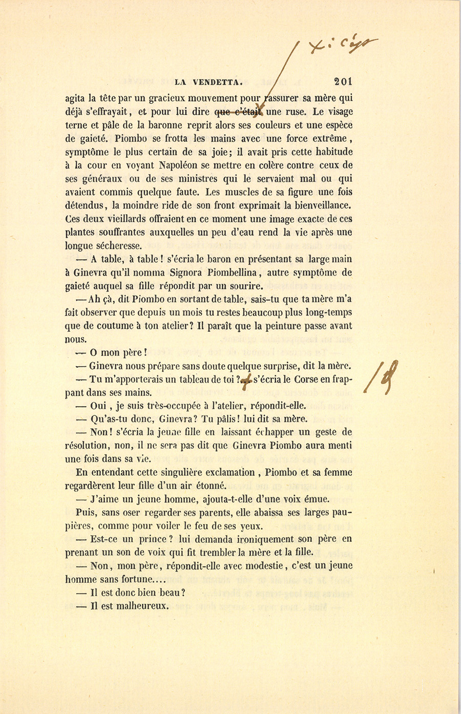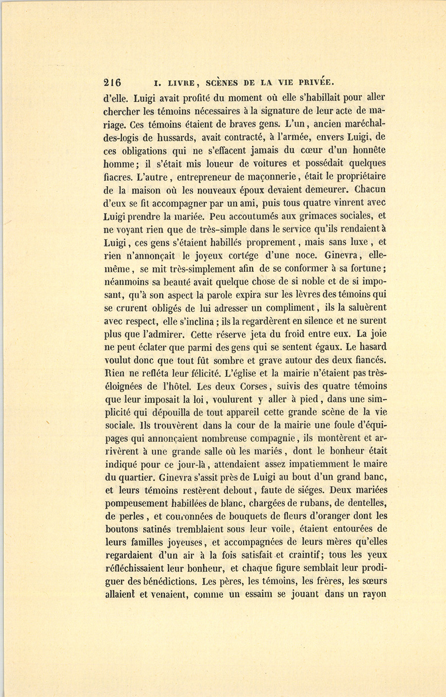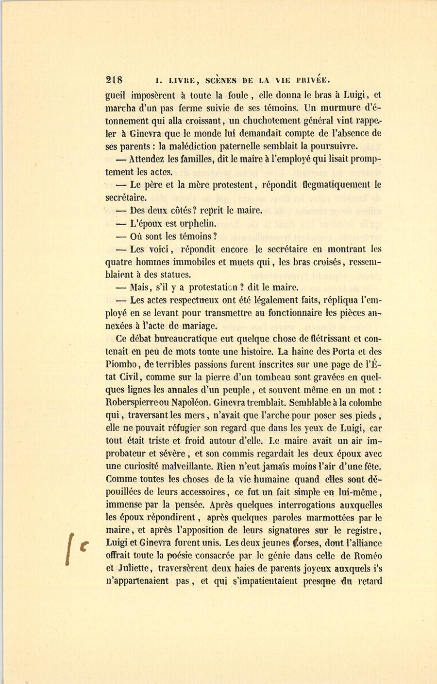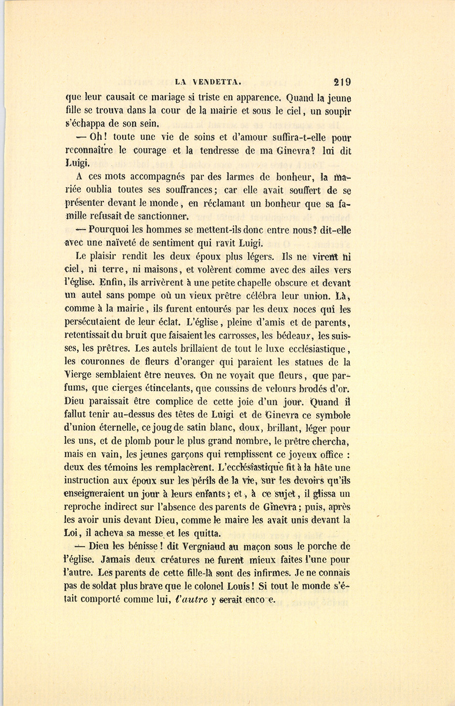 Ce débat bureaucratique eut quelque chose de flétrissant et contenait en peu de mots toute une histoire. La haine des Porta et des Piombo, de terribles passions furent inscrites sur une page de l’État Civil, comme sur la pierre d’un tombeau sont gravées en quelques lignes les annales d’un peuple, et souvent même en un mot : Robespierre 2 ou Napoléon. Ginevra tremblait. Semblable à la colombe qui, traversant les mers, n’avait que l’arche pour poser ses pieds, elle ne pouvait réfugier son regard que dans les yeux de Luigi, car tout était triste et froid autour d’elle. Le maire avait un air improbateur et sévère, et son commis regardait les deux époux avec une curiosité malveillante. Rien n’eut jamais moins l’air d’une fête. Comme toutes les choses de la vie humaine quand elles sont dépouillées de leurs accessoires, ce fut un fait simple en lui-même, immense par la pensée. Après quelques interrogations auxquelles les époux répondirent, après quelques paroles marmottées par le maire, et après l’apposition de leurs signatures sur le registre, Luigi et Ginevra furent unis. Les deux jeunes corses, dont l’alliance offrait toute la poésie consacrée par le génie dans celle de Roméo et Juliette, traversèrent deux haies de parents joyeux auxquels ils n’appartenaient pas, et qui s’impatientaient presque du retard {p. 219} que leur causait ce mariage si triste en apparence. Quand la jeune fille se trouva dans la cour de la mairie et sous le ciel, un soupir s’échappa de son sein.