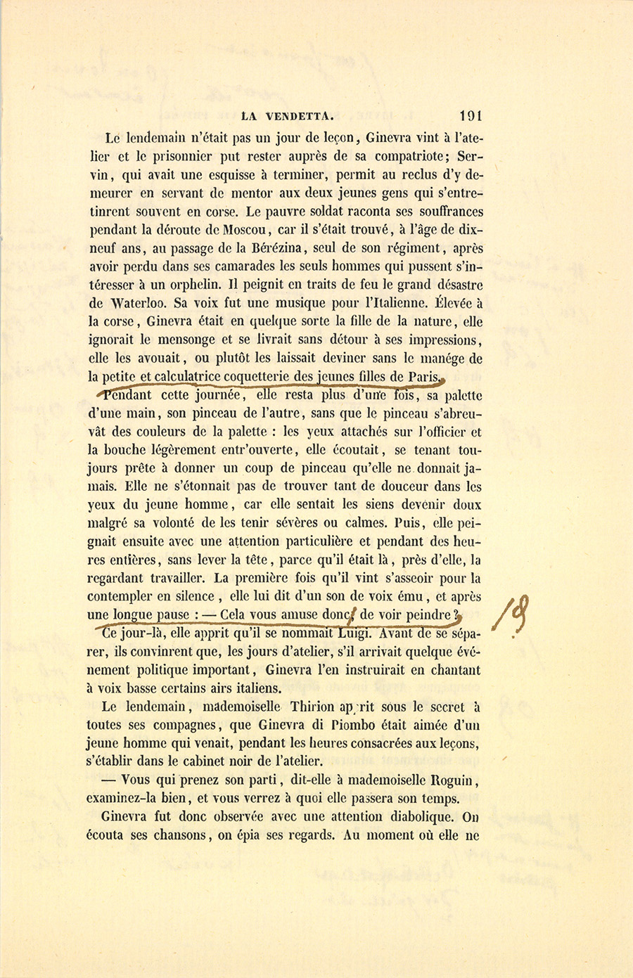 Le maître alla de chevalet en chevalet, grondant, flattant, plaisantant, et faisant, comme toujours, craindre plutôt ses plaisanteries que ses réprimandes. L’italienne n’avait pas obéi aux observations du professeur et restait à son poste avec la ferme intention de ne pas s’en écarter. Elle prit une feuille de papier et se mit à croquer à la sépia la tête du pauvre reclus. [ill.] Une œuvre conçue avec passion porte toujours un cachet particulier. La faculté d’imprimer aux traductions de la nature ou de la pensée des couleurs vraies constitue le génie, et souvent la passion en tient lieu. Aussi, dans la circonstance où se trouvait Ginevra, l’intuition qu’elle devait à sa mémoire vivement frappée, ou la nécessité peut-être, cette mère des grandes choses, lui prêta-t-elle un talent surnaturel. La tête de l’officier fut jetée sur le papier au milieu d’un tressaillement intérieur qu’elle attribuait à la crainte, et dans lequel un physiologiste aurait reconnu la fièvre de l’inspiration. Elle glissait de temps en temps un regard furtif sur ses compagnes, afin de pouvoir cacher le lavis en cas d’indiscrétion de leur part. Malgré son active surveillance, il y eut un moment où elle {p. 185} n’aperçut pas le lorgnon que son impitoyable ennemie braquait sur le mystérieux dessin en s’abritant derrière un grand portefeuille. Mademoiselle Thirion, qui reconnut la figure du proscrit, leva brusquement la tête, et Ginevra serra la feuille de papier.