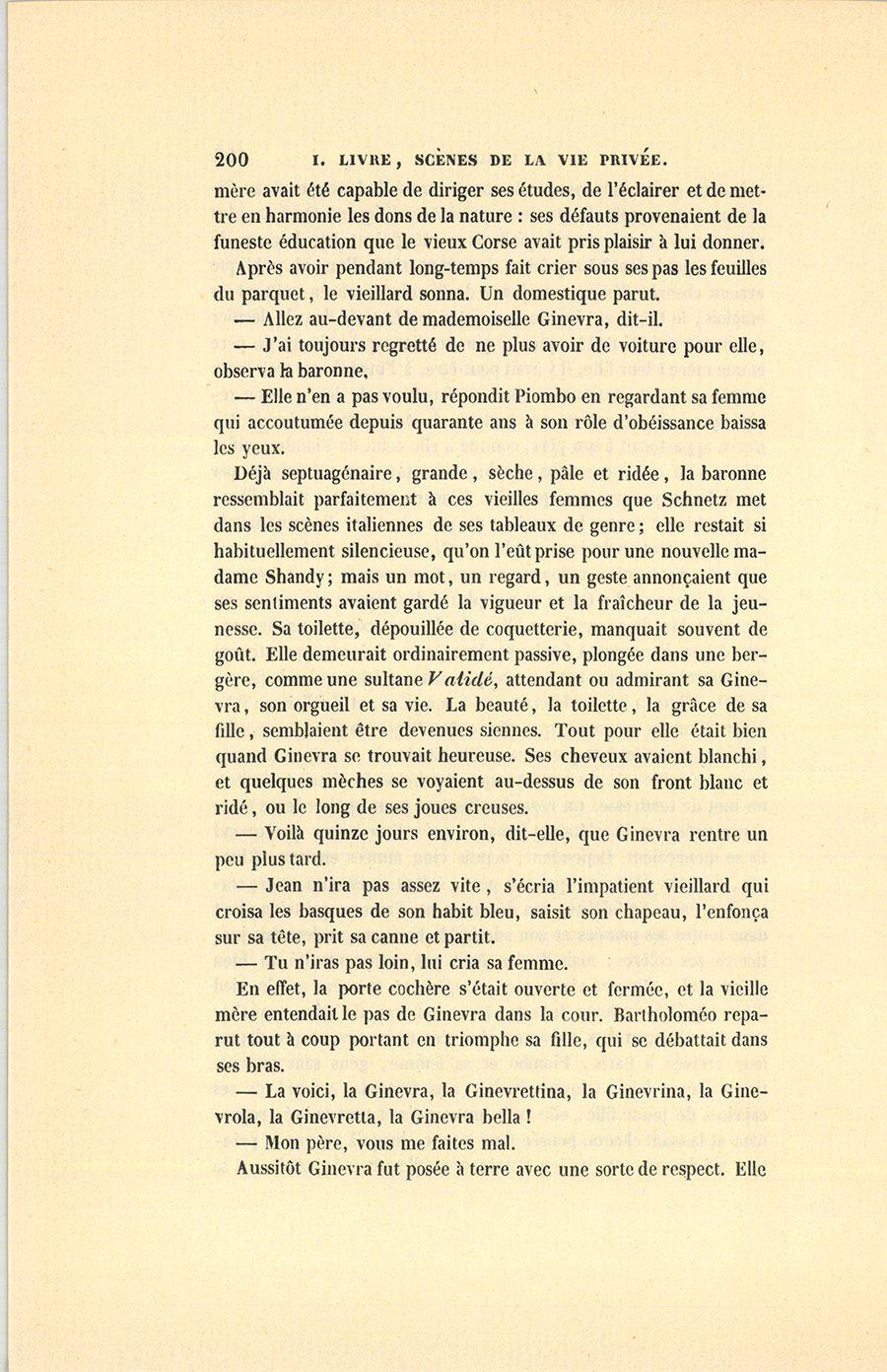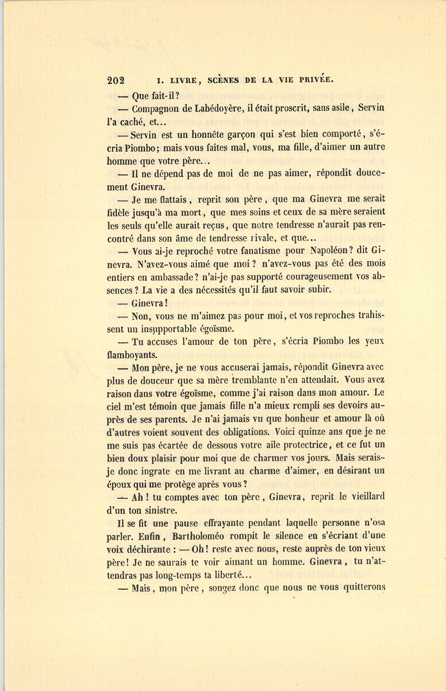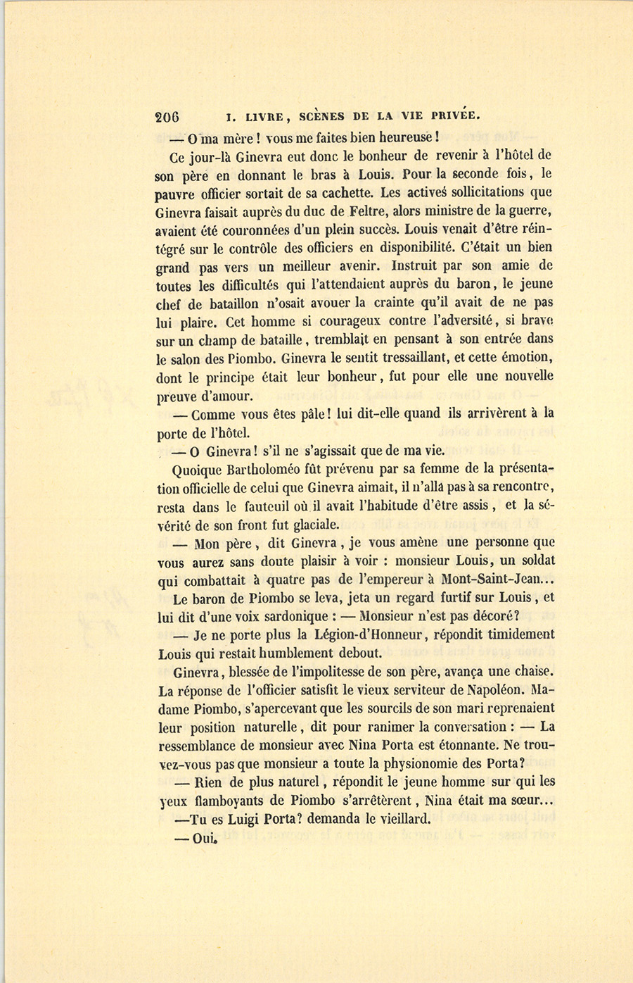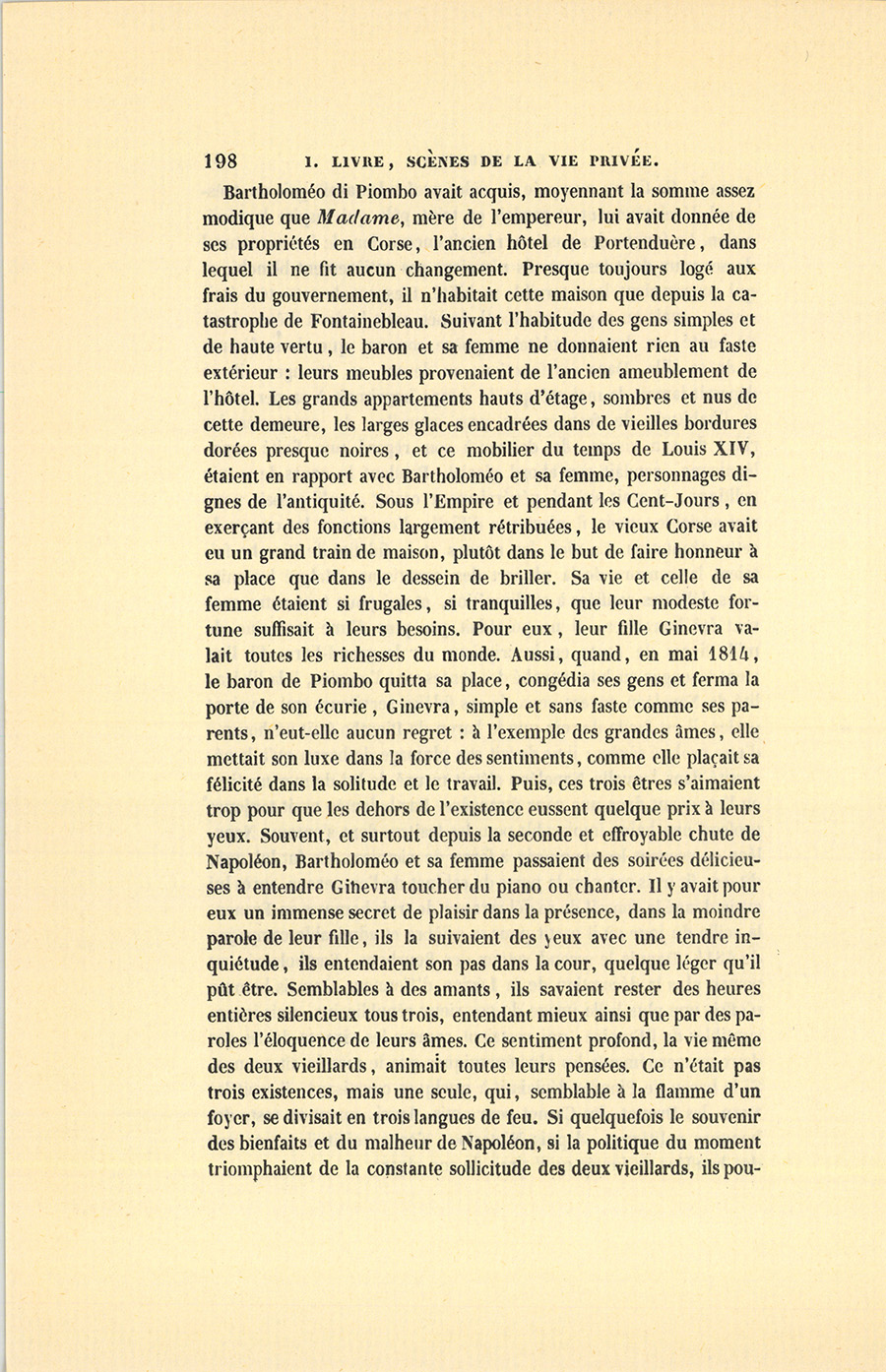 Ces réflexions agitèrent successivement le cœur d’Élisa Piombo. Pendant un instant la physionomie de son mari devint si terrible, qu’elle trembla d’avoir osé employer une ruse si simple pour faire naître l’occasion de parler de Ginevra. En ce moment, la bise chassa si violemment les flocons de neige sur les persiennes, que les deux vieillards purent en entendre le léger bruissement. La mère de Ginevra baissa la tête pour dérober ses larmes à son mari. Tout à coup un soupir sortit de la poitrine du vieillard, sa femme le regarda, il était abattu ; elle hasarda pour la seconde fois, depuis trois ans, à lui parler de sa fille.