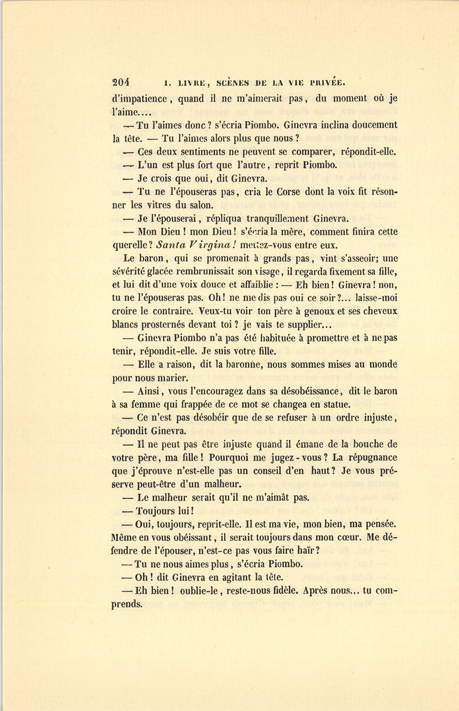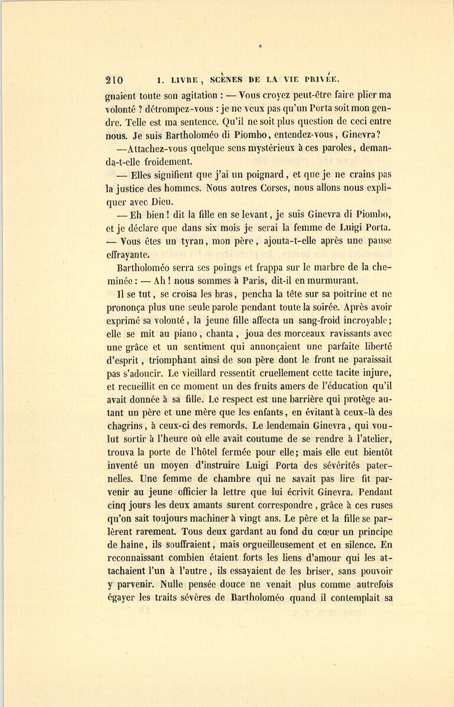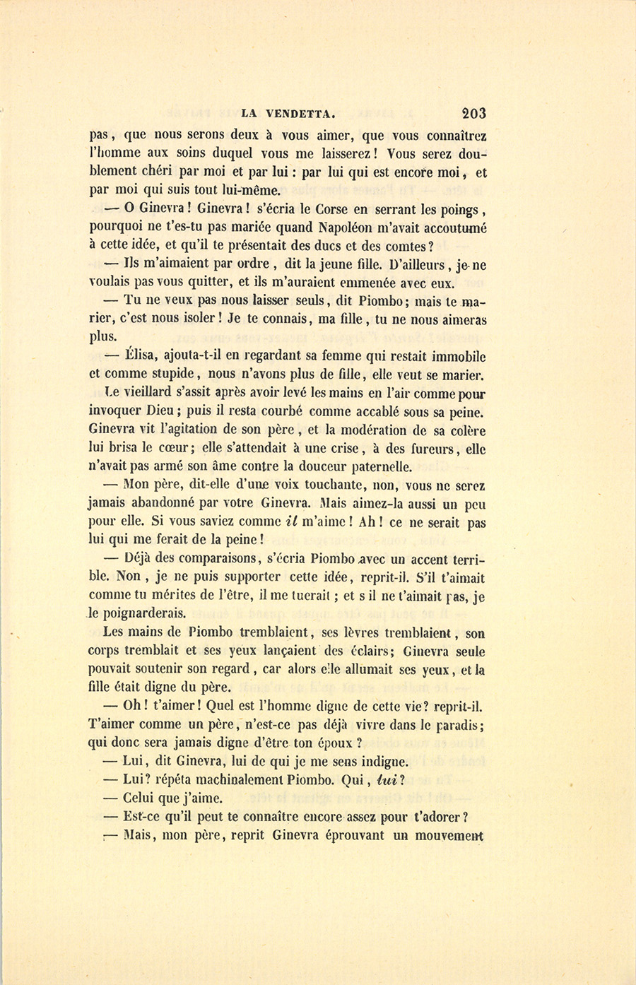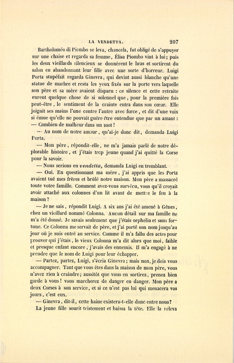 – Fuis, dit-il. La Luigi Porta ne saurait être une Piombo. Je n’ai plus de fille ! Je n’ai pas la force de te maudire ; mais je t’abandonne, et tu n’as plus de père. Ma Ginevra Piombo est enterrée là, s’écria-t-il d’un son de voix profond en se pressant fortement le cœur. – Sors donc, malheureuse, ajouta-t-il après un moment de silence, sors, et ne reparais plus devant moi. Puis, il prit Ginevra par le bras, et la conduisit silencieusement hors de la maison.