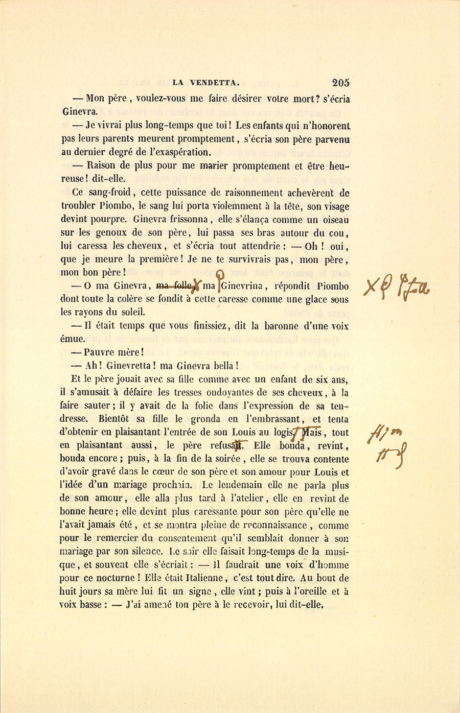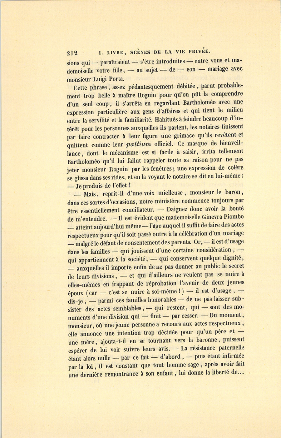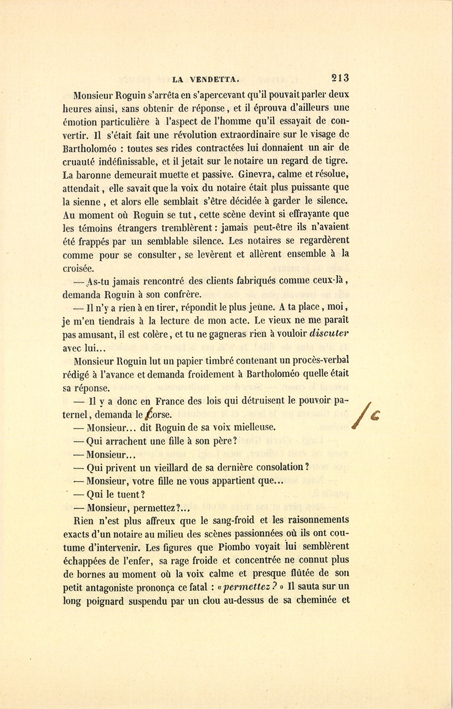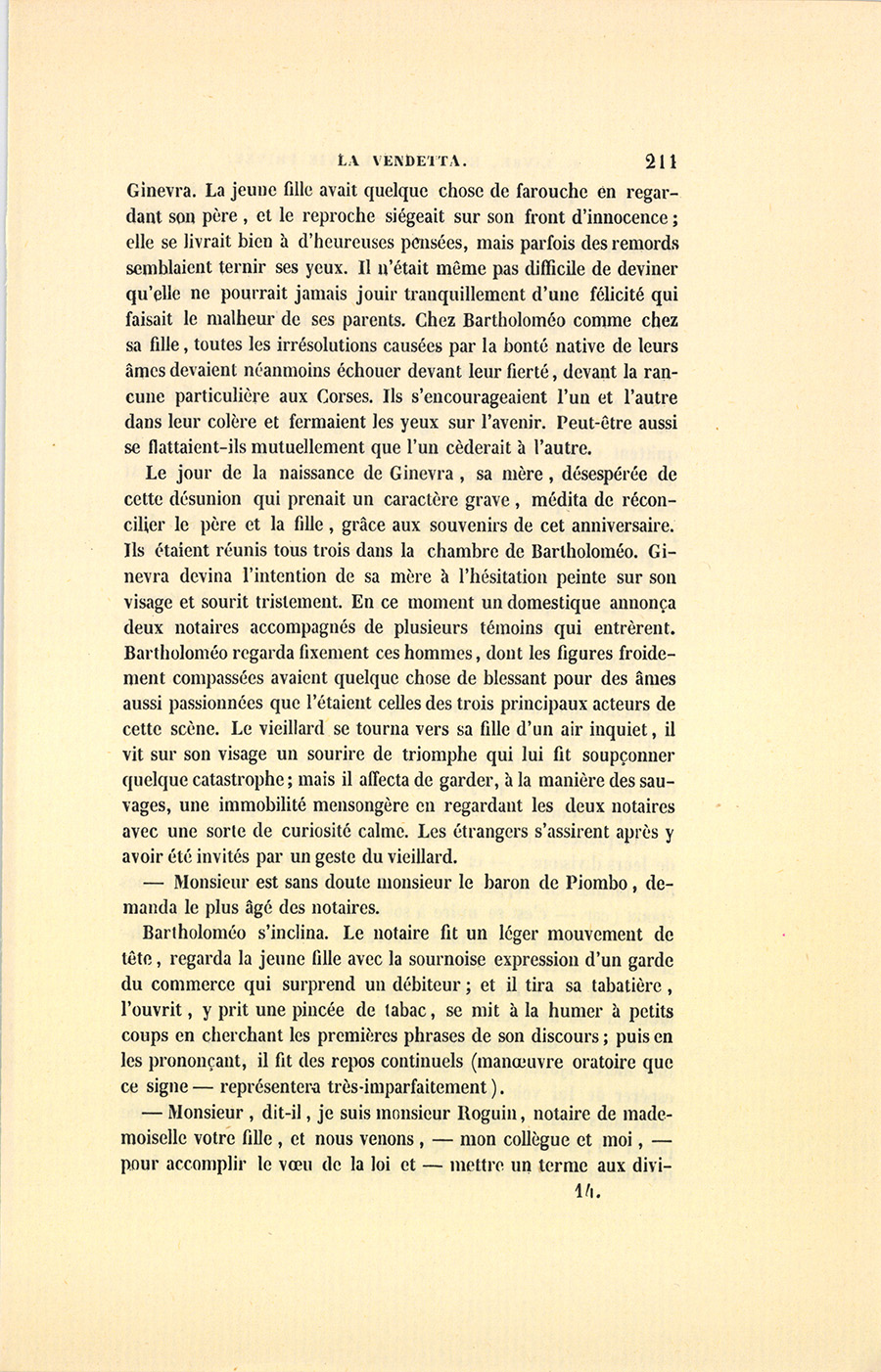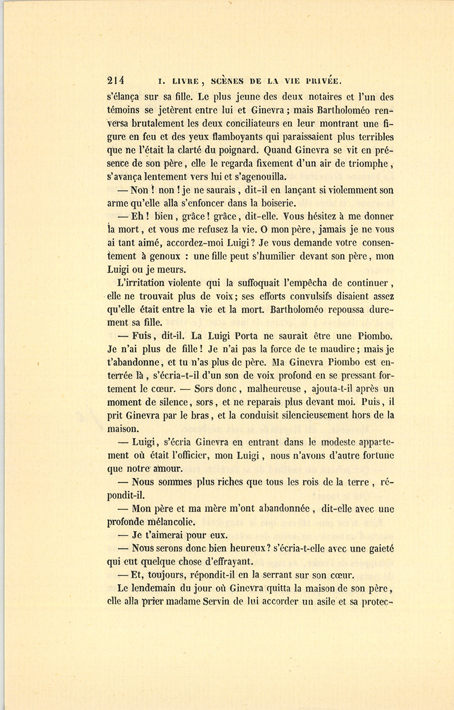 Rien n’est plus affreux que le sang-froid et les raisonnements exacts d’un notaire au milieu des scènes passionnées où ils ont coutume d’intervenir. Les figures que Piombo voyait lui semblèrent échappées de l’enfer, sa rage froide et concentrée ne connut plus de bornes au moment où la voix calme et presque flûtée de son petit antagoniste prononça ce fatal : « permettez ? » Il sauta sur un long poignard suspendu par un clou au-dessus de sa cheminée et {p. 214} s’élança sur sa fille. Le plus jeune des deux notaires et l’un des témoins se jetèrent entre lui et Ginevra ; mais Bartholoméo renversa brutalement les deux conciliateurs en leur montrant une figure en feu et des yeux flamboyants qui paraissaient plus terribles que ne l’était la clarté du poignard. Quand Ginevra se vit en présence de son père, elle le regarda fixement d’un air de triomphe, s’avança lentement vers lui et s’agenouilla.