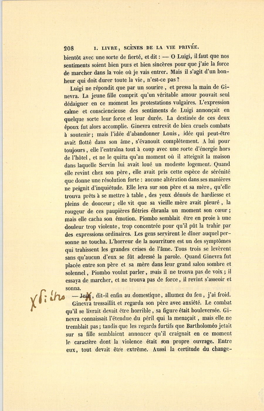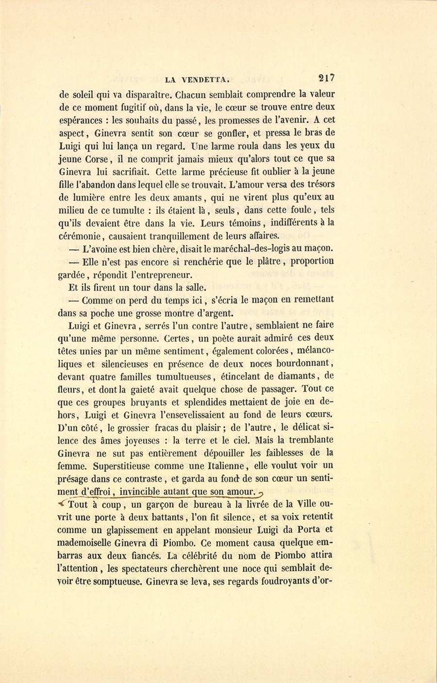 Luigi et Ginevra, serrés l’un contre l’autre, semblaient ne faire qu’une même personne. Certes, un poète aurait admiré ces deux têtes unies par un même sentiment, également colorées, mélancoliques et silencieuses en présence de deux noces bourdonnant, devant quatre familles tumultueuses, étincelant de diamants, de fleurs, et dont la gaieté avait quelque chose de passager. Tout ce que ces groupes bruyants et splendides mettaient de joie en dehors, Luigi et Ginevra l’ensevelissaient au fond de leurs cœurs. D’un côté, le grossier fracas du plaisir ; de l’autre, le délicat silence des âmes joyeuses : la terre et le ciel. Mais la tremblante Ginevra ne sut pas entièrement dépouiller les faiblesses de la femme. Superstitieuse comme une Italienne, elle voulut voir un présage dans ce contraste, et garda au fond de son cœur un sentiment d’effroi, invincible autant que son amour. Tout à coup, un garçon de bureau à la livrée de la Ville ouvrit une porte à deux battants, l’on fit silence, et sa voix retentit comme un glapissement en appelant monsieur Luigi da Porta et mademoiselle Ginevra di Piombo. Ce moment causa quelque embarras aux deux fiancés. La célébrité du nom de Piombo attira l’attention, les spectateurs cherchèrent une noce qui semblait devoir être somptueuse. Ginevra se leva, ses regards foudroyants {p. 218} d’orgueil imposèrent à toute la foule, elle donna le bras à Luigi, et marcha d’un pas ferme suivie de ses témoins. Un murmure d’étonnement qui alla croissant, un chuchotement général vint rappeler à Ginevra que le monde lui demandait compte de l’absence de ses parents : la malédiction paternelle semblait la poursuivre.