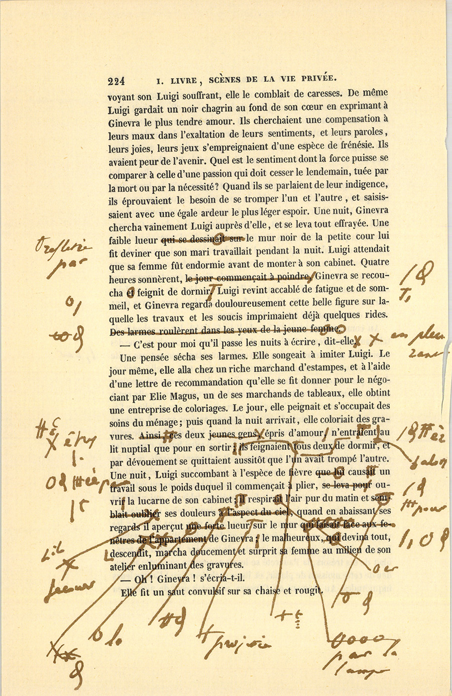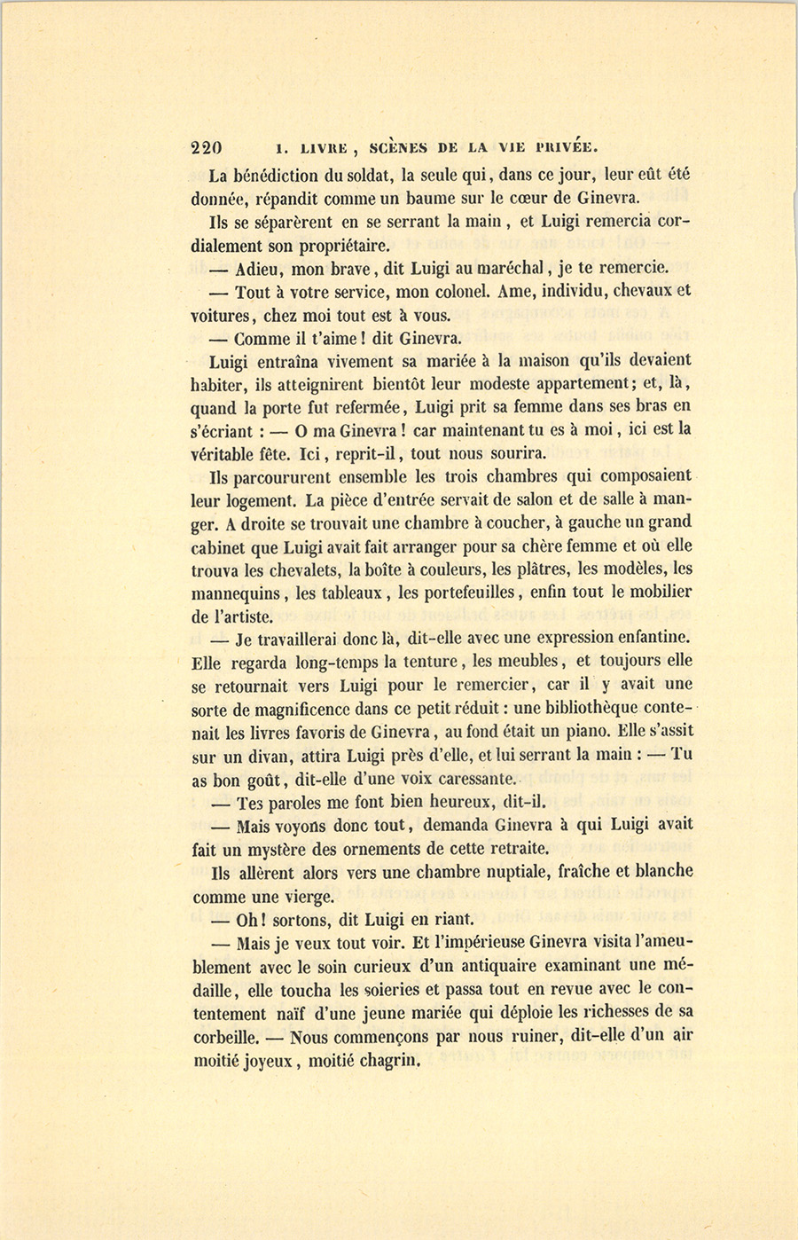 Une pensée sécha ses larmes. Elle songeait à imiter Luigi. Le jour même, elle alla chez un riche marchand d’estampes, et à l’aide d’une lettre de recommandation qu’elle se fit donner pour le négociant par Élie Magus, un de ses marchands de tableaux, elle obtint une entreprise de coloriages. Le jour, elle peignait et s’occupait des soins du ménage ; puis quand la nuit arrivait, elle coloriait des gravures. Ces deux êtres épris d’amour n’entrèrent alors au lit nuptial que pour en sortir. Tous deux ils feignaient de dormir, et par dévouement se quittaient aussitôt que l’un avait trompé l’autre. Une nuit, Luigi succombant à l’espèce de fièvre causée par un travail sous le poids duquel il commençait à plier, ouvrit la lucarne de son cabinet pour respirer l’air pur du matin et secouer ses douleurs ; quand en abaissant ses regards il aperçut la lueur projetée sur le mur par la lampe de Ginevra, le malheureux devina tout, il descendit, marcha doucement et surprit sa femme au milieu de son atelier enluminant des gravures.