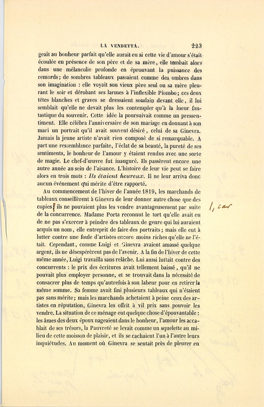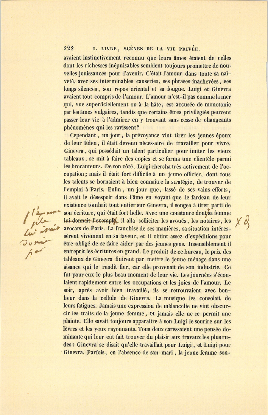 Au commencement de l’hiver de l’année 1819, les marchands de tableaux conseillèrent à Ginevra de leur donner autre chose que des copies, car ils ne pouvaient plus les vendre avantageusement par suite de la concurrence. Madame Porta reconnut le tort qu’elle avait eu de ne pas s’exercer à peindre des tableaux de genre qui lui auraient acquis un nom, elle entreprit de faire des portraits ; mais elle eut à lutter contre une foule d’artistes encore moins riches qu’elle ne l’était. Cependant, comme Luigi et Ginevra avaient amassé quelque argent, ils ne désespérèrent pas de l’avenir. À la fin de l’hiver de cette même année, Luigi travailla sans relâche. Lui aussi luttait contre des concurrents : le prix des écritures avait tellement baissé, qu’il ne pouvait plus employer personne, et se trouvait dans la nécessité de consacrer plus de temps qu’autrefois à son labeur pour en retirer la même somme. Sa femme avait fini plusieurs tableaux qui n’étaient pas sans mérite ; mais les marchands achetaient à peine ceux des artistes en réputation, Ginevra les offrit à vil prix sans pouvoir les vendre. La situation de ce ménage eut quelque chose d’épouvantable : les âmes des deux époux nageaient dans le bonheur, l’amour les accablait de ses trésors, la Pauvreté se levait comme un squelette au milieu de cette moisson de plaisir, et ils se cachaient l’un à l’autre leurs inquiétudes. Au moment où Ginevra se sentait près de pleurer en {p. 224} voyant son Luigi souffrant, elle le comblait de caresses. De même Luigi gardait un noir chagrin au fond de son cœur en exprimant à Ginevra le plus tendre amour. Ils cherchaient une compensation à leurs maux dans l’exaltation de leurs sentiments, et leurs paroles, leurs joies, leurs jeux s’empreignaient d’une espèce de frénésie. Ils avaient peur de l’avenir. Quel est le sentiment dont la force puisse se comparer à celle d’une passion qui doit cesser le lendemain, tuée par la mort ou par la nécessité ? Quand ils se parlaient de leur indigence, ils éprouvaient le besoin de se tromper l’un et l’autre, et saisissaient avec une égale ardeur le plus léger espoir. Une nuit, Ginevra chercha vainement Luigi auprès d’elle, et se leva tout effrayée. Une faible lueur reflétée par le mur noir de la petite cour lui fit deviner que son mari travaillait pendant la nuit. Luigi attendait que sa femme fût endormie avant de monter à son cabinet. Quatre heures sonnèrent, Ginevra se recoucha, feignit de dormir, Luigi revint accablé de fatigue et de sommeil, et Ginevra regarda douloureusement cette belle figure sur laquelle les travaux et les soucis imprimaient déjà quelques rides.