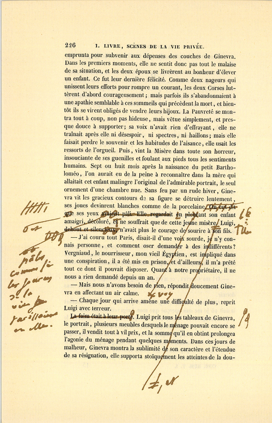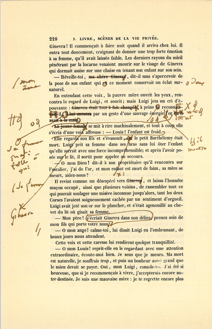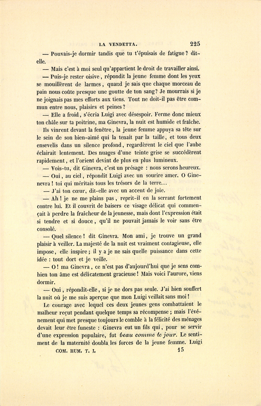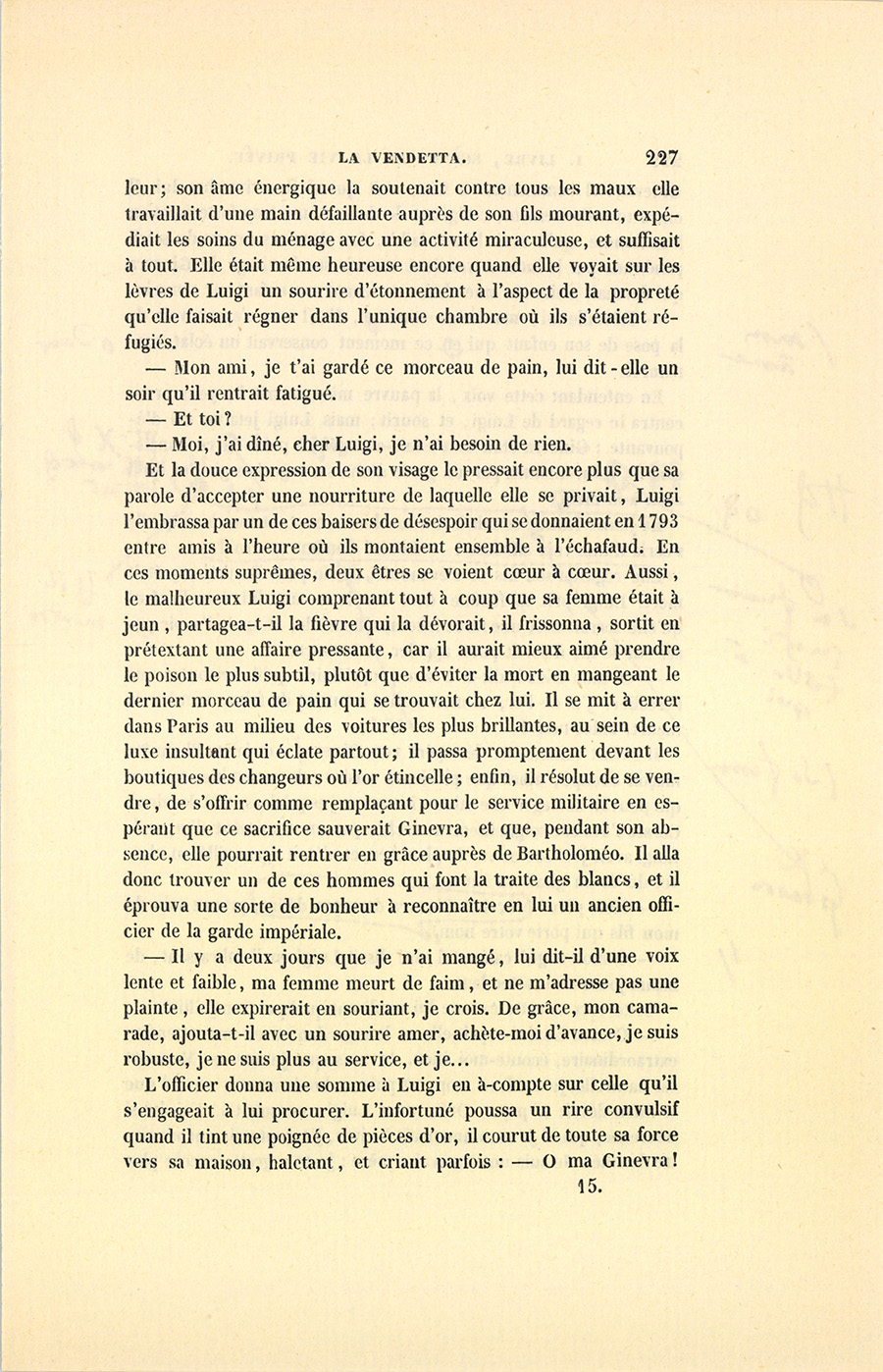 Le courage avec lequel ces deux jeunes gens combattaient le malheur reçut pendant quelque temps sa récompense ; mais l’événement qui met presque toujours le comble à la félicité des ménages devait leur être funeste : Ginevra eut un fils qui, pour se servir d’une expression populaire, fut beau comme le jour. Le sentiment de la maternité doubla les forces de la jeune femme. Luigi {p. 226} emprunta pour subvenir aux dépenses des couches de Ginevra. Dans les premiers moments, elle ne sentit donc pas tout le malaise de sa situation, et les deux époux se livrèrent au bonheur d’élever un enfant. Ce fut leur dernière félicité. Comme deux nageurs qui unissent leurs efforts pour rompre un courant, les deux Corses luttèrent d’abord courageusement ; mais parfois ils s’abandonnaient à une apathie semblable à ces sommeils qui précèdent la mort, et bientôt ils se virent obligés de vendre leurs bijoux. La Pauvreté se montra tout à coup, non pas hideuse, mais vêtue simplement, et presque douce à supporter ; sa voix n’avait rien d’effrayant, elle ne traînait après elle ni désespoir, ni spectres, ni haillons ; mais elle faisait perdre le souvenir et les habitudes de l’aisance, elle usait les ressorts de l’orgueil. Puis, vint la Misère dans toute son horreur, insouciante de ses guenilles et foulant aux pieds tous les sentiments humains. Sept ou huit mois après la naissance du petit Bartholoméo, l’on aurait eu de la peine à reconnaître dans la mère qui allaitait cet enfant malingre l’original de l’admirable portrait, le seul ornement d’une chambre nue. Sans feu par un rude hiver, Ginevra vit les gracieux contours de sa figure se détruire lentement, ses joues devinrent blanches comme de la porcelaine et ses yeux pâles comme si les sources de la vie tarissaient en elle. En voyant son enfant amaigri, décoloré, elle ne souffrait que de cette jeune misère, et Luigi n’avait plus le courage de sourire à son fils.