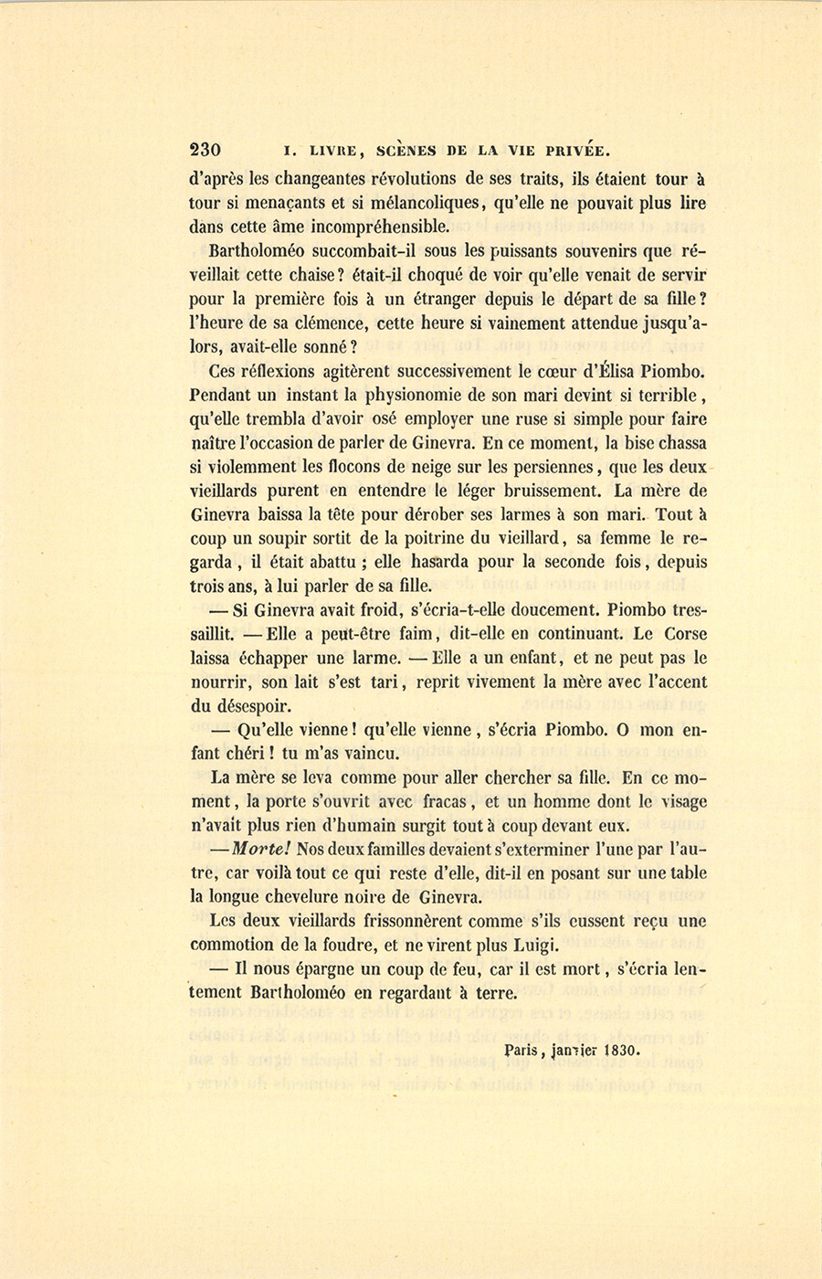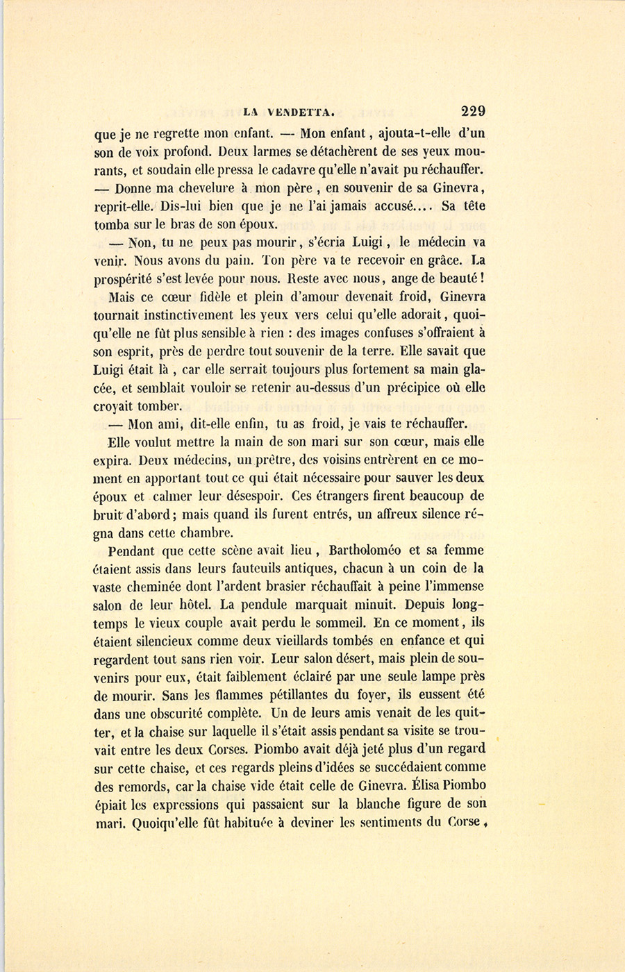 Pendant que cette scène avait lieu, Bartholoméo et sa femme étaient assis dans leurs fauteuils antiques, chacun à un coin de la vaste cheminée dont l’ardent brasier réchauffait à peine l’immense salon de leur hôtel. La pendule marquait minuit. Depuis long-temps le vieux couple avait perdu le sommeil. En ce moment, ils étaient silencieux comme deux vieillards tombés en enfance et qui regardent tout sans rien voir. Leur salon désert, mais plein de souvenirs pour eux, était faiblement éclairé par une seule lampe près de mourir. Sans les flammes pétillantes du foyer, ils eussent été dans une obscurité complète. Un de leurs amis venait de les quitter, et la chaise sur laquelle il s’était assis pendant sa visite se trouvait entre les deux Corses. Piombo avait déjà jeté plus d’un regard sur cette chaise, et ces regards pleins d’idées se succédaient comme des remords, car la chaise vide était celle de Ginevra. Élisa Piombo épiait les expressions qui passaient sur la blanche figure de son mari. Quoiqu’elle fût habituée à deviner les sentiments du Corse, {p. 230} d’après les changeantes révolutions de ses traits, ils étaient tour à tour si menaçants et si mélancoliques, qu’elle ne pouvait plus lire dans cette âme incompréhensible.