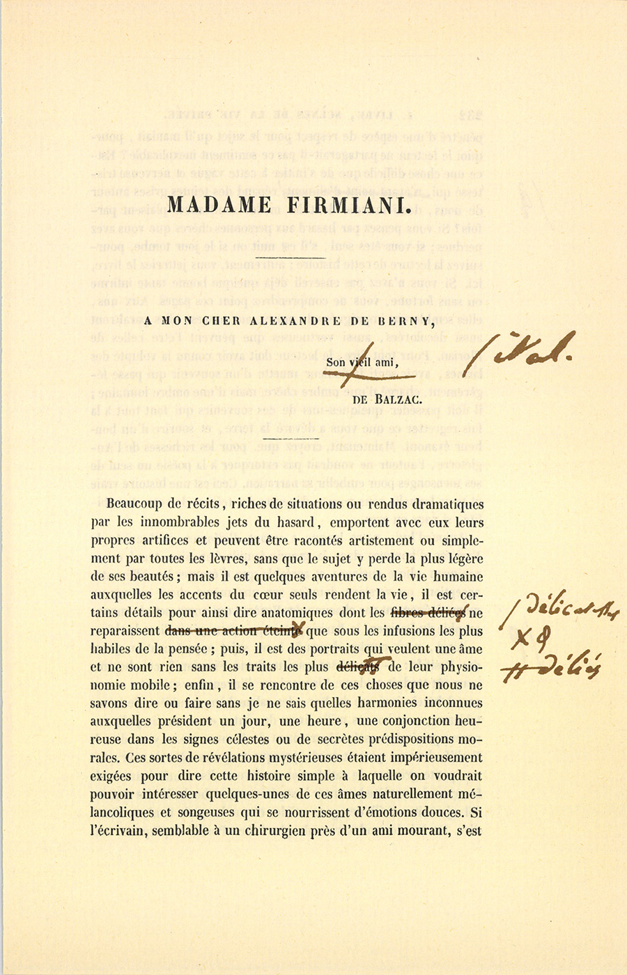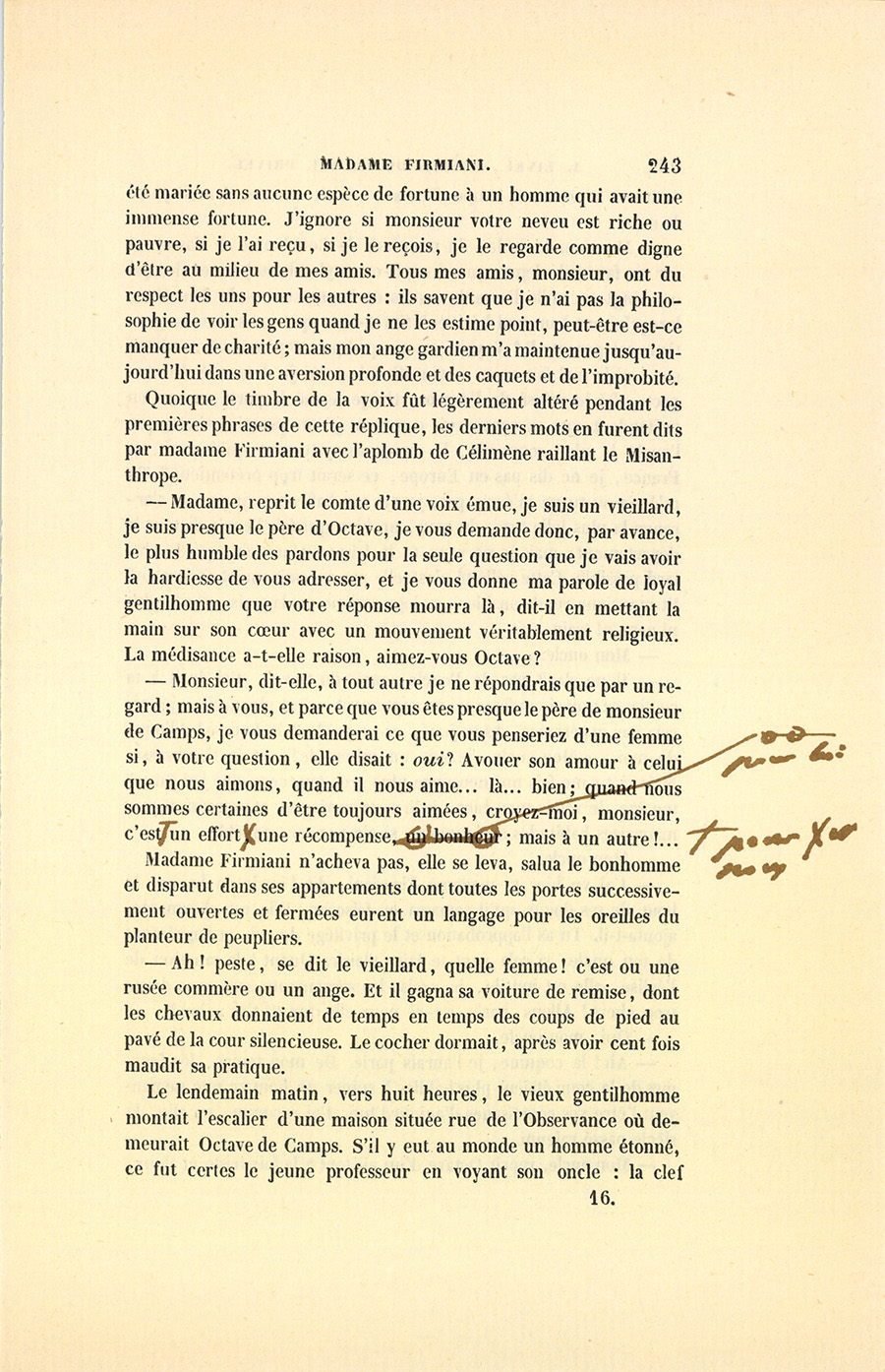Quoique le timbre de la voix fût légèrement altéré pendant les premières phrases de cette réplique, les derniers mots en furent dits par madame Firmiani avec l’aplomb de Célimène raillant le Misanthrope.