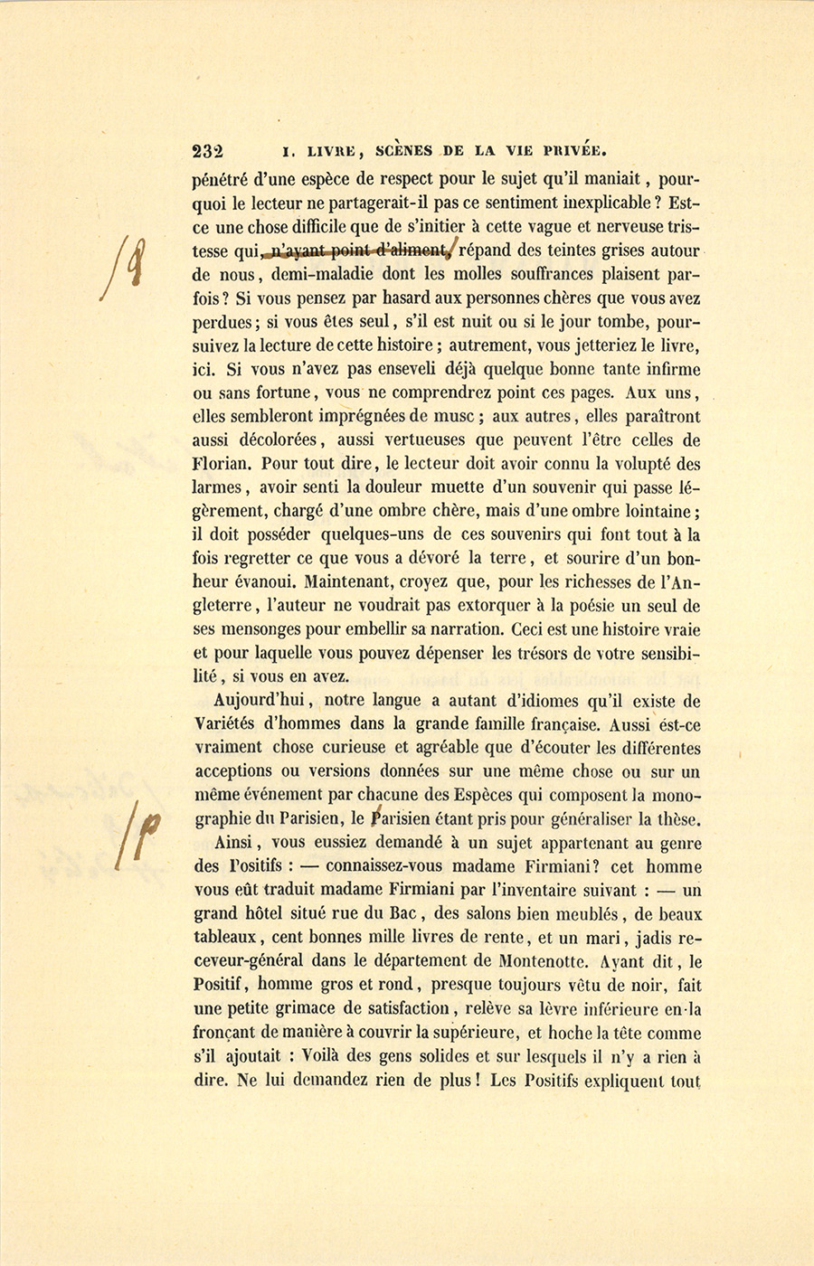 Ainsi, vous eussiez demandé à un sujet appartenant au genre des Positifs : – connaissez-vous madame Firmiani ? cet homme vous eût traduit madame Firmiani par l’inventaire suivant : – un grand hôtel situé rue du Bac, des salons bien meublés, de beaux tableaux, cent bonnes mille livres de rente, et un mari, jadis receveur-général dans le département de Montenotte. Ayant dit, le Positif, homme gros et rond, presque toujours vêtu de noir, fait une petite grimace de satisfaction, relève sa lèvre inférieure en la fronçant de manière à couvrir la supérieure, et hoche la tête comme s’il ajoutait : Voilà des gens solides et sur lesquels il n’y a rien à dire. Ne lui demandez rien de plus ! Les Positifs expliquent tout {p. 233} par des chiffres, par des rentes ou par les biens au soleil, un mot de leur lexique.