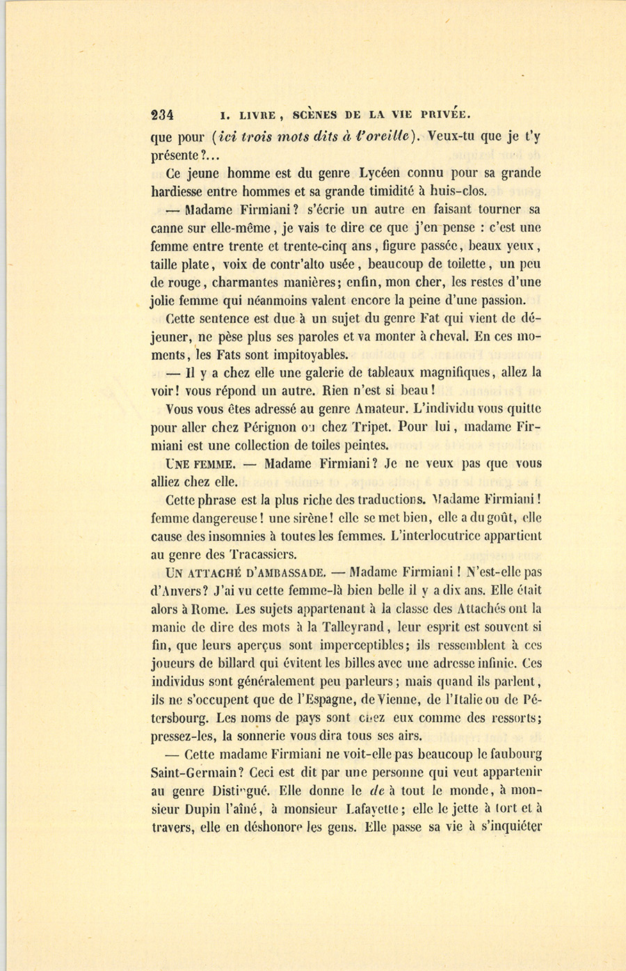 Vieillard appartenant au genre des Observateurs. – Vous irez chez madame Firmiani, vous trouverez, mon cher, une belle femme nonchalamment assise au coin de sa cheminée. À peine se lèvera-t-elle de son fauteuil, elle ne le quitte que pour les femmes ou les ambassadeurs, les ducs, les gens considérables. Elle est fort gracieuse, elle charme, elle cause bien et veut causer de tout. Il y a chez elle tous les indices de la passion, mais on lui donne trop d’adorateurs pour qu’elle ait un favori. Si les soupçons ne planaient que sur deux ou trois de ses intimes, nous saurions quel est son cavalier servant ; mais c’est une femme tout mystère : elle est mariée, et jamais nous n’avons vu son mari ; monsieur Firmiani est un personnage tout à fait fantastique, il ressemble à ce troisième cheval que l’on paie toujours en courant la poste et qu’on n’aperçoit jamais ; madame, à entendre les artistes, est le premier Contr’alto d’Europe et n’a pas chanté trois fois depuis qu’elle est à Paris ; elle reçoit beaucoup de monde et ne va chez personne.